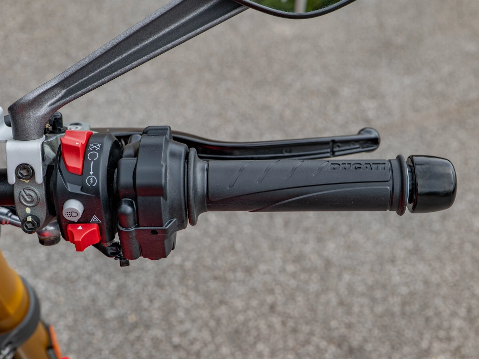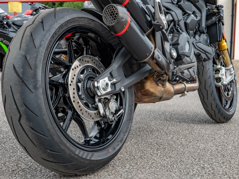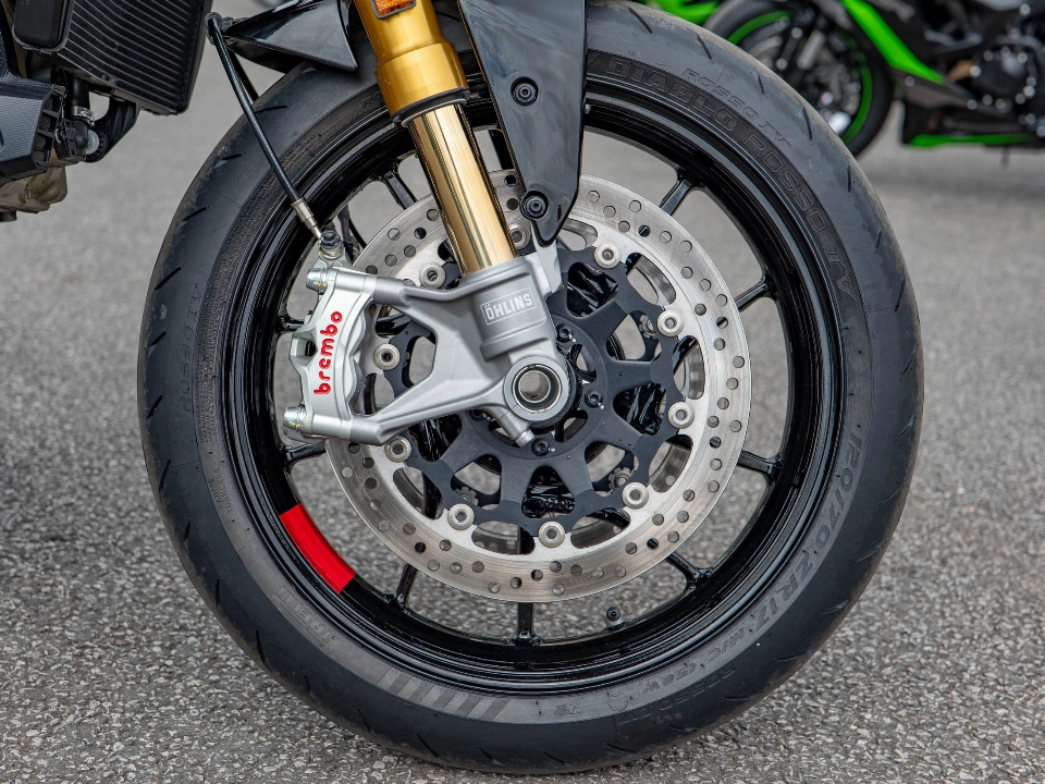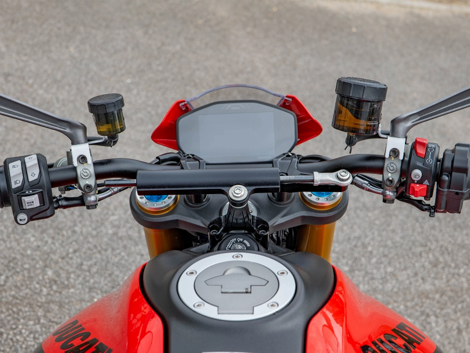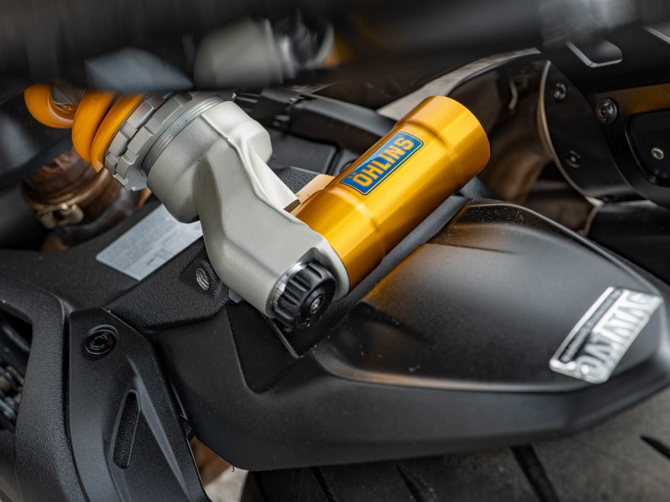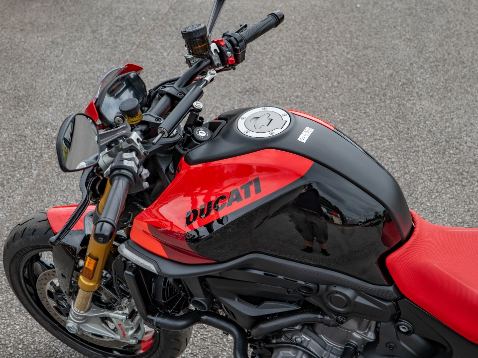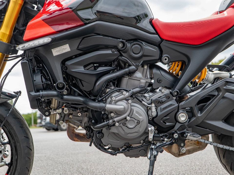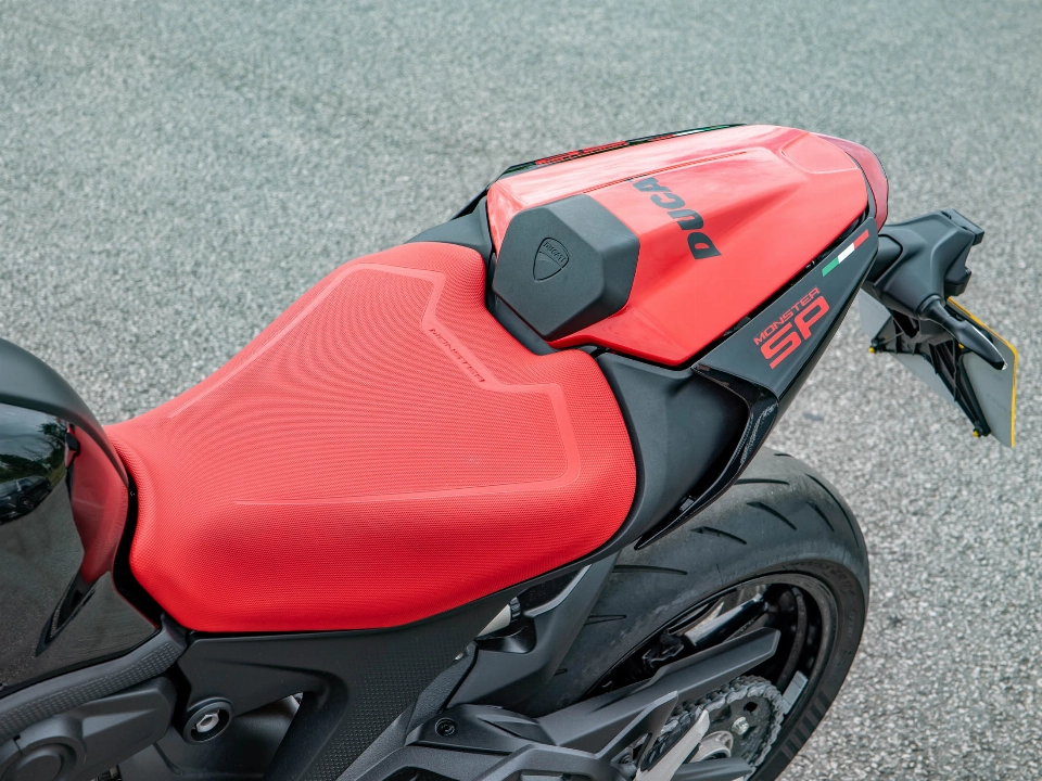 The Monster SP is powered by the spirited 937cc Testastretta 11° V2 engine, which delivers a strong 111 hp through a six-speed manual transmission. The 'SP' designation immediately identifies this machine by its premium running gear, specifically the lightweight, fully adjustable Öhlins NIX 30 front forks and Öhlins rear monoshock. This high-end suspension setup provides superior handling, reduced weight, and cornering confidence compared to the standard Monster, truly elevating the ride experience.