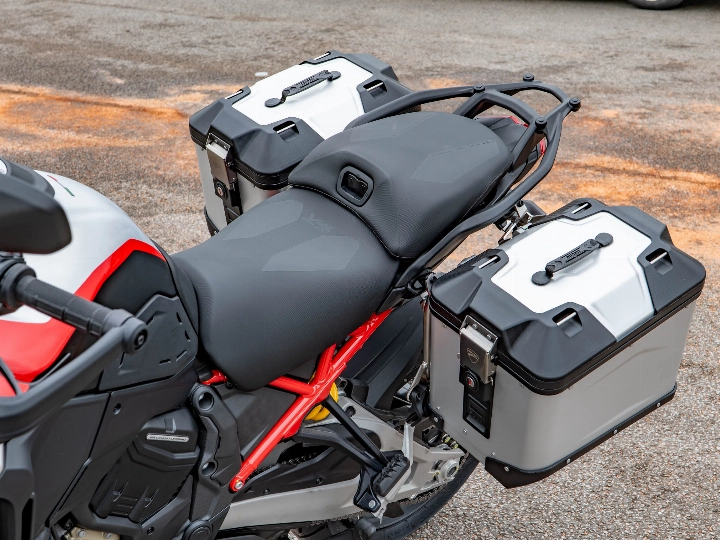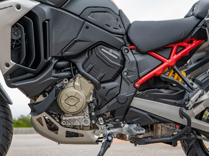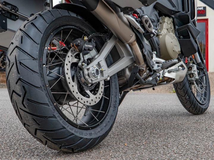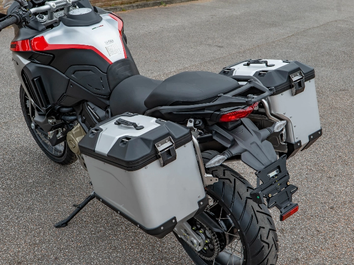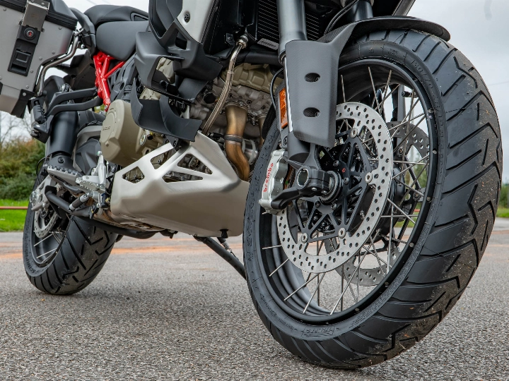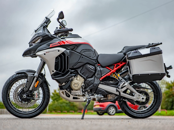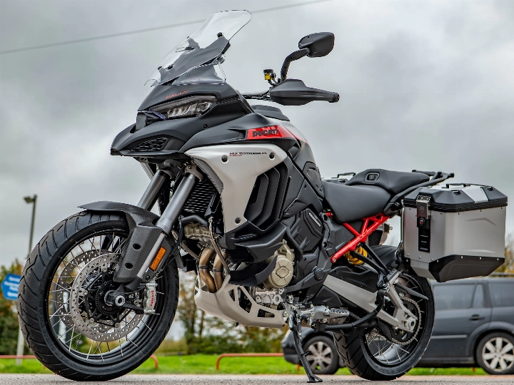 At the heart of the Multistrada V4 Rally is the formidable 1,158cc V4 Granturismo engine, which produces an exhilarating 170 HP (125 kW) at 10,750 rpm. This engine is renowned for its counter-rotating crankshaft, which enhances agility, and its exceptional service intervals, with valve clearance checks only required every 40,000 miles, making it perfect for high-mileage touring. The Rally model significantly enhances its long-distance capability with a huge 30-litre fuel tank and the sophisticated, long-travel (200mm) Marzocchi Ducati Skyhook Suspension (DSS) EVO semi-active electronic suspension, which includes Auto-levelling and the innovative Automatic Lowering Device to aid in low-speed manoeuvring. This bike is also fitted with spoked wheels.