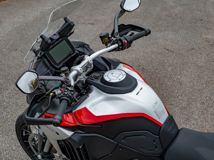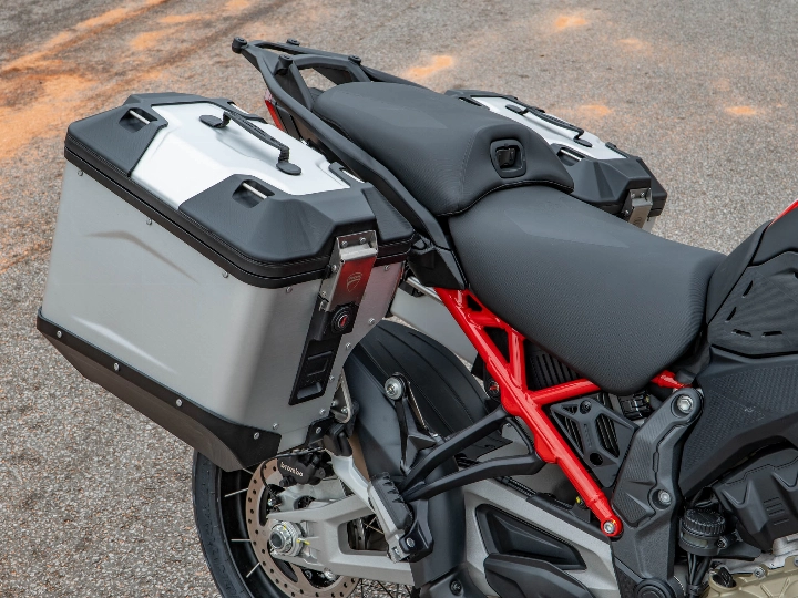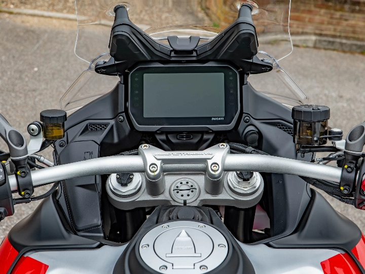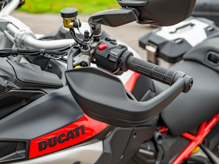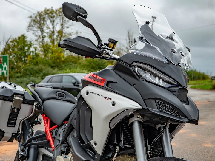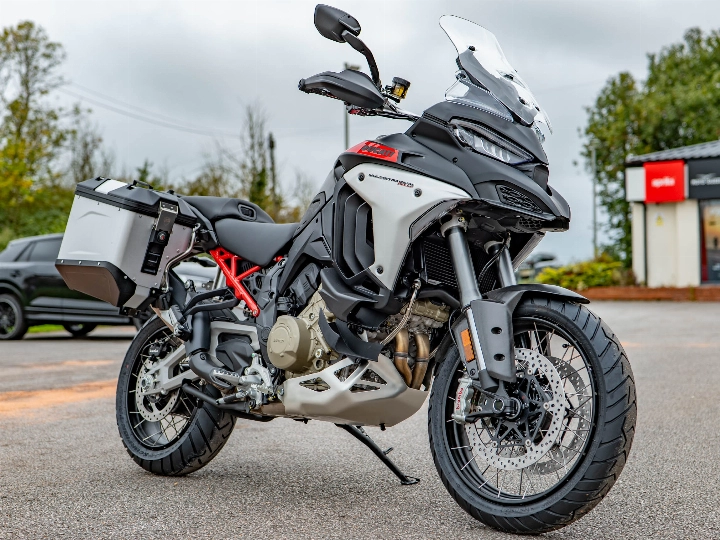 The specification on this Rally model is breathtaking, including a full complement of electronics managed by the Bosch IMU. This specific bike is equipped with the key touring features: Panniers (aluminium side cases), Heated Grips, Heated Rider and Passenger Seats (standard on the Rally), and the full Radar System. The Radar system enables both Adaptive Cruise Control (ACC) and Blind Spot Detection (BSD), taking rider comfort and safety to an unparalleled level on the motorway. Further convenience is provided by the Quickshifter (DQS up/down), Keyless Ride, Centre Stand, and a high-resolution 6.5-inch TFT colour display with integrated full-map navigation via Ducati Connect. This pre-reg model is the ultimate, fully equipped adventure tourer, ready to explore the world right now.