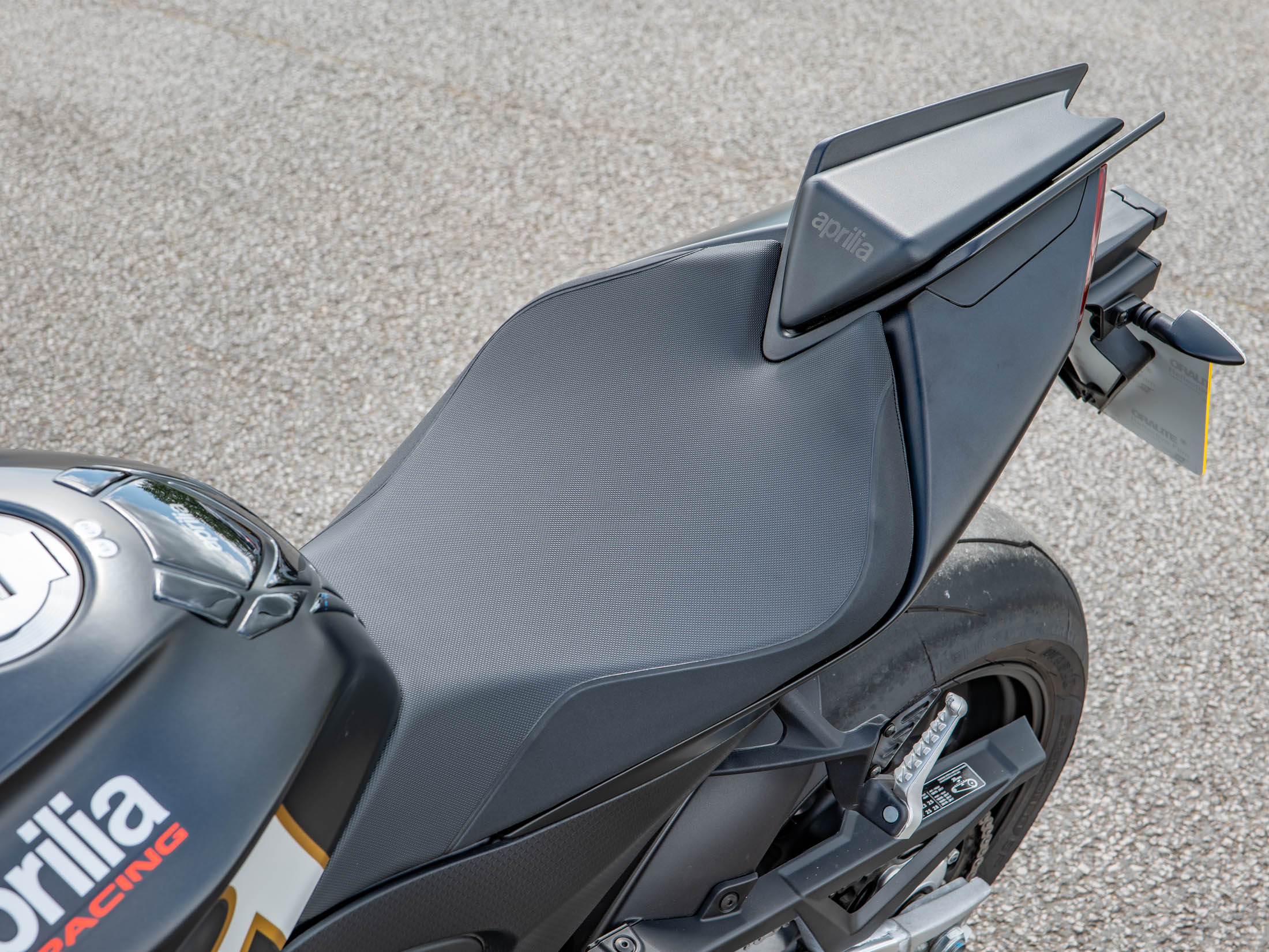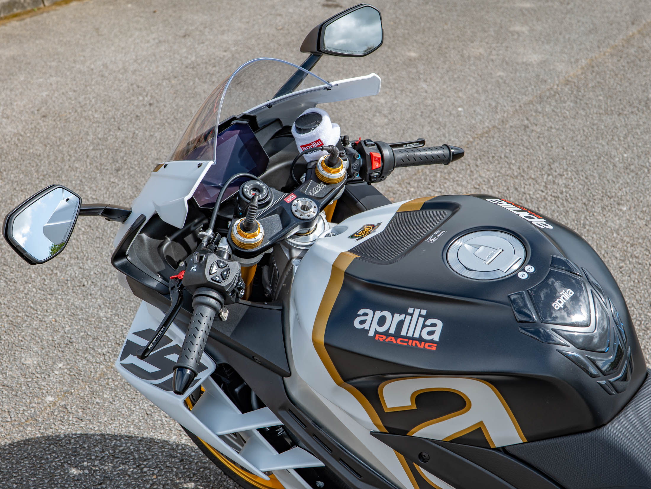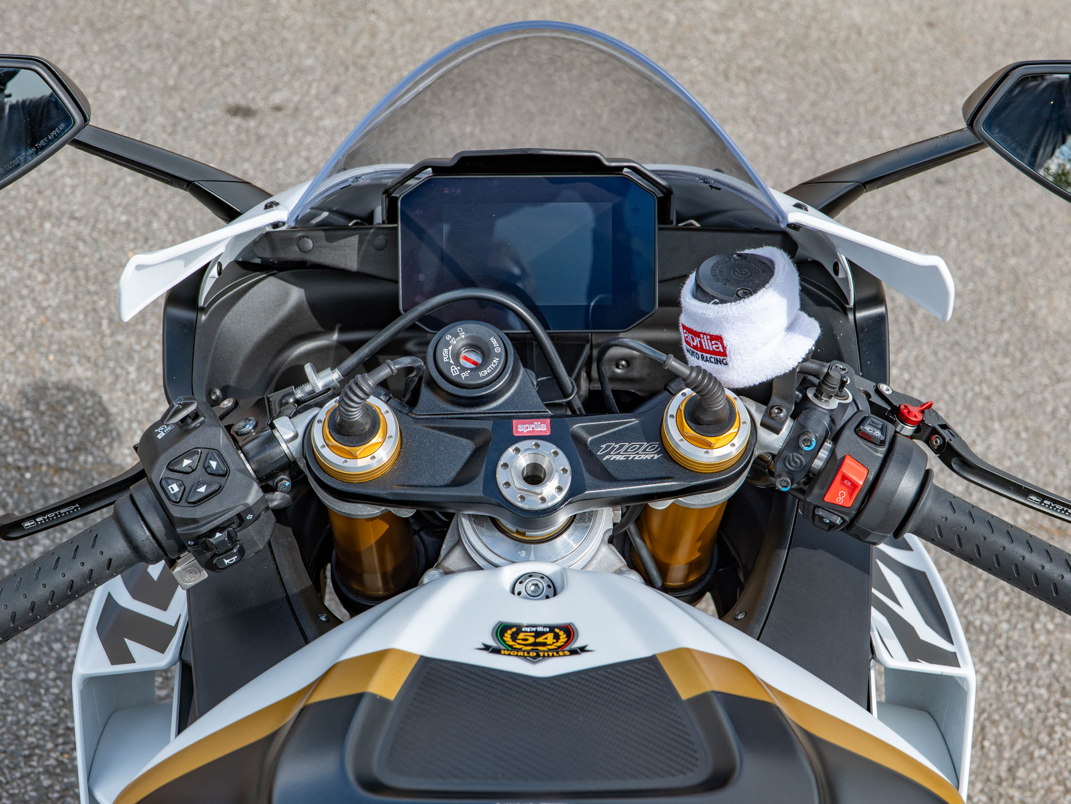 This Factory model is a "standard" bike in terms of its core architecture but features premium Evotech levers for enhanced tactile control. The performance is harnessed by the most sophisticated electronics suite available, including the Marelli 11MP ECU, which manages the semi-active Öhlins suspension, cornering ABS, and the comprehensive a-PRC (Aprilia Performance Ride Control) system.