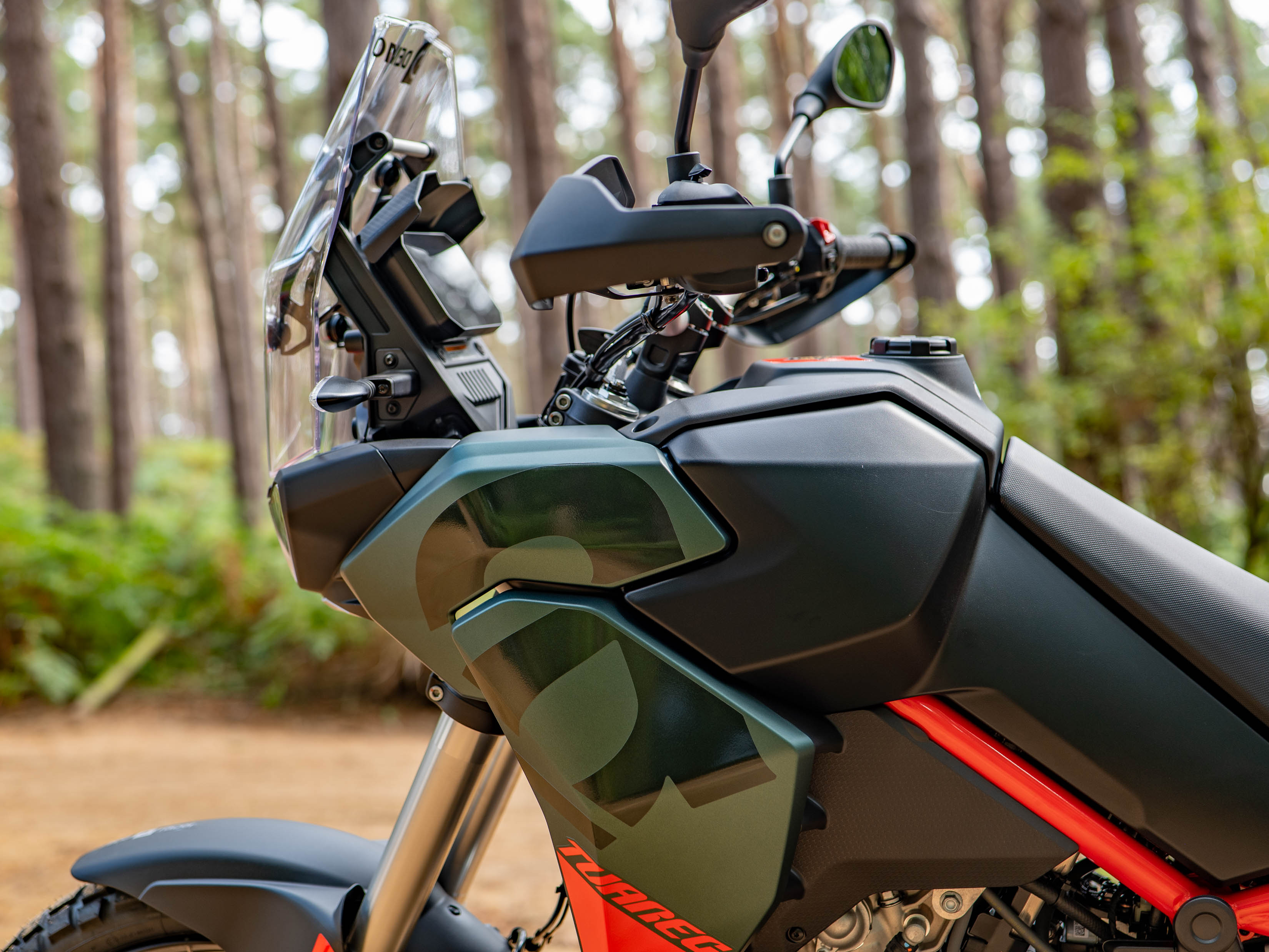 The Tuareg 660 is powered by the brilliant 659cc parallel twin engine, which is tuned to deliver a potent 80 hp and strong mid-range torque, perfectly suited for both on and off-road riding. Power is delivered through a six-speed manual transmission, and the engine benefits from the 2025 update, featuring larger 52mm throttle bodies and a revised ECU for better throttle response and Euro 5+ compliance. The adventure capability is highlighted by the long-travel, fully adjustable Kayaba suspension (240mm travel front and rear) and robust spoked wheels (21-inch front) for serious off-road excursions.