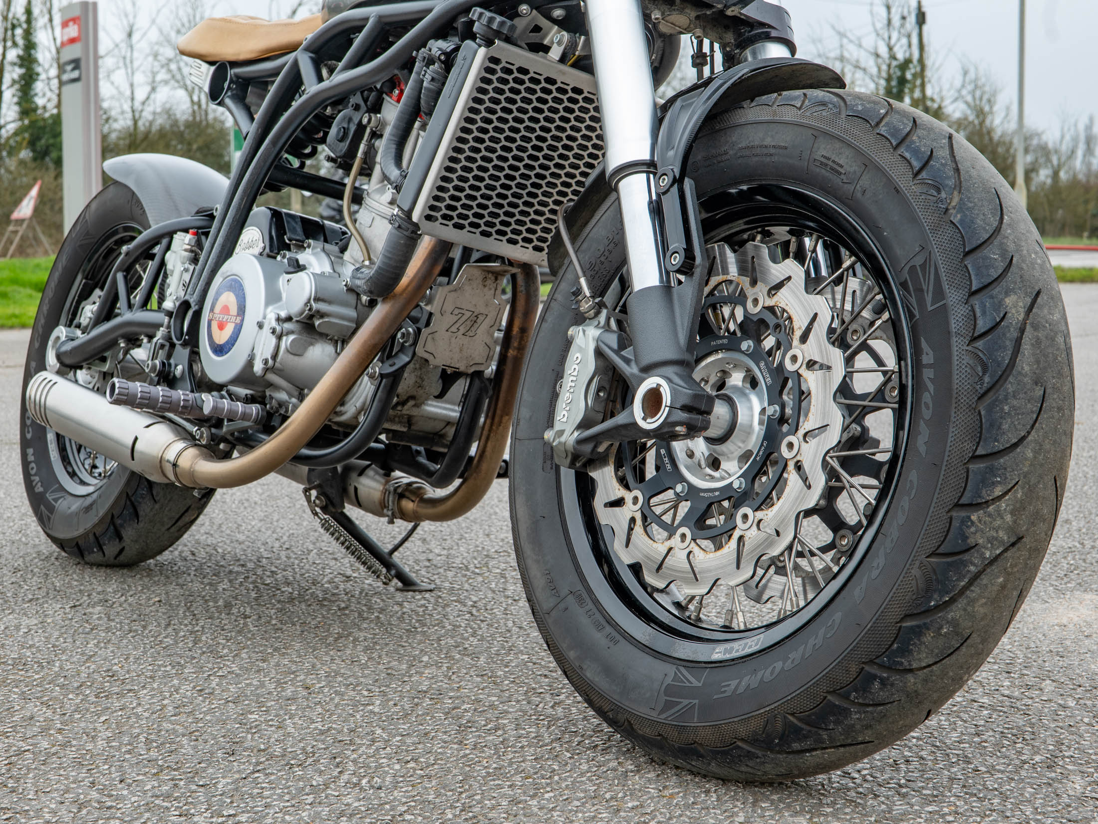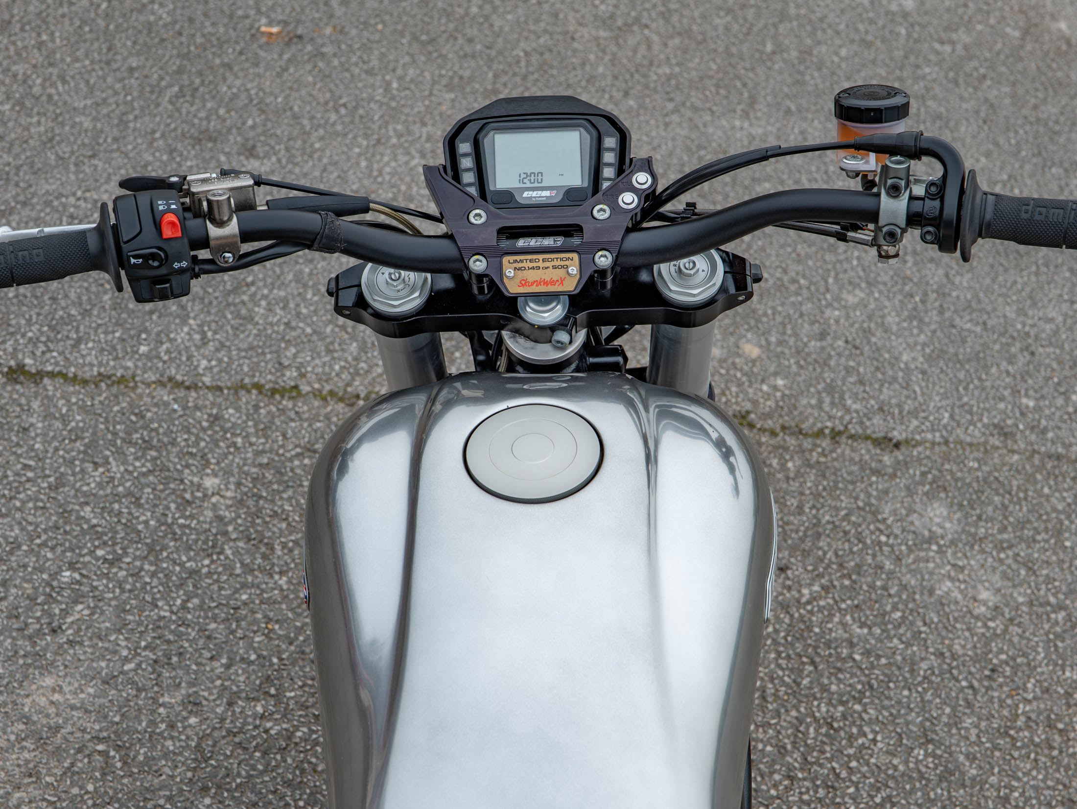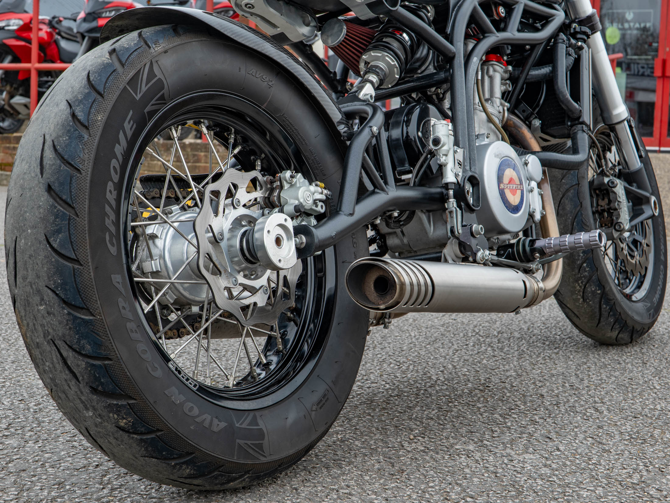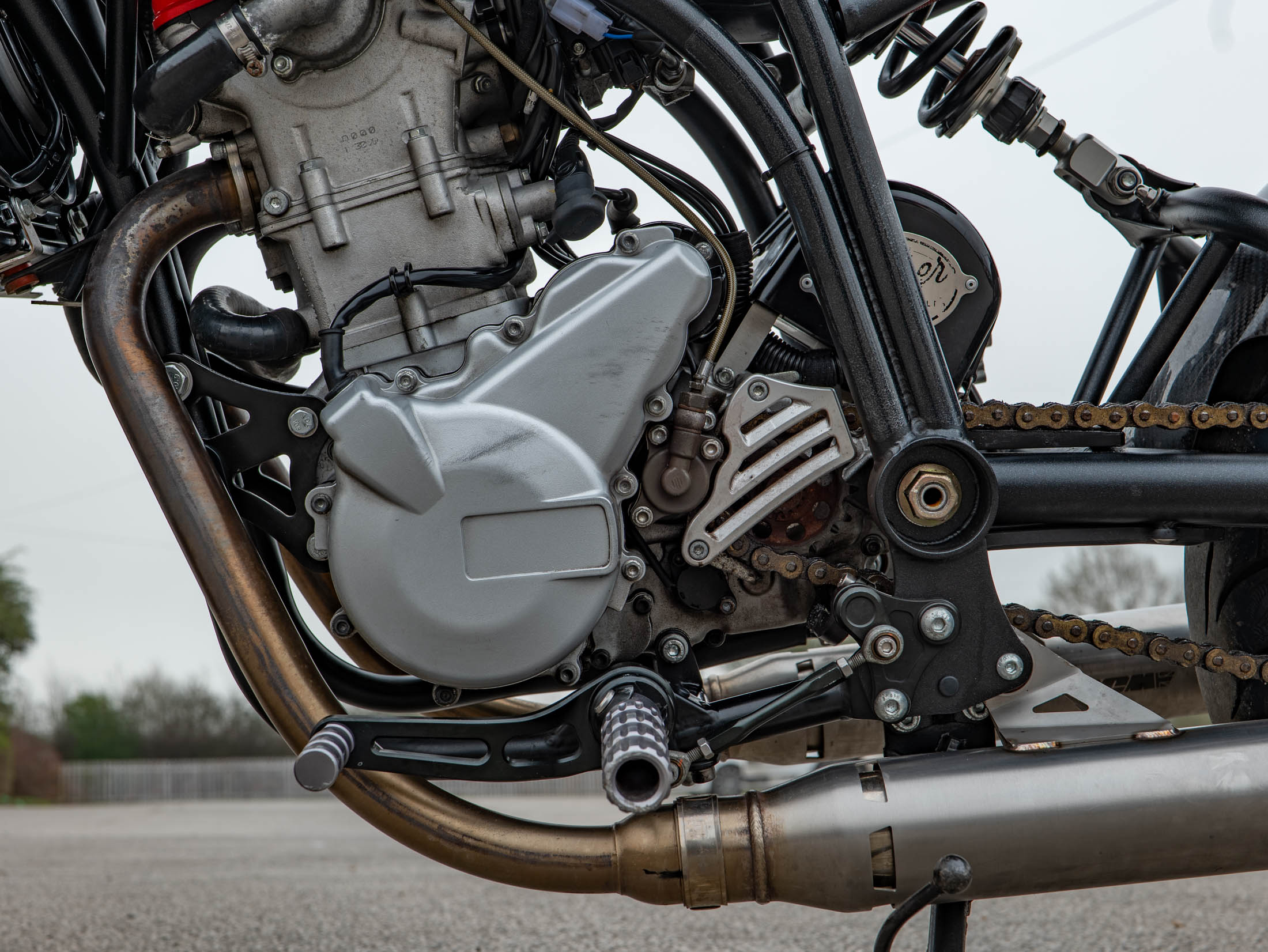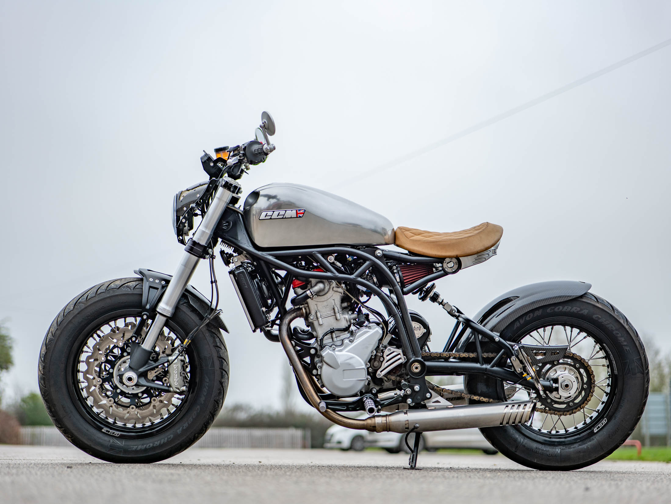 The Spitfire Bobber is powered by a punchy 600cc liquid-cooled single-cylinder engine, producing a spirited 55 hp. Originally derived from Husqvarna enduro DNA, this engine is tuned for a torque-rich experience that perfectly suits the bike’s ultra-lightweight 135 kg dry weight. The result is a power-to-weight ratio that makes the Bobber surprisingly agile and responsive. The signature underslung dual exhaust system not only defines the bike's silhouette but provides a distinctive, rhythmic thrum that is pure CCM.
