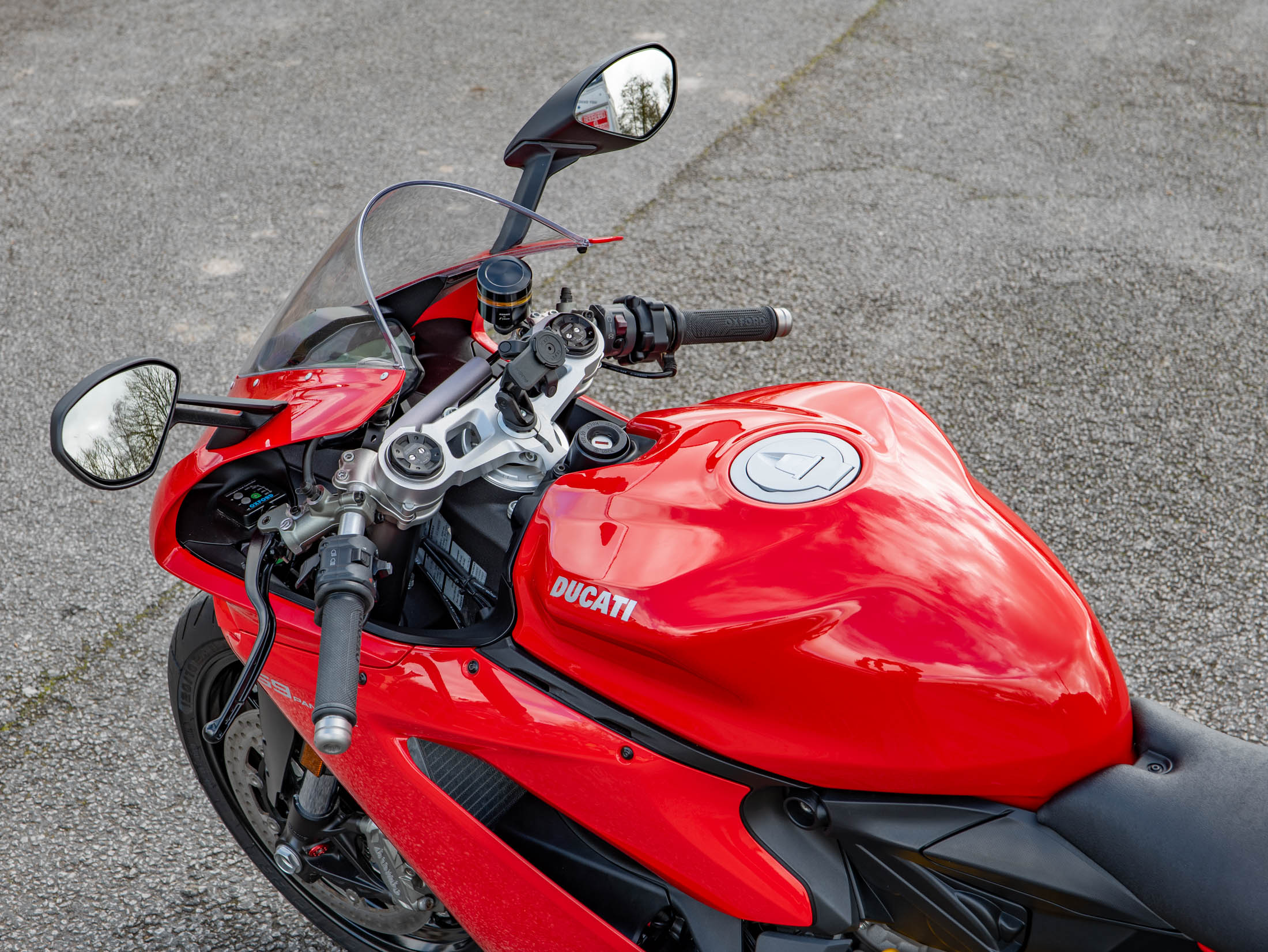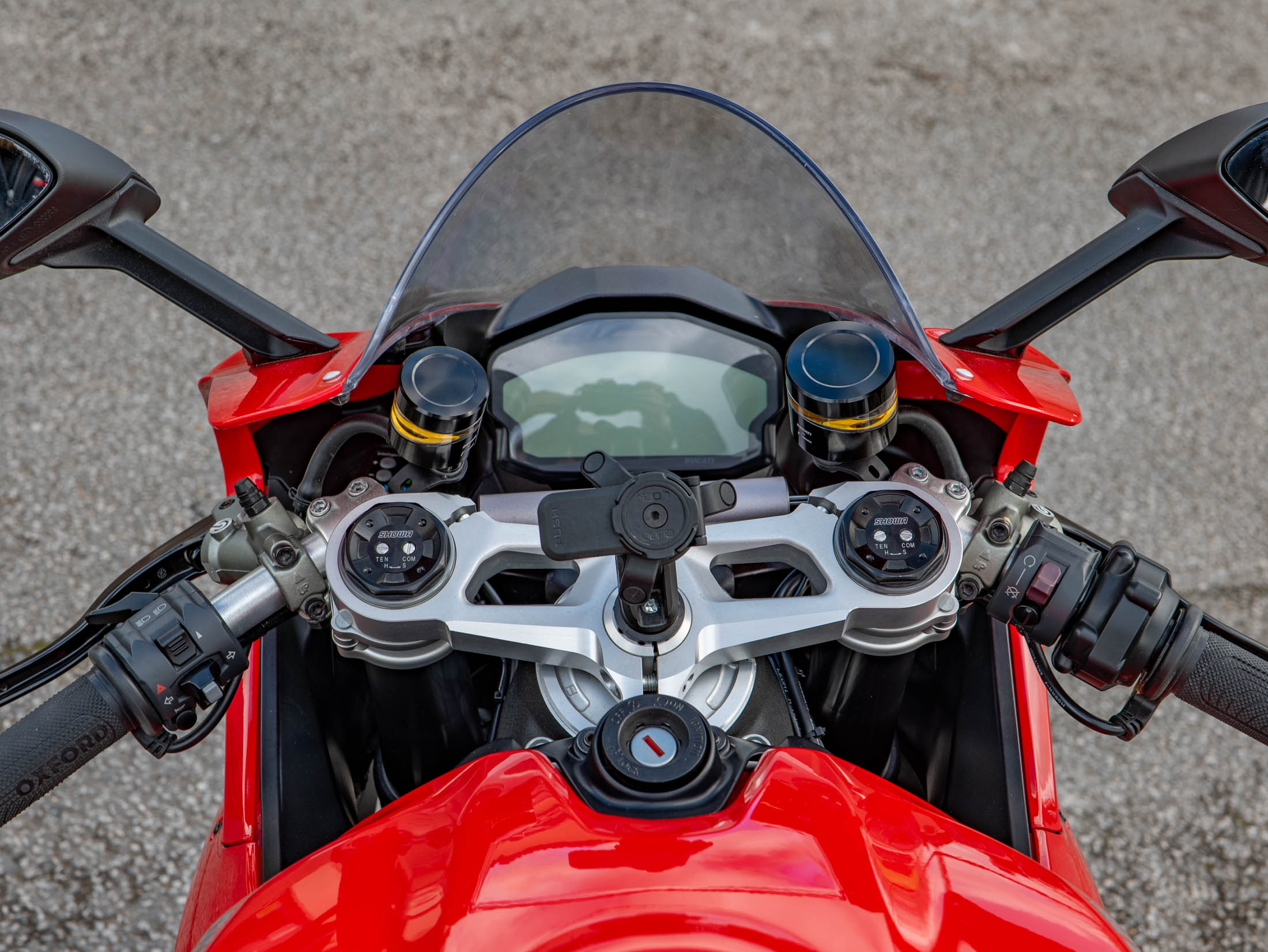 This 959 Panigale has been thoughtfully equipped with high-value extras for the modern rider. It features a Quadlock phone mount for easy navigation and heated grips for year-round comfort—a rare but welcome luxury on a superbike. For peace of mind, it is fitted with crash bobbins and paddock stand bobbins. The factory electronics suite is world-class, featuring the Ducati Quick Shift (DQS), Bosch ABS, and 8-level Ducati Traction Control (DTC), all of which work seamlessly to manage the 157 hp power delivery. A factory-fitted steering damper ensures the front end remains composed even under hard acceleration.