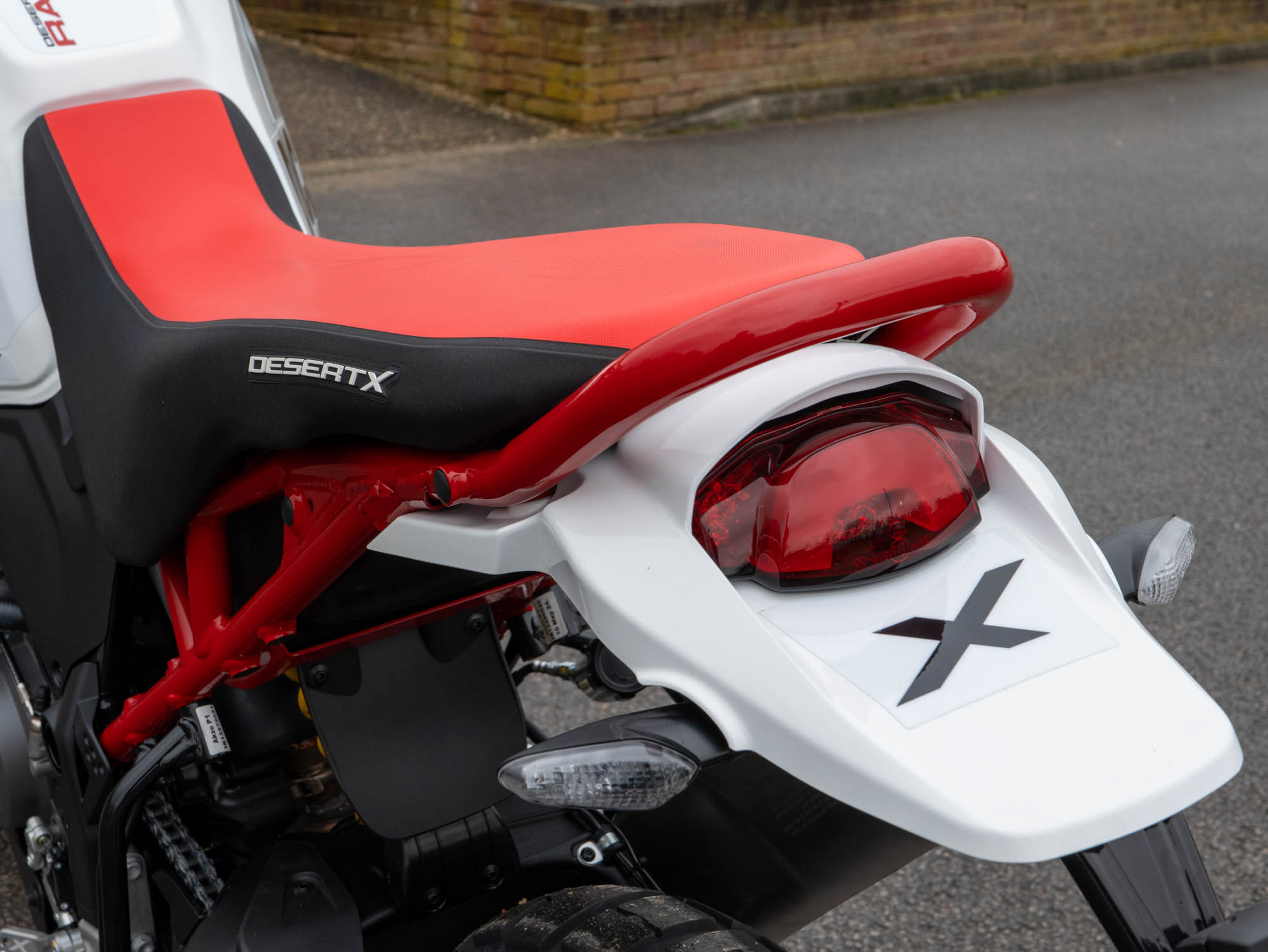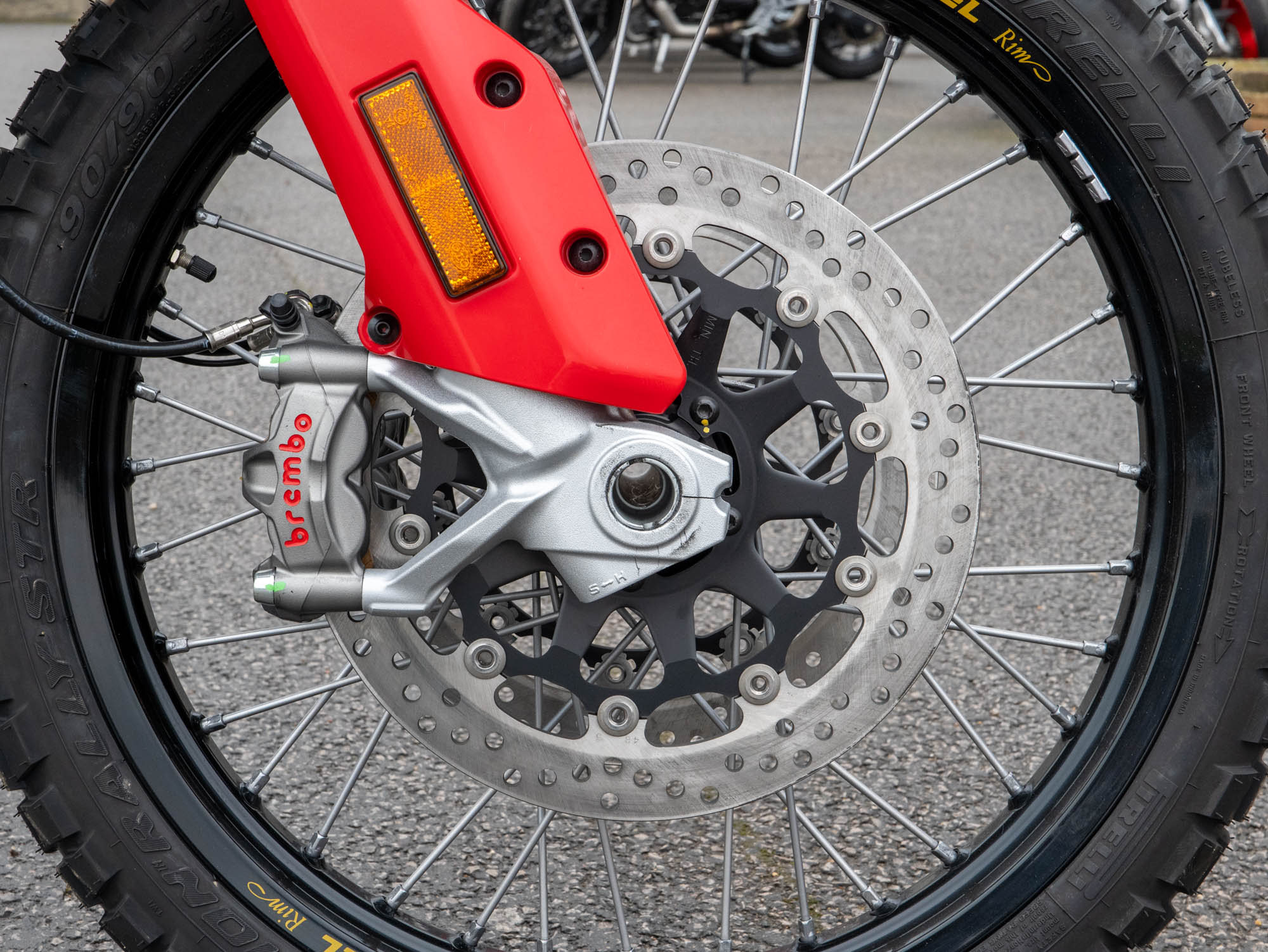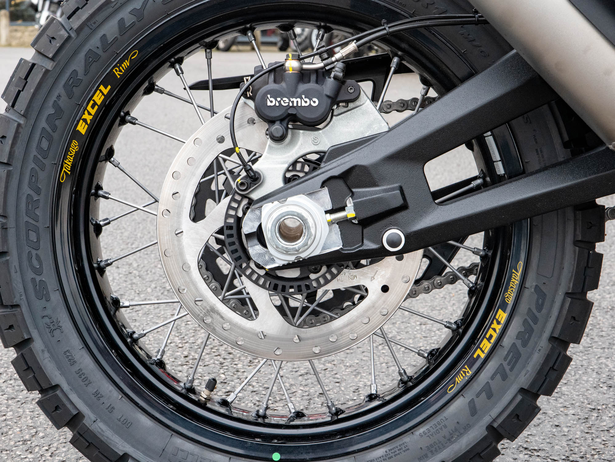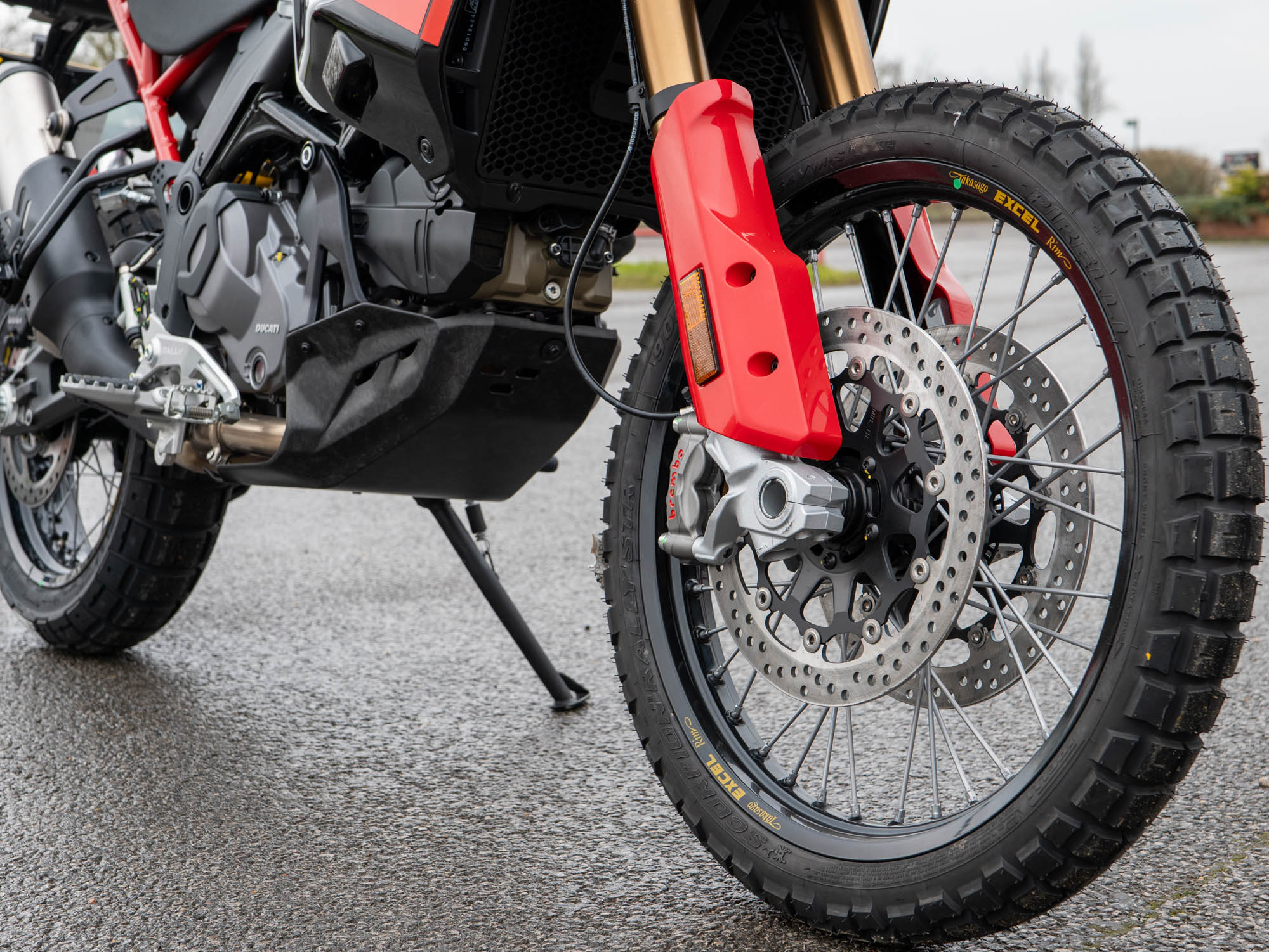 The DesertX Rally is powered by the brilliant 937cc Testastretta 11° V-twin engine, delivering a potent and tractable 110 hp through a precise six-speed manual transmission. This machine is defined by its race-derived running gear, boasting professional-grade Kayaba suspension with increased travel and revised geometry for extreme off-road use. Crucially, the Rally edition features lightweight, high-strength Tubes Type Takasago Excel spoked wheels (21-inch front/18-inch rear) designed to withstand the toughest terrain, significantly enhancing its capability over the standard DesertX.