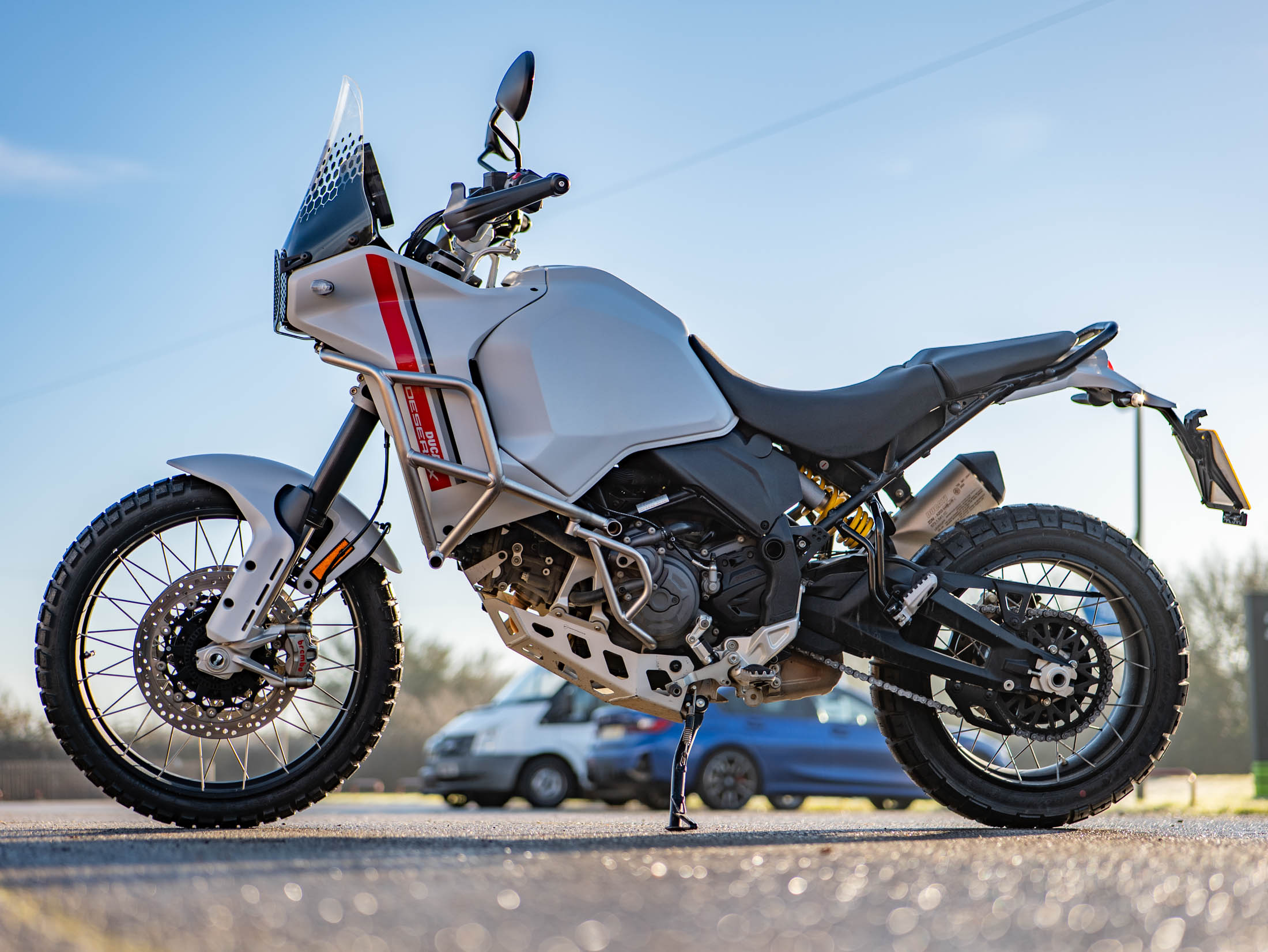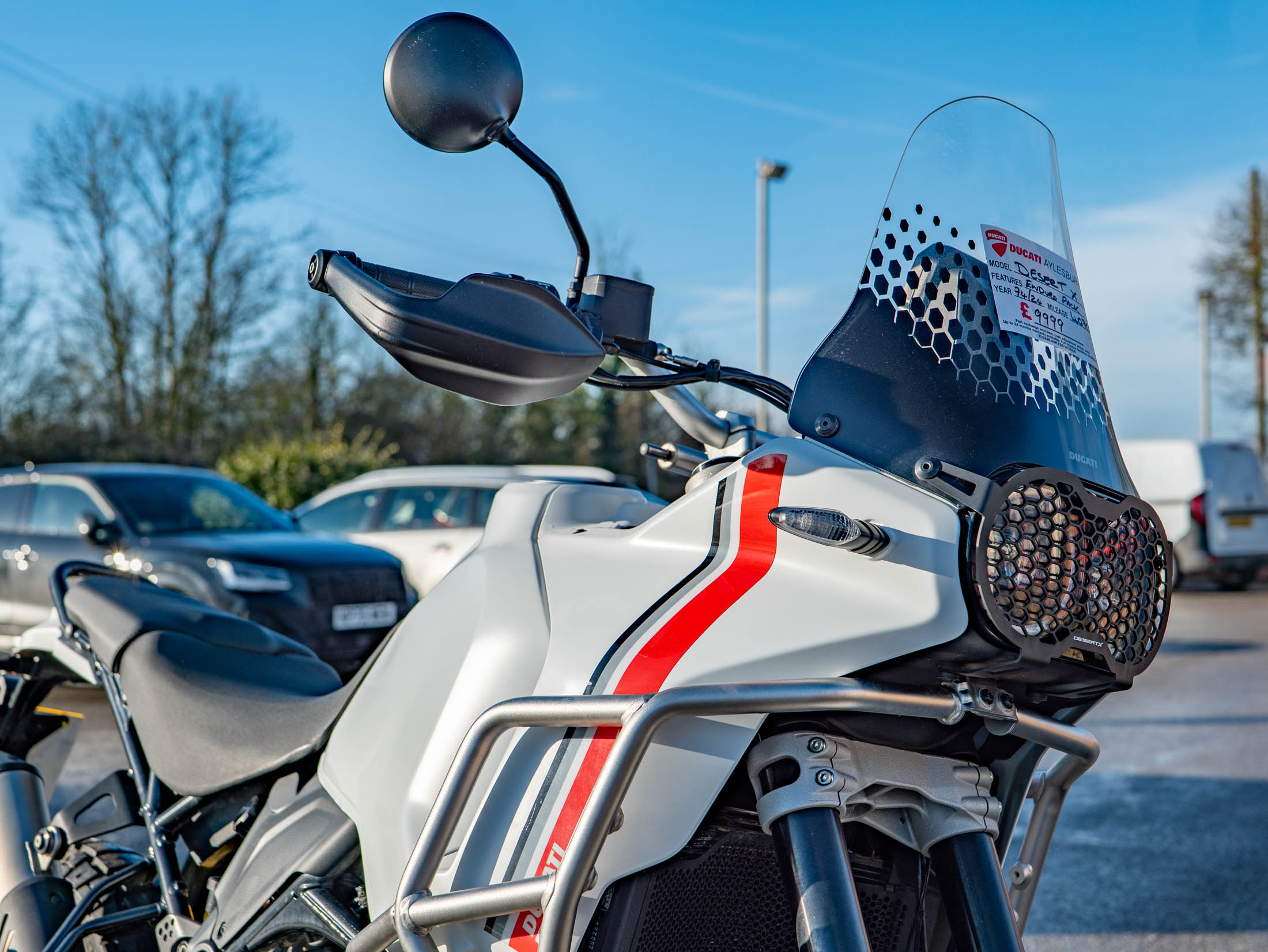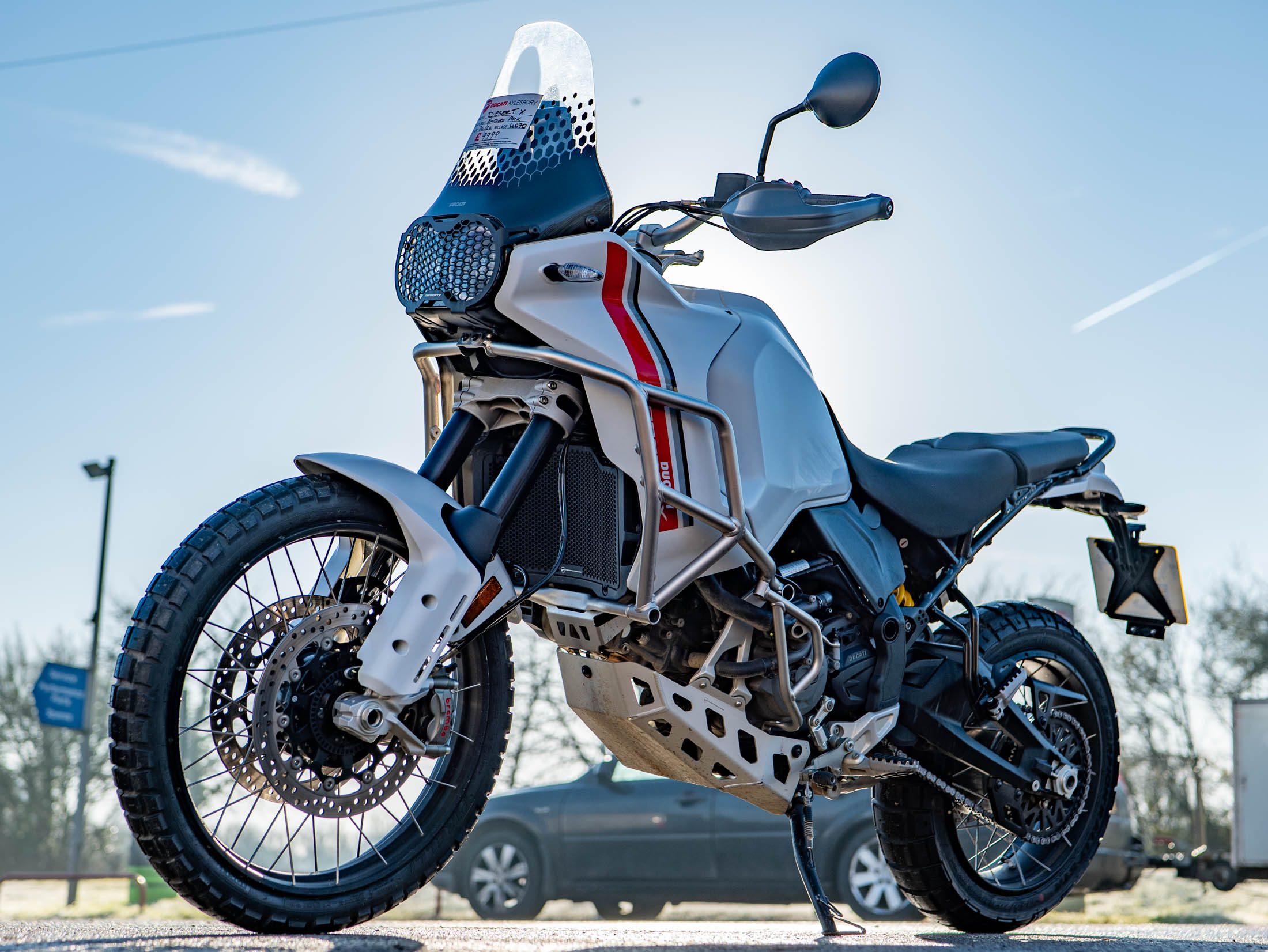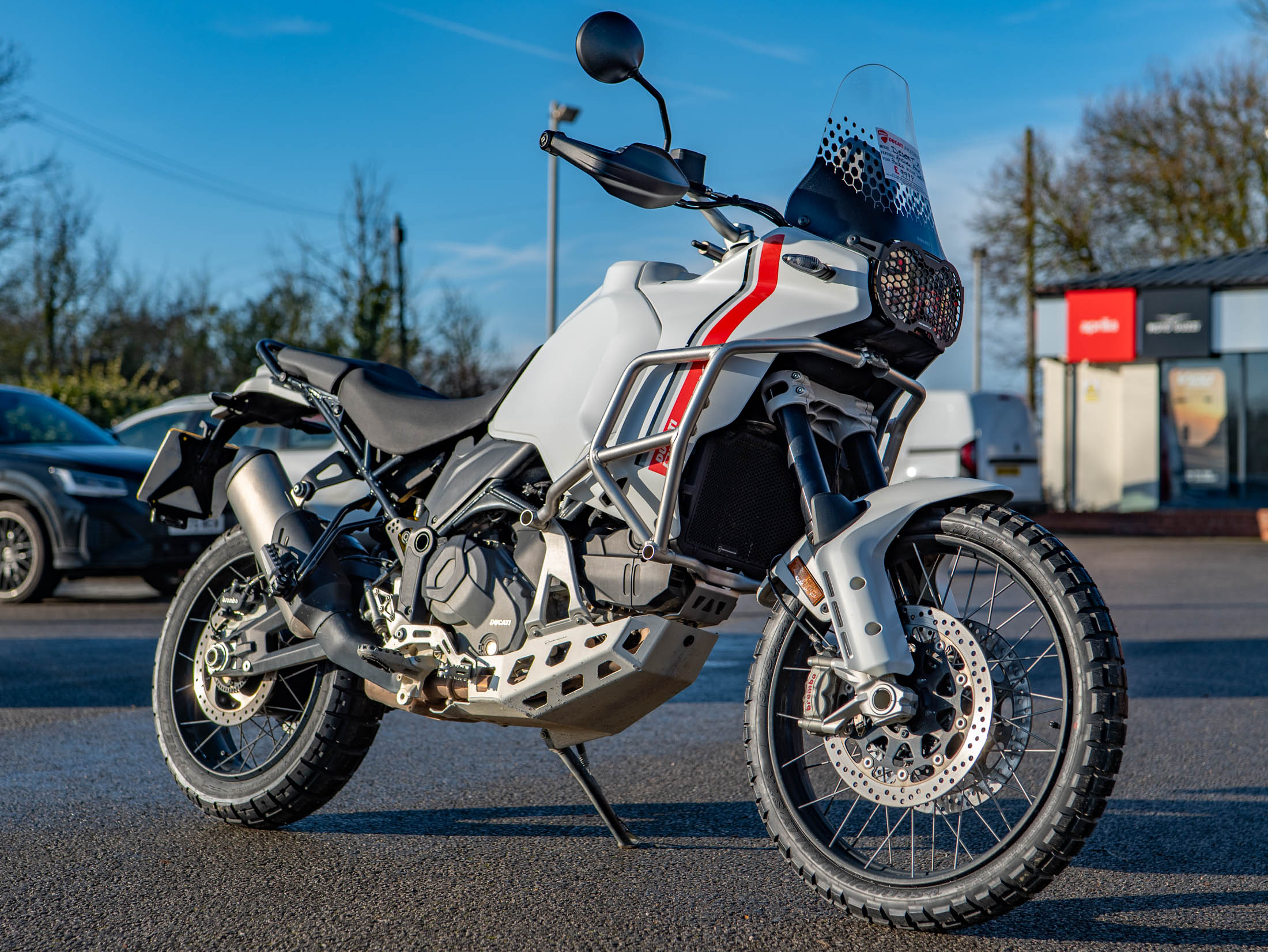 This particular DesertX is truly "ready to off-road," equipped with a comprehensive suite of protective and comfort upgrades. It features heavy-duty engine crash bars, an alloy sump guard, a radiator guard, and a headlight guard to shield vital components from trail debris. For long-distance touring, it is fitted with heated grips and a sophisticated electronics package including six riding modes (including dedicated Enduro and Rally modes), Bosch Cornering ABS, and a bi-directional quickshifter. The 21-inch front and 18-inch rear spoked wheels, combined with long-travel KYB suspension, ensure it handles the toughest terrains with Italian flair and precision.