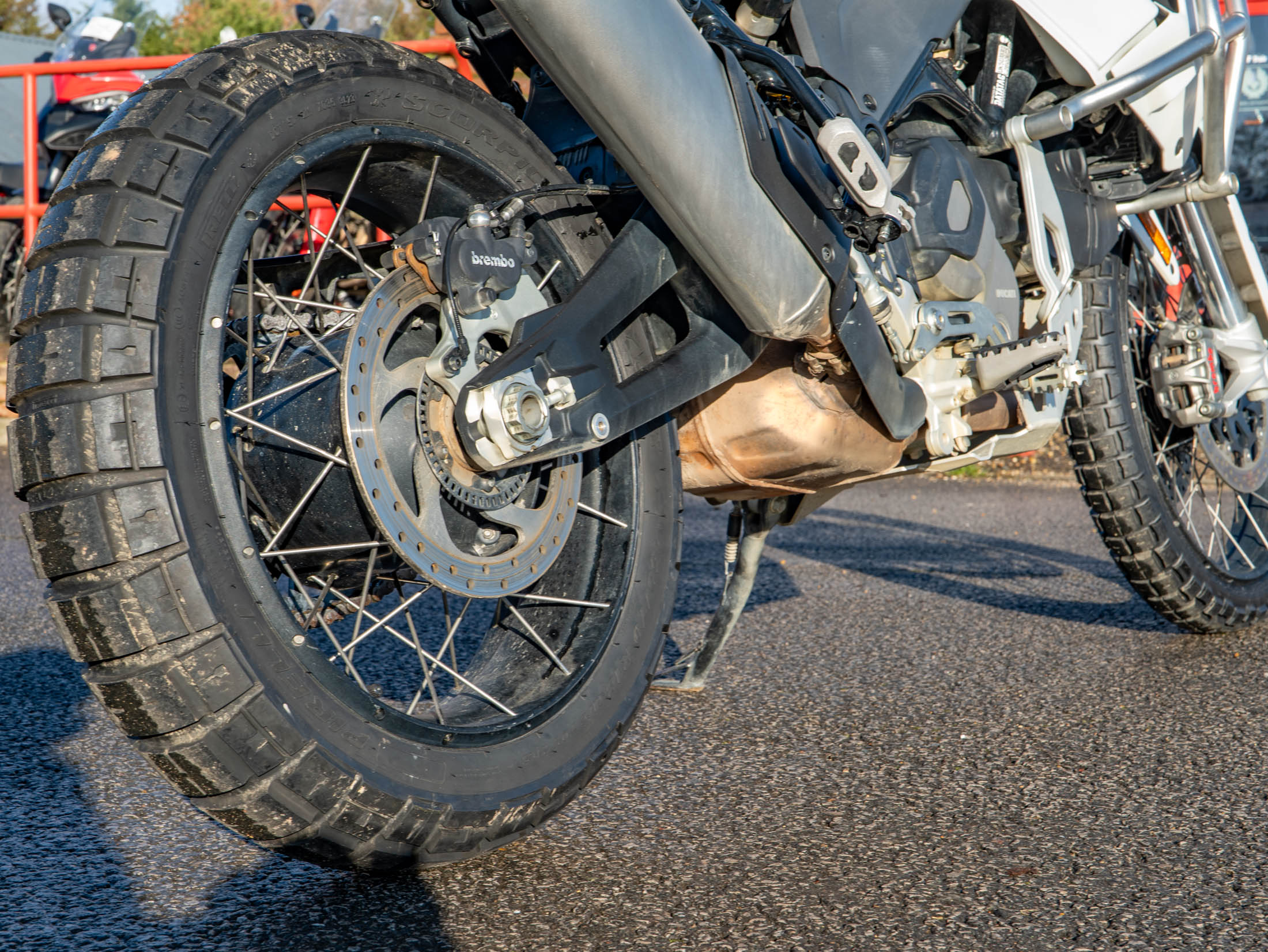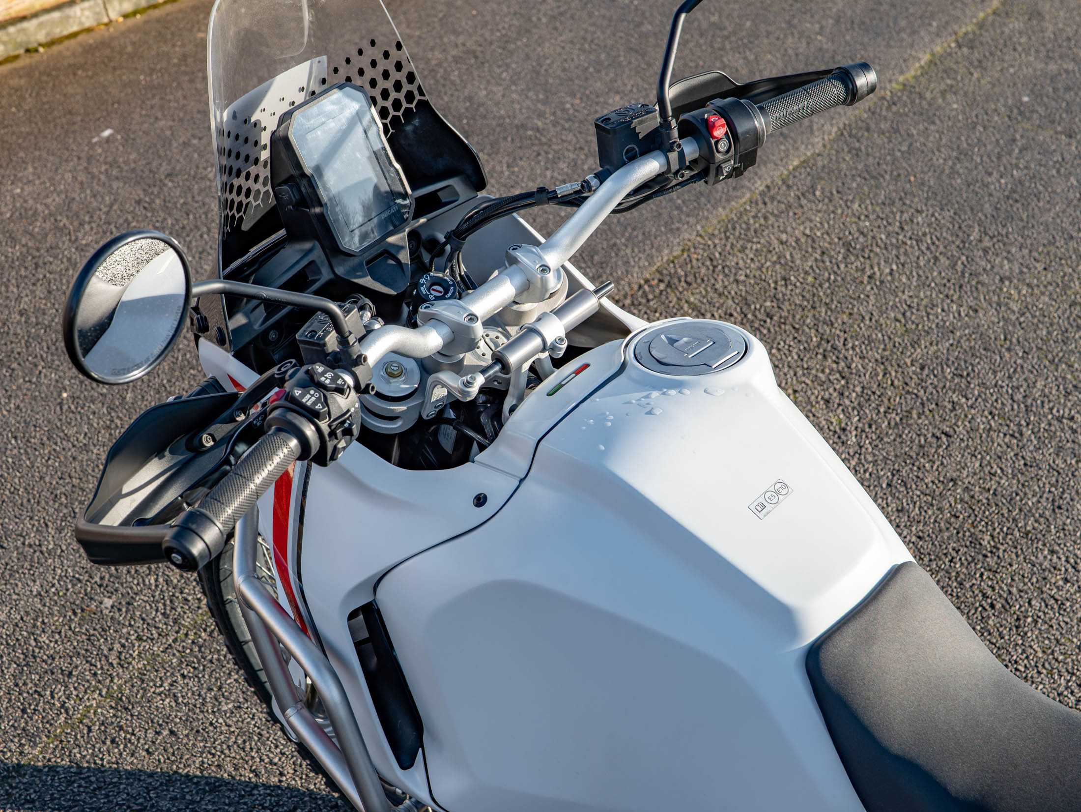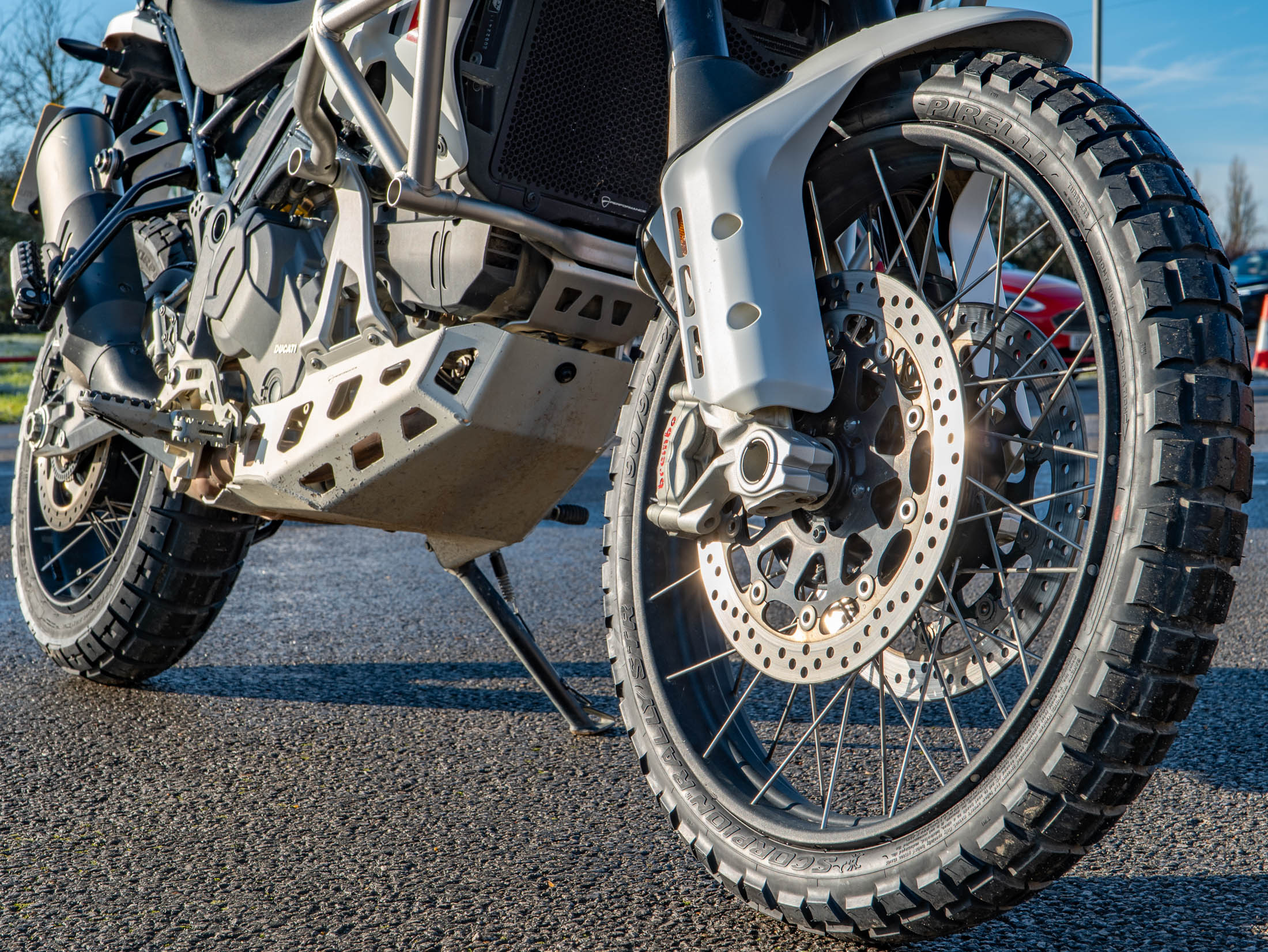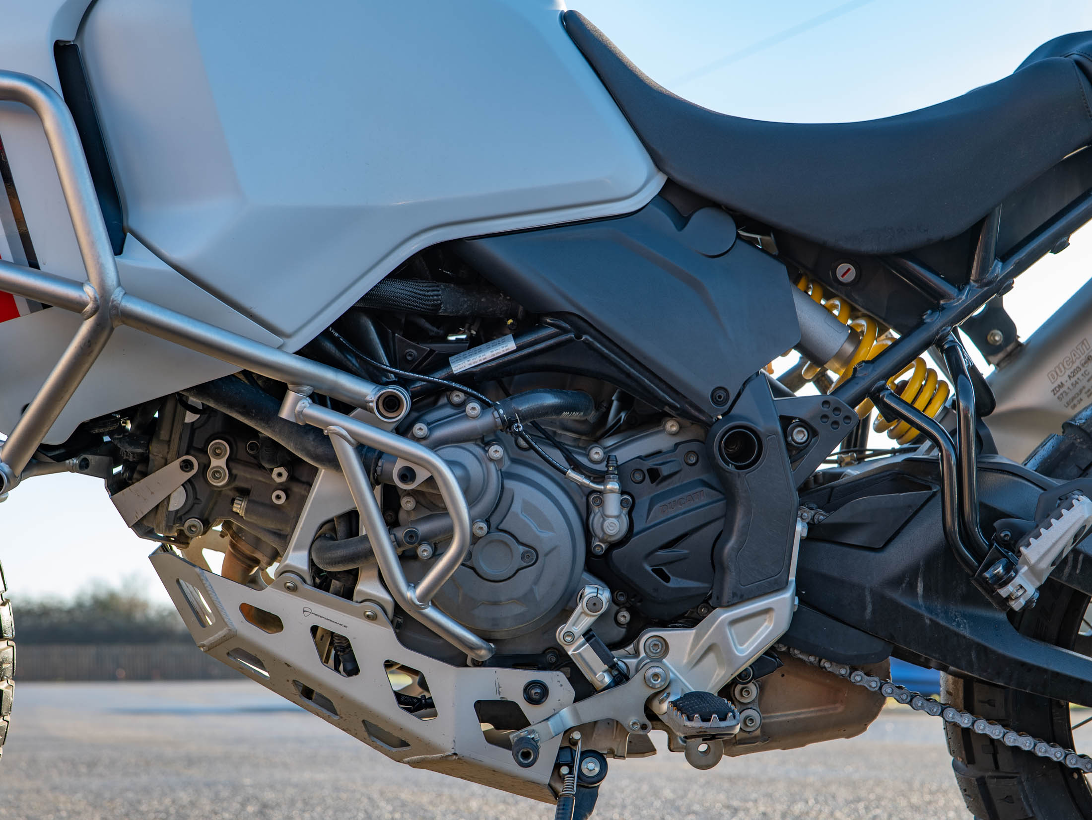 This particular DesertX is truly "ready to off-road," equipped with a comprehensive suite of protective and comfort upgrades. It features heavy-duty engine crash bars, an alloy sump guard, a radiator guard, and a headlight guard to shield vital components from trail debris. For long-distance touring, it is fitted with heated grips and a sophisticated electronics package including six riding modes (including dedicated Enduro and Rally modes), Bosch Cornering ABS, and a bi-directional quickshifter. The 21-inch front and 18-inch rear spoked wheels, combined with long-travel KYB suspension, ensure it handles the toughest terrains with Italian flair and precision.