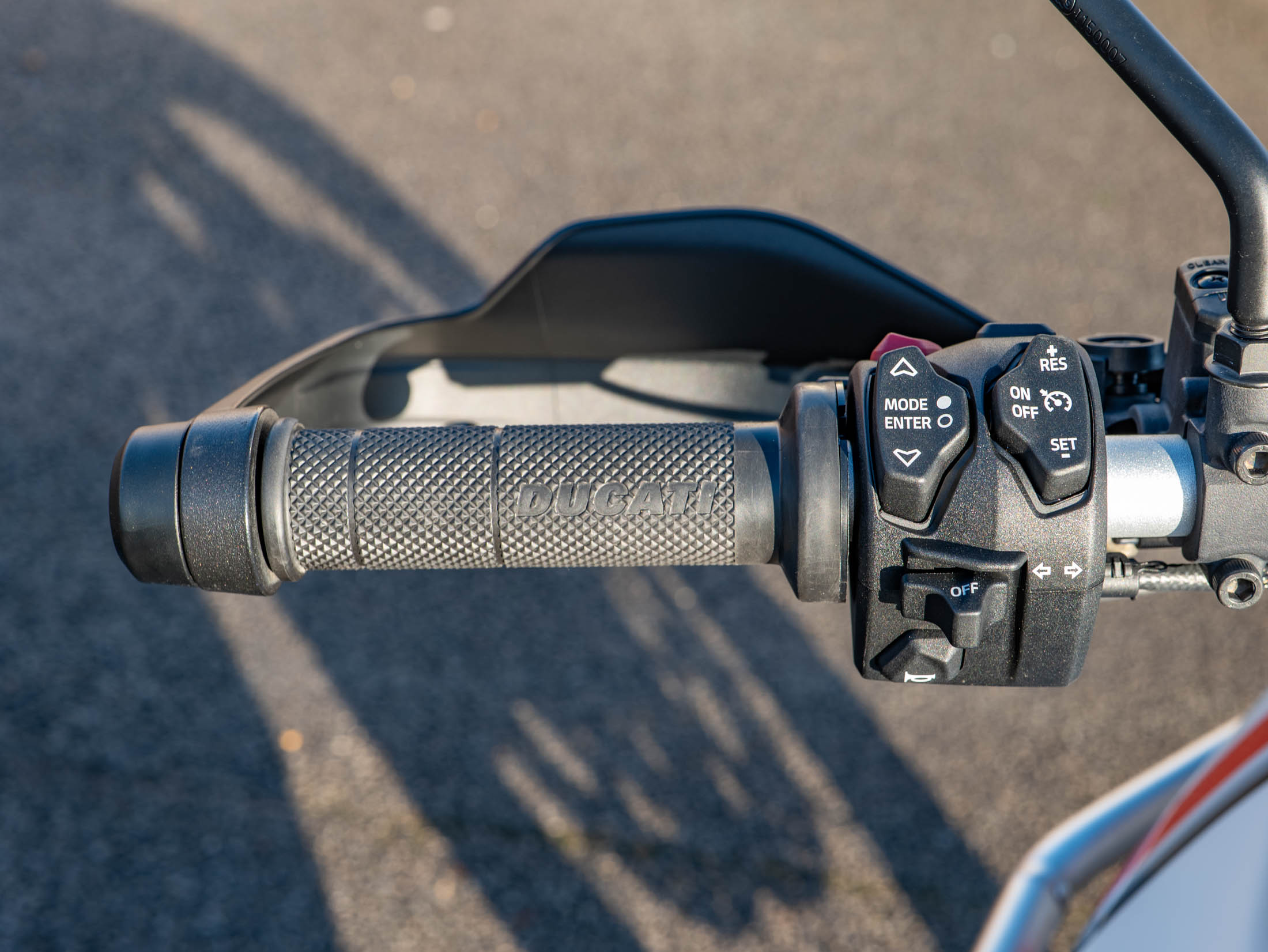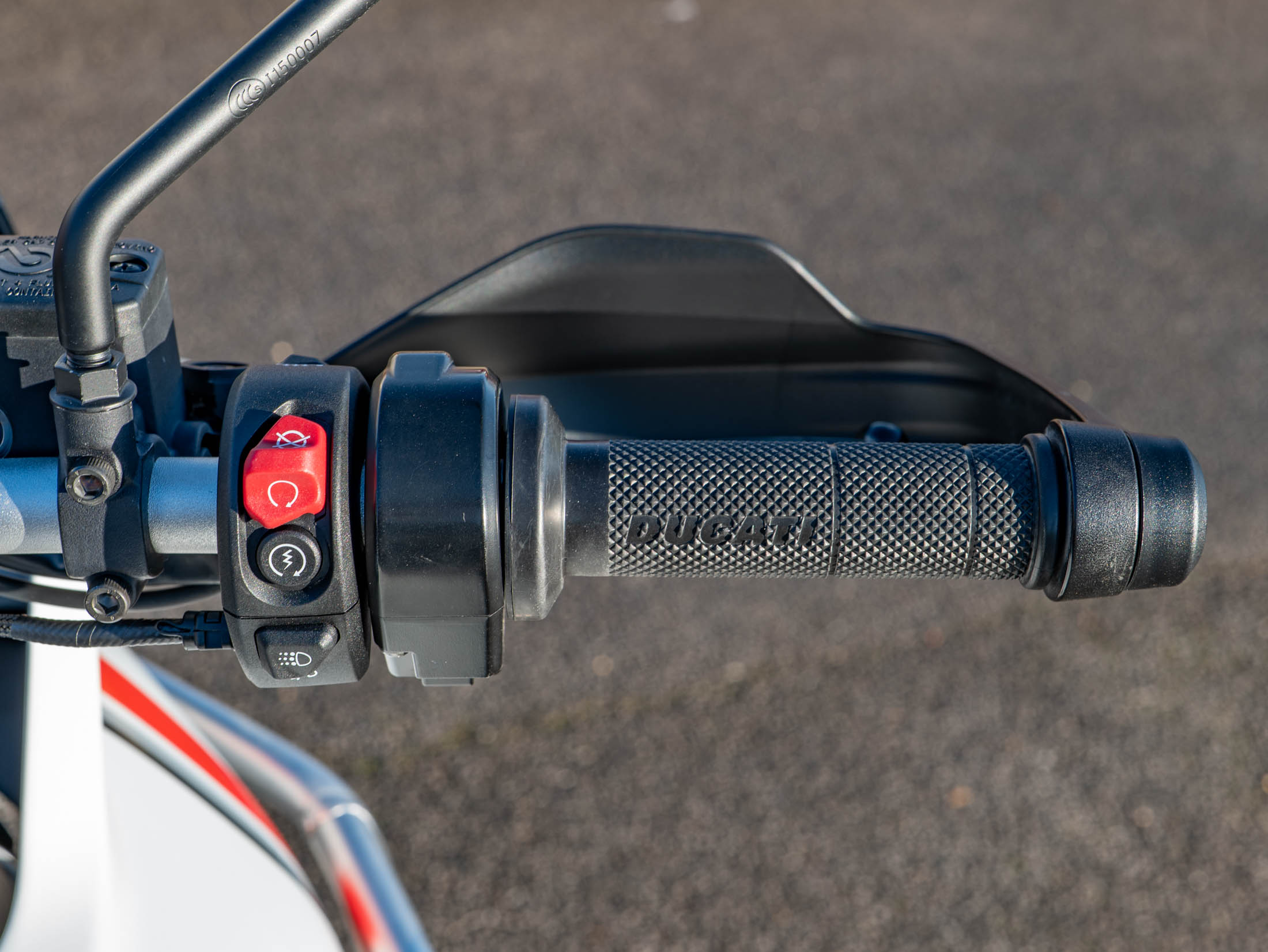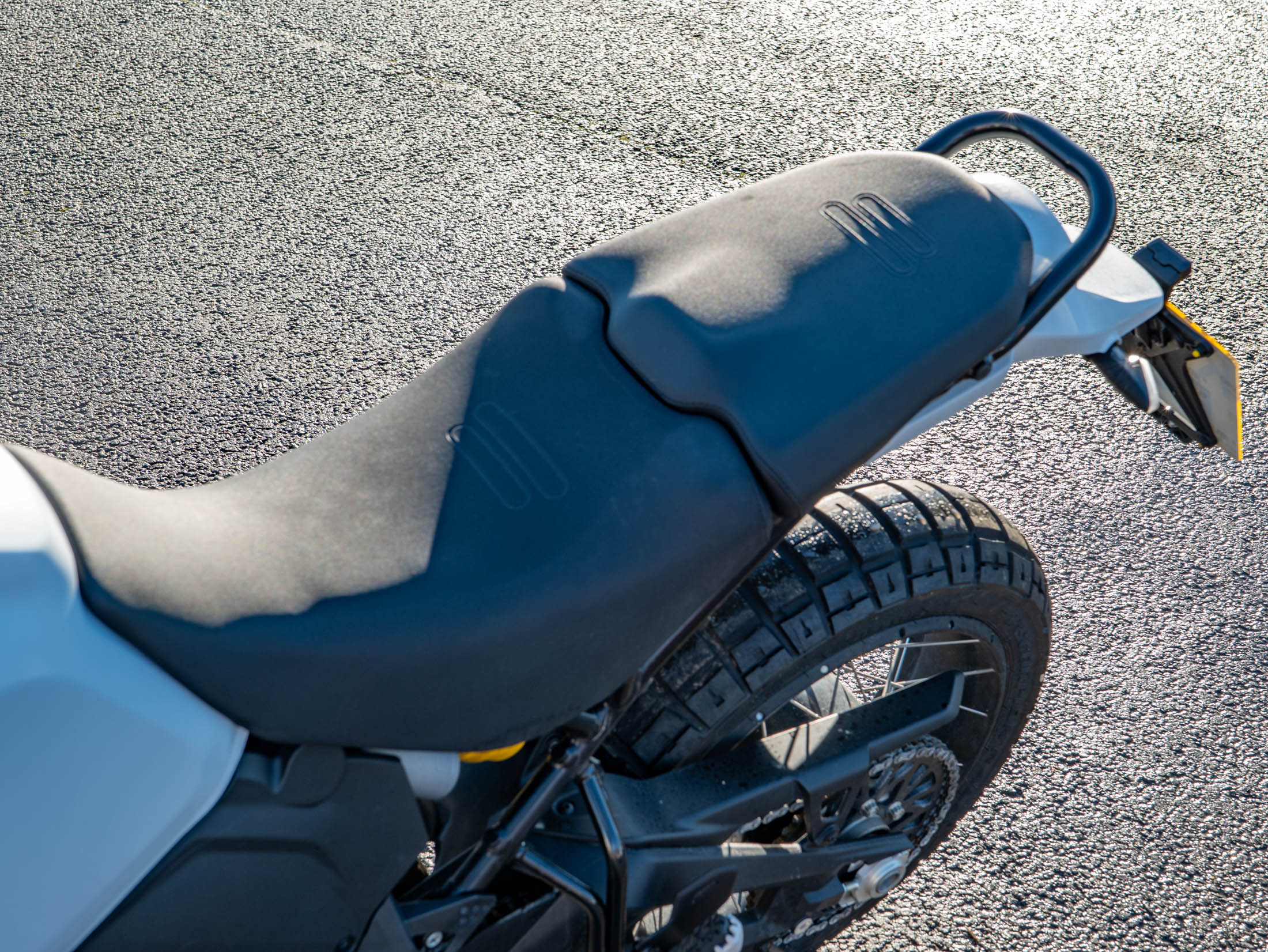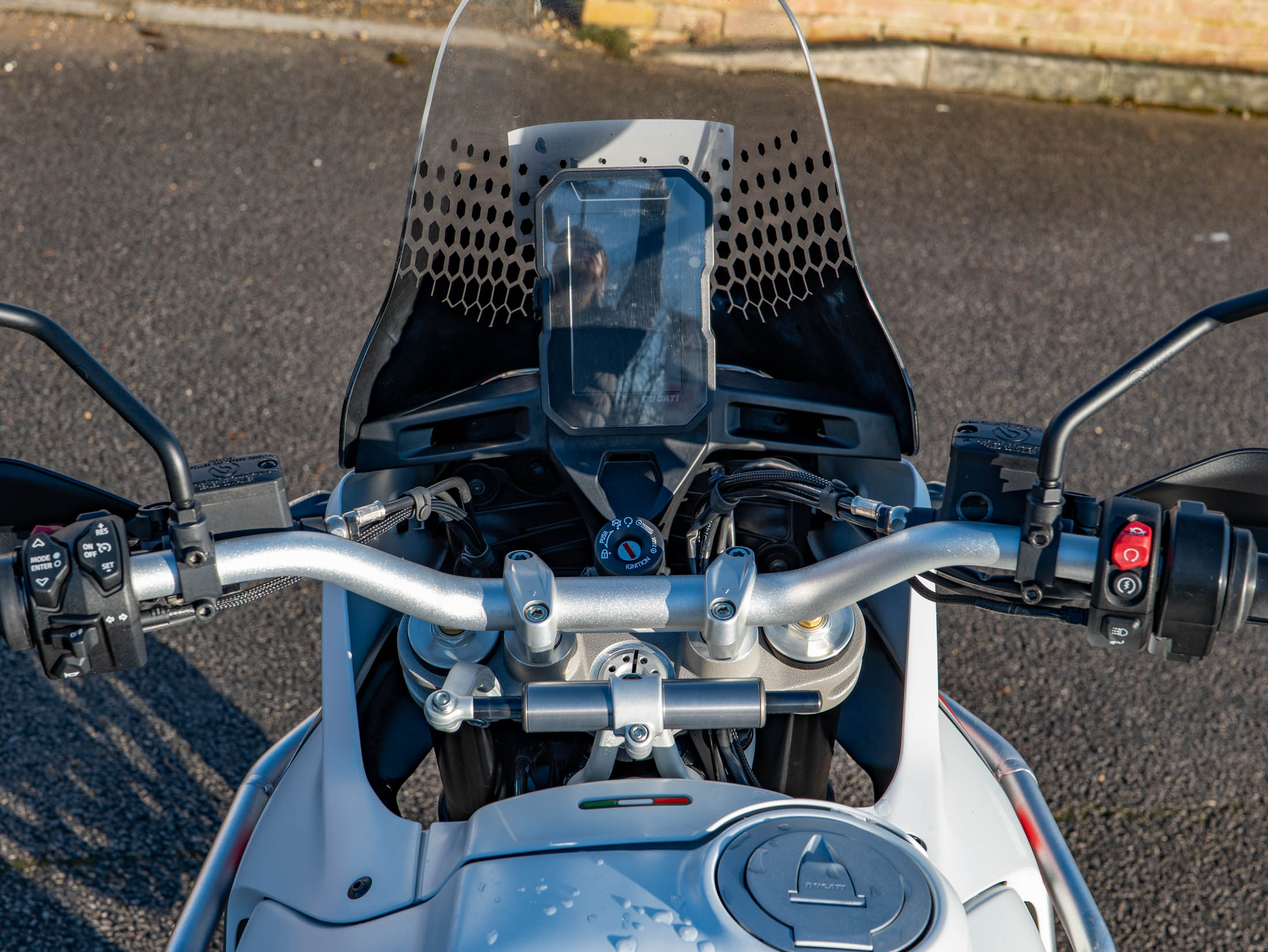 This particular DesertX is truly "ready to off-road," equipped with a comprehensive suite of protective and comfort upgrades. It features heavy-duty engine crash bars, an alloy sump guard, a radiator guard, and a headlight guard to shield vital components from trail debris. For long-distance touring, it is fitted with heated grips and a sophisticated electronics package including six riding modes (including dedicated Enduro and Rally modes), Bosch Cornering ABS, and a bi-directional quickshifter. The 21-inch front and 18-inch rear spoked wheels, combined with long-travel KYB suspension, ensure it handles the toughest terrains with Italian flair and precision.