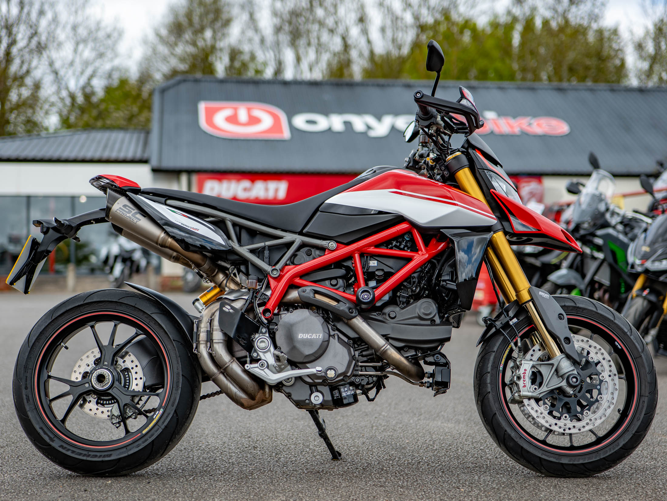The 2019 Ducati Hypermotard 950 SP delivers a visceral and exhilarating ride at On Yer Bike / Ducati Aylesbury. This 114 hp machine features a 937cc twin-cylinder engine that has been enhanced with high-mount SC Project silencers, providing a sharp look and a thunderous Ducati soundtrack. The SP variant is distinguished by its increased suspension travel and lightweight Marchesini forged wheels, which significantly reduce unsprung weight for lightning-fast direction changes.
