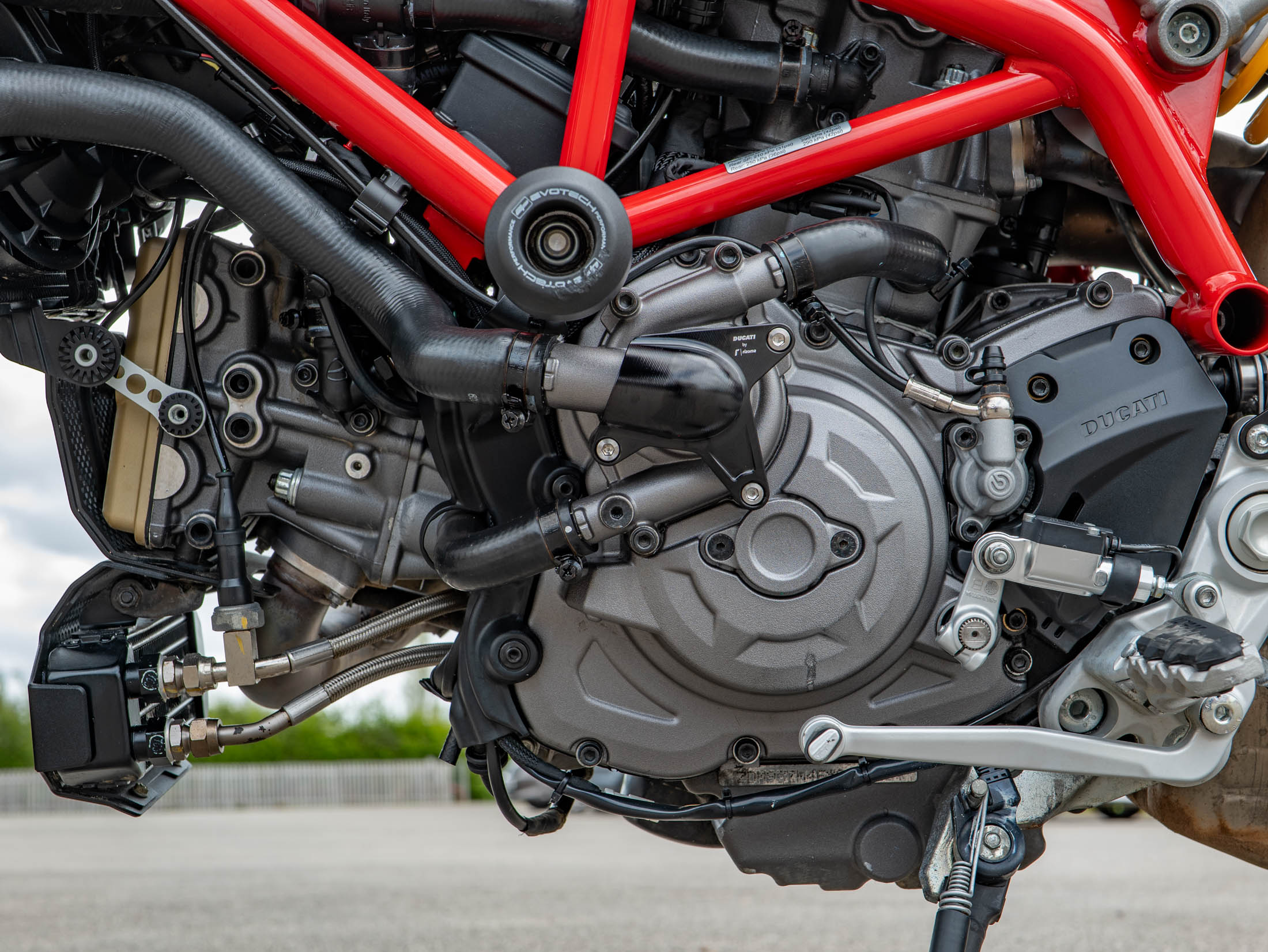 Riding the 950 SP is a masterclass in control, aided by a bi-directional quickshifter and a comprehensive Bosch 6-axis IMU electronics suite. This example has been meticulously protected with a full suite of Evotech hardware, including crash bungs, radiator guards, and front spindle sliders. The 114 hp output is managed through customisable riding modes, wheelie control, and cornering ABS, ensuring you can push the limits with confidence. The elevated riding position and flat seat provide the perfect platform for aggressive cornering.