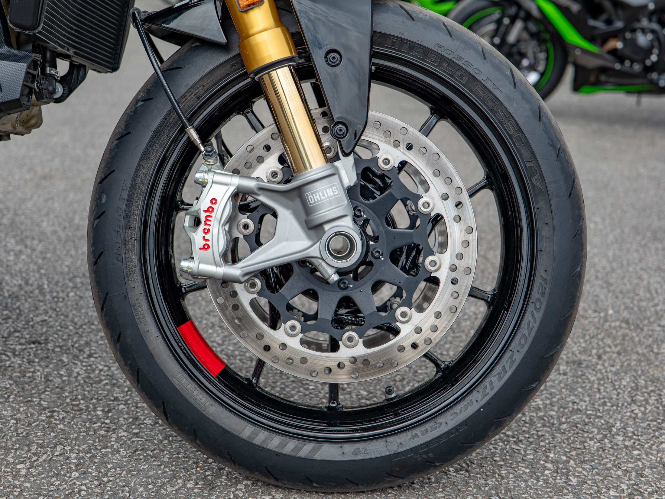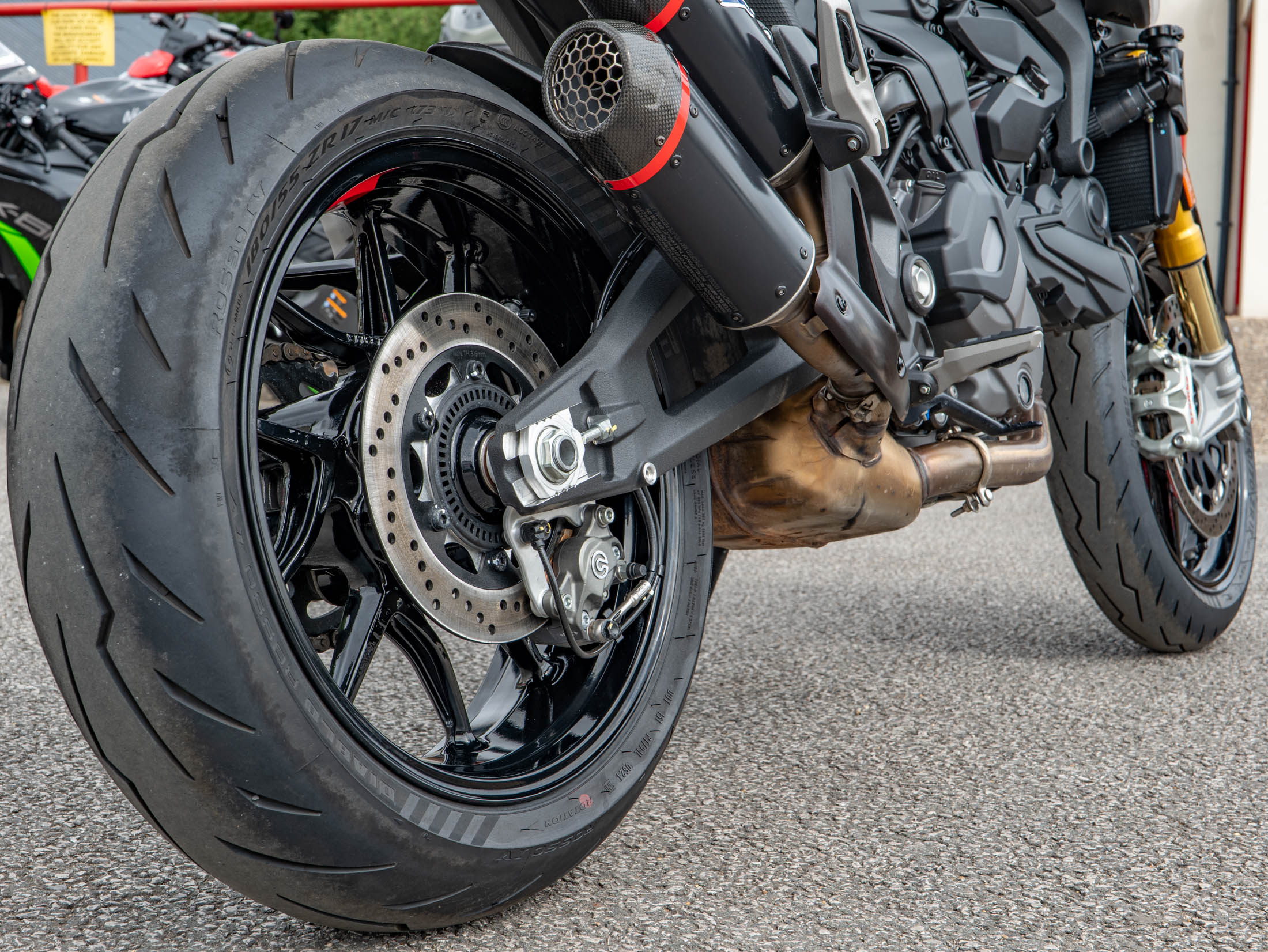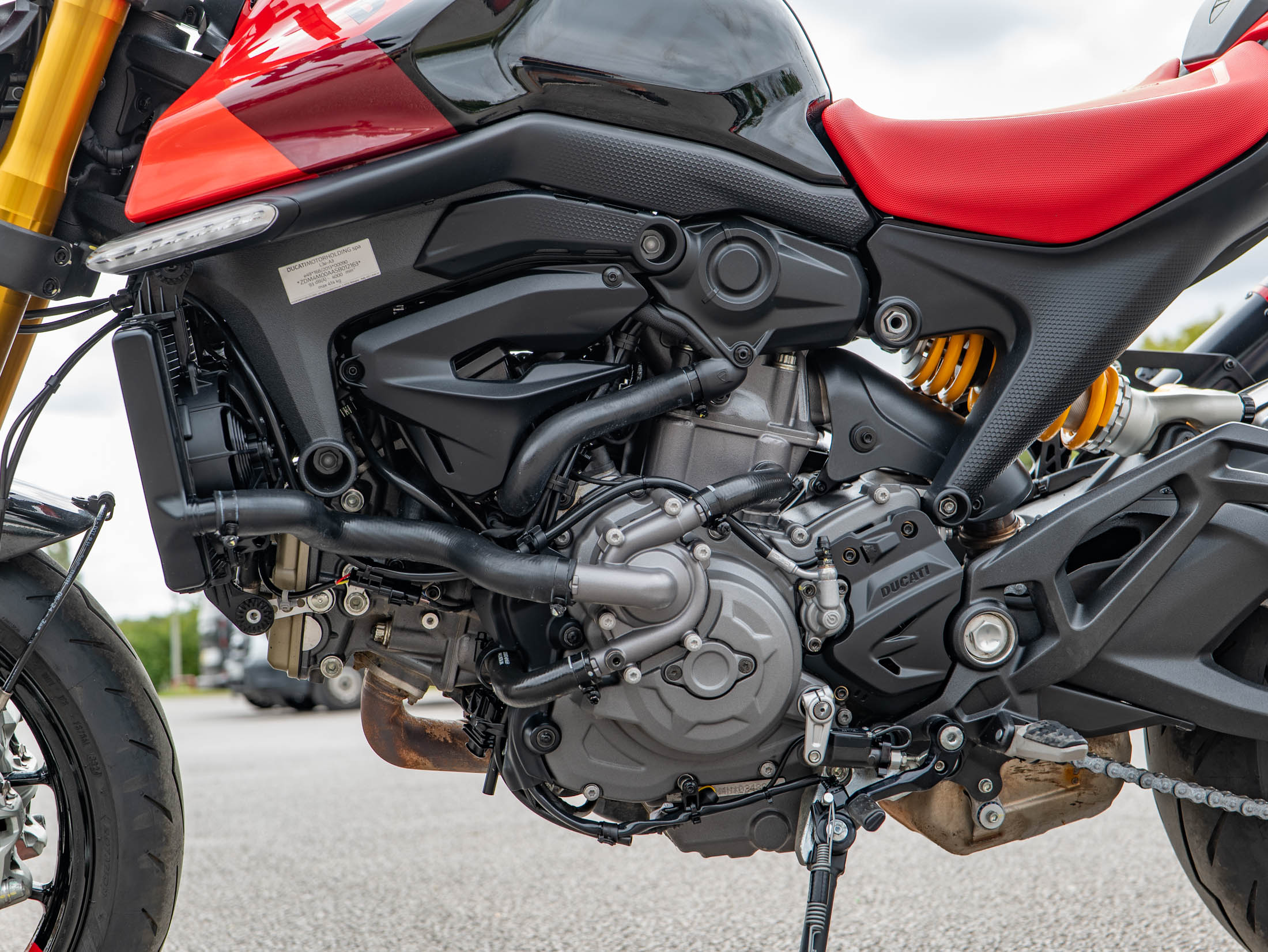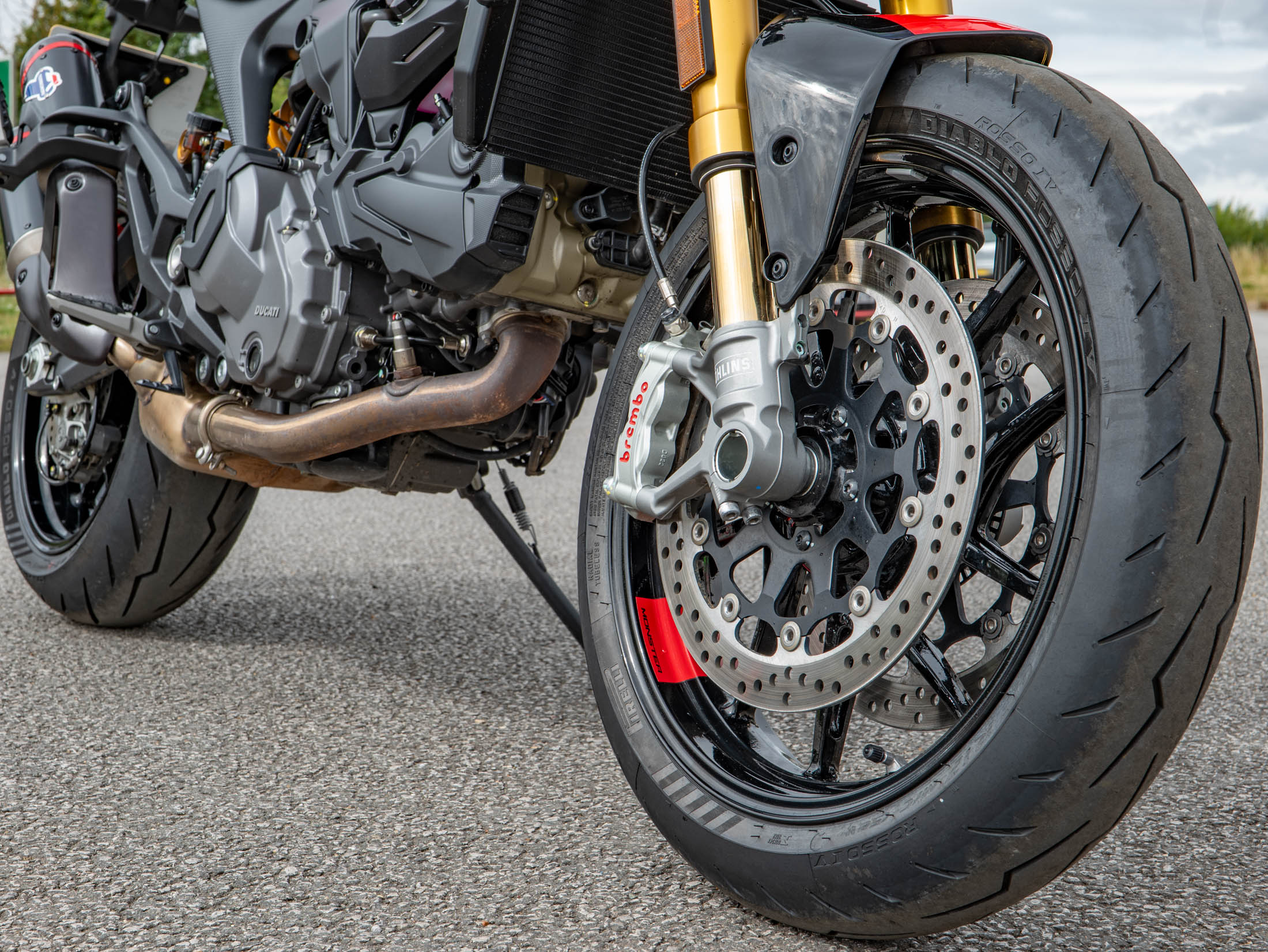 The Monster SP is powered by the spirited 937cc Testastretta 11° V2 engine, which delivers a strong 111 hp through a six-speed manual transmission. The 'SP' designation immediately identifies this machine by its premium running gear, specifically the lightweight, fully adjustable Öhlins NIX 30 front forks and Öhlins rear monoshock. This high-end suspension setup provides superior handling, reduced weight, and cornering confidence compared to the standard Monster, truly elevating the ride experience.