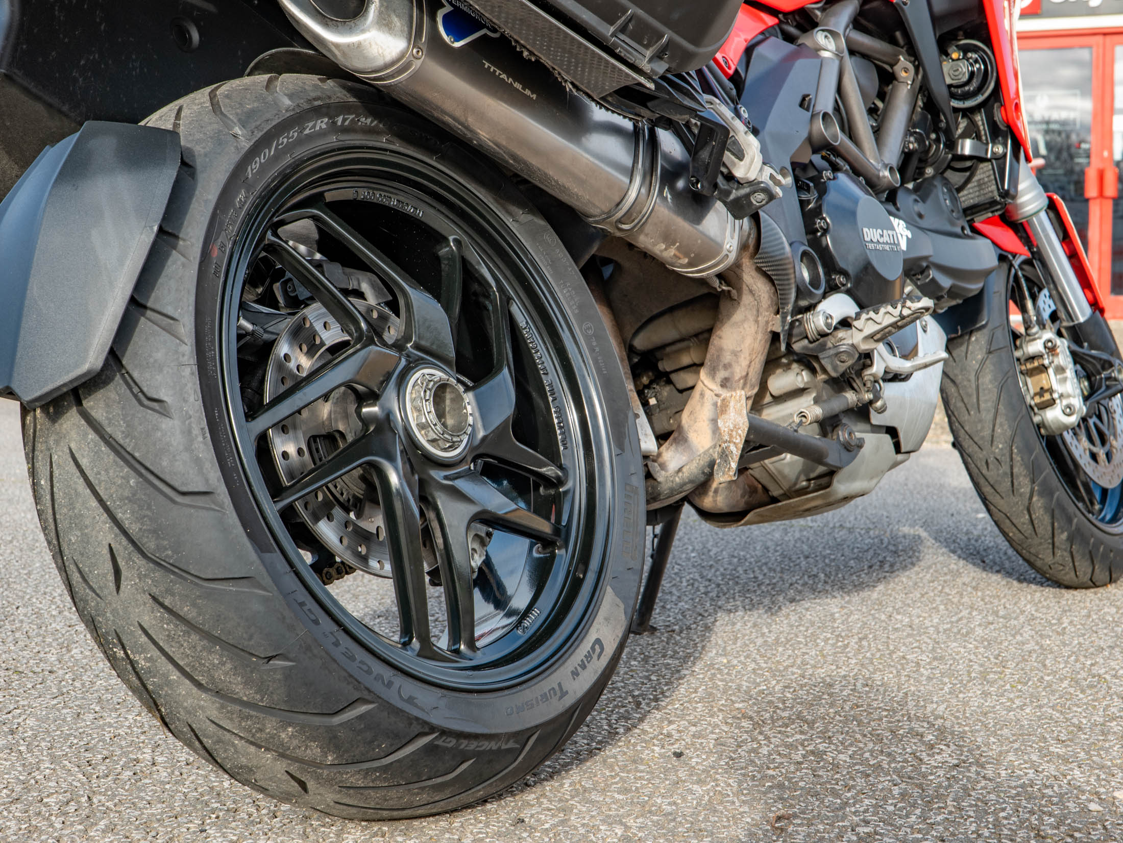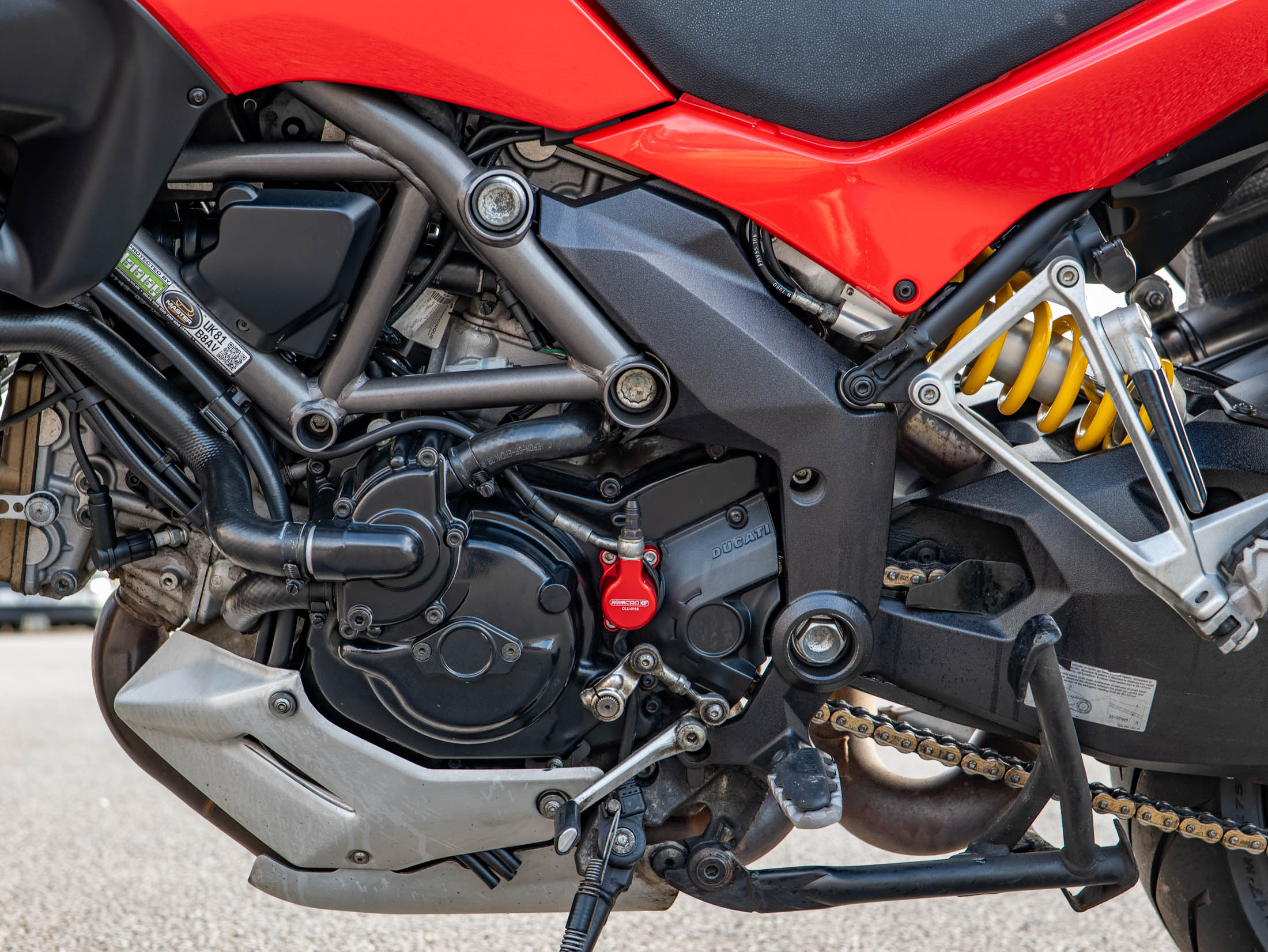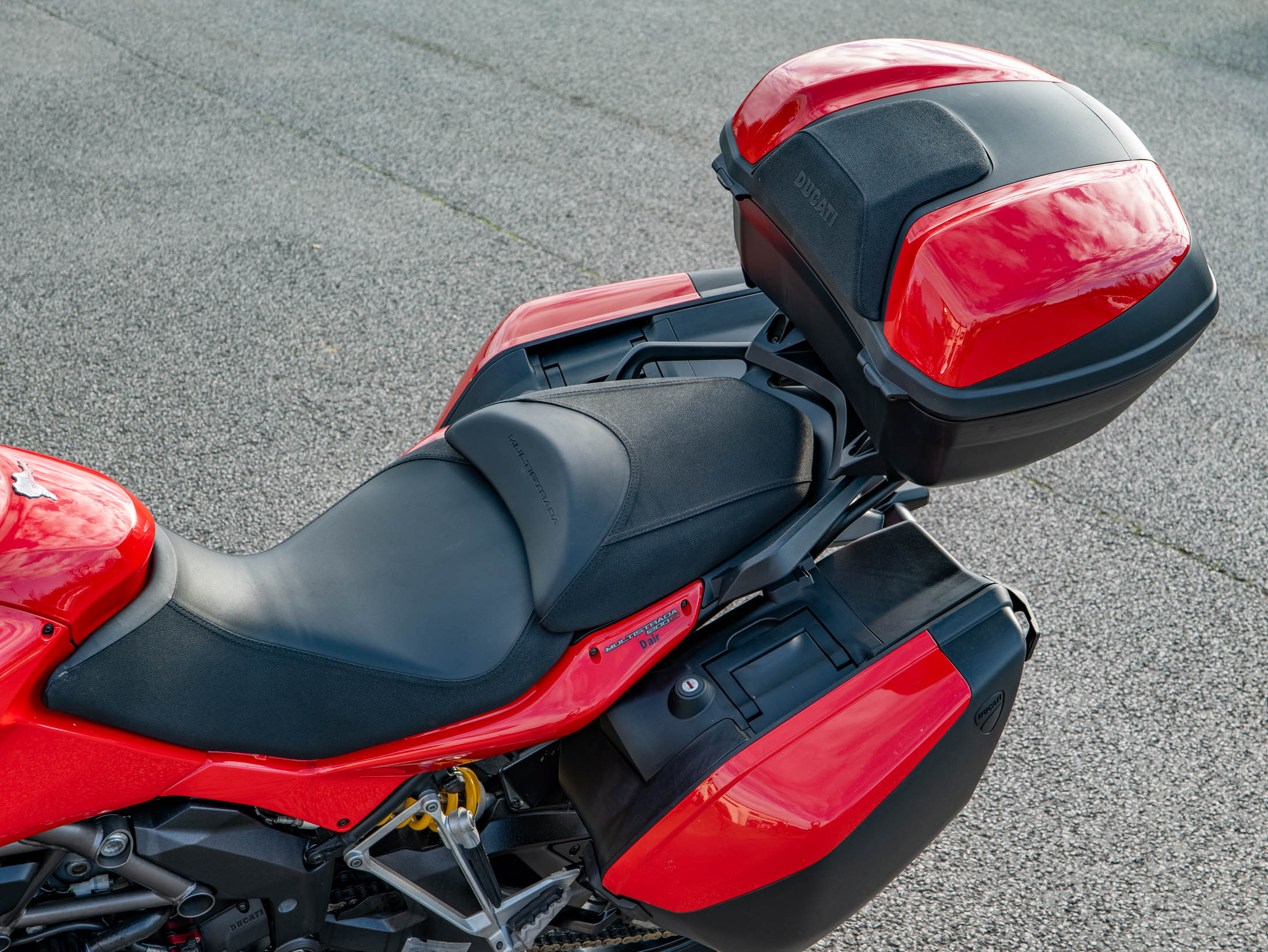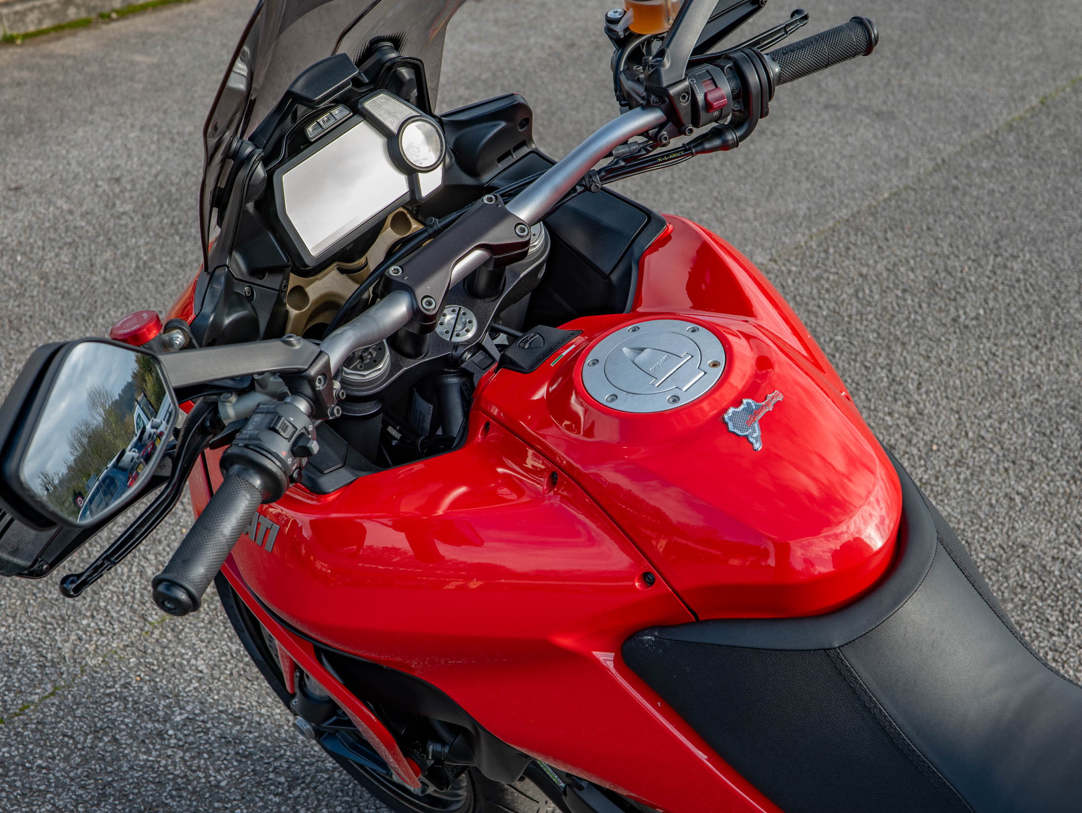 The Multistrada 1200 S is powered by the Testastretta DVT (Desmodromic Variable Timing), liquid-cooled 1198cc V-Twin engine, which produces a thrilling 160 hp through a precise six-speed manual transmission. This engine provides immense, accessible torque and effortless long-distance capability. This is the 'S' Touring model, meaning it benefits from the semi-active Ducati Skyhook Suspension (DSS) and a comprehensive electronics package including Cornering ABS, multi-level Traction Control, and adjustable Riding Modes.