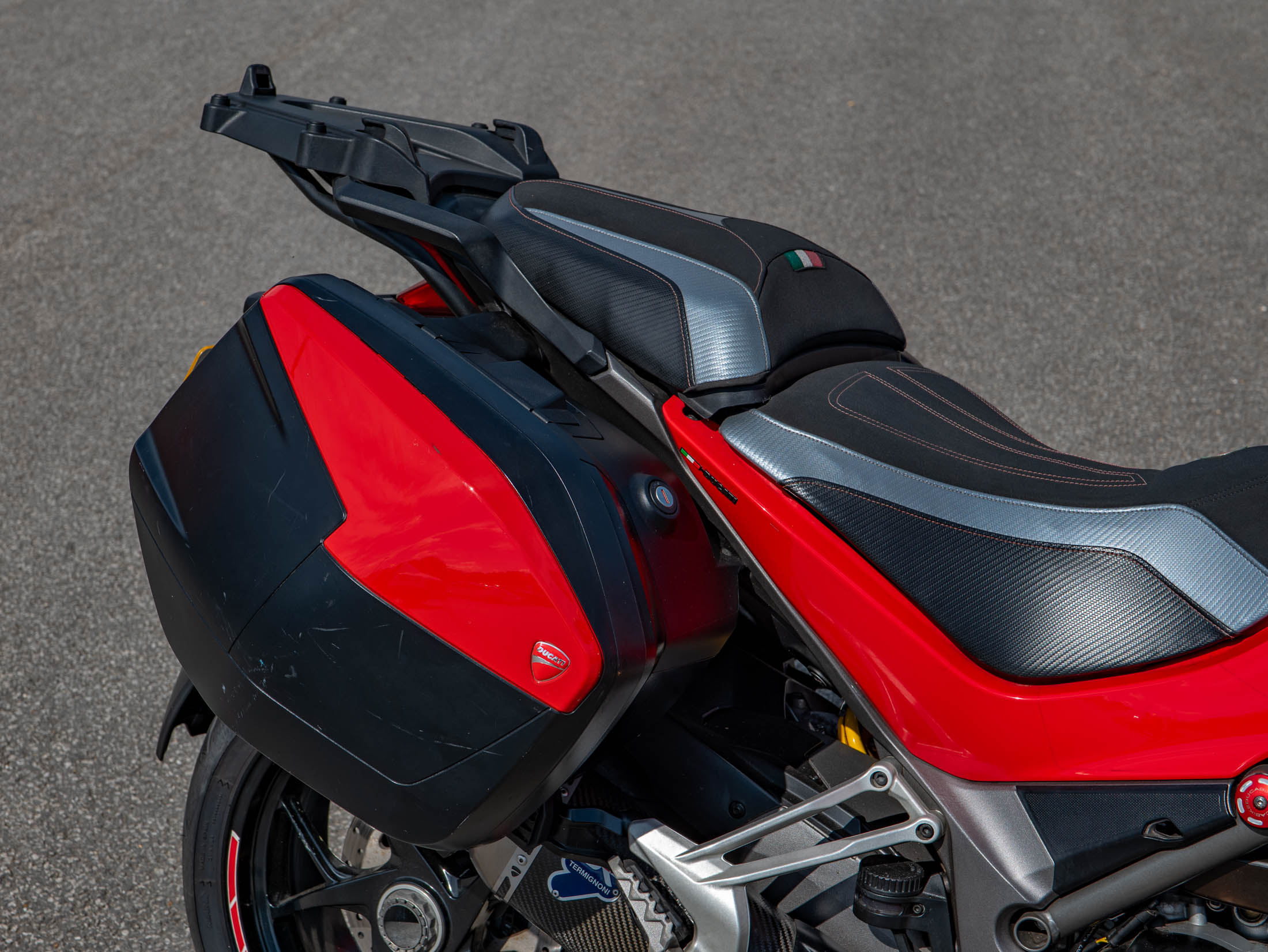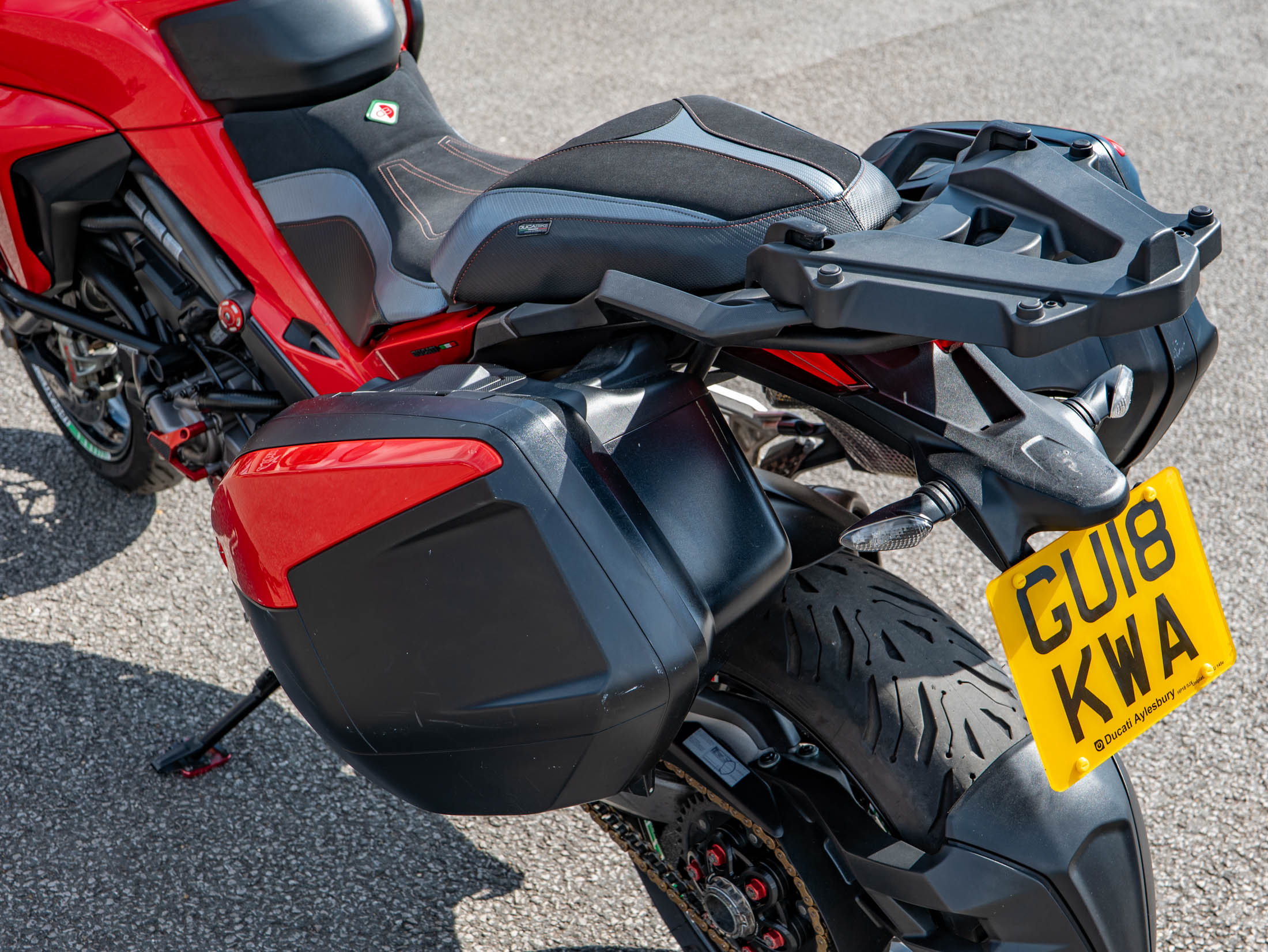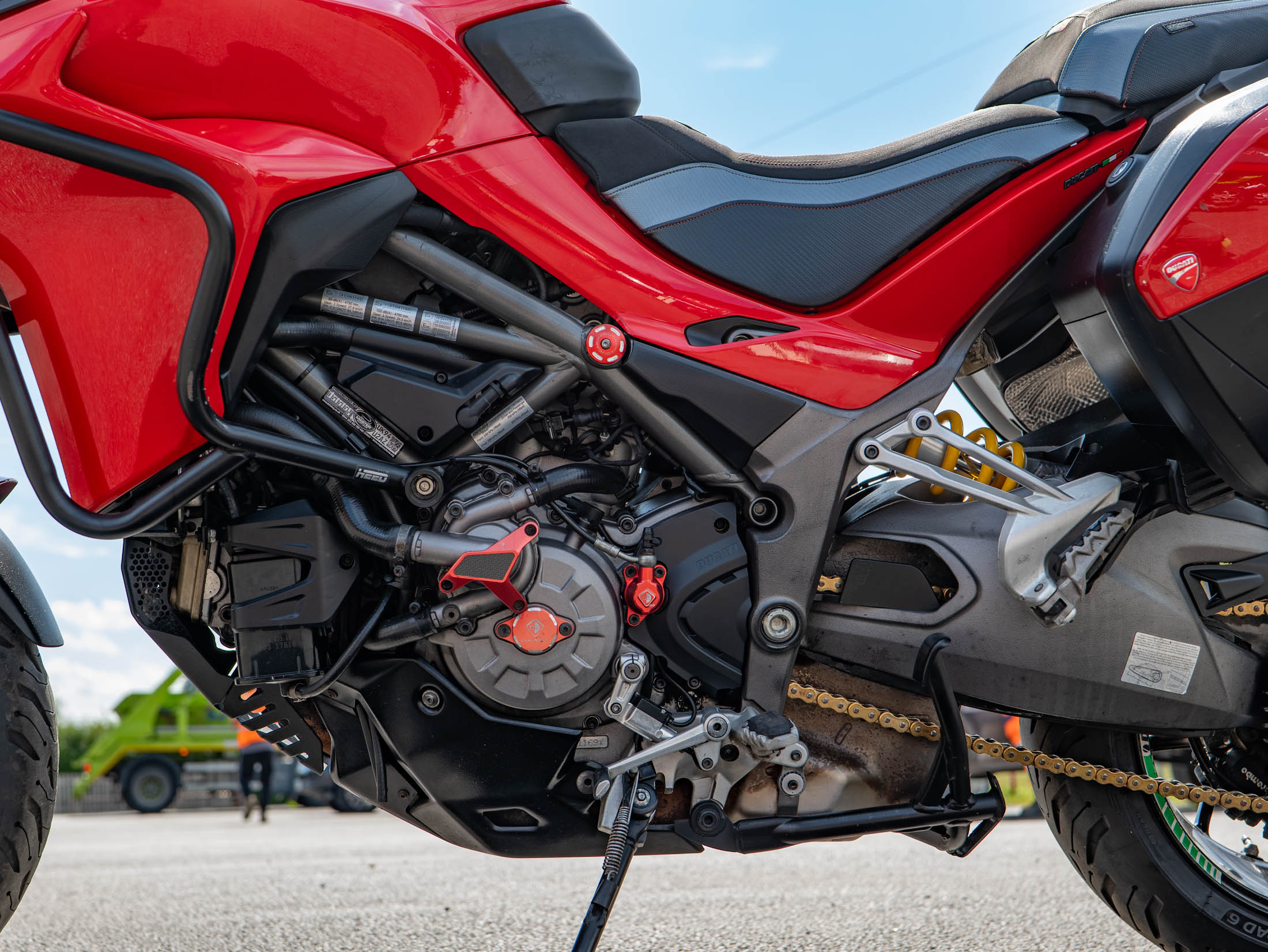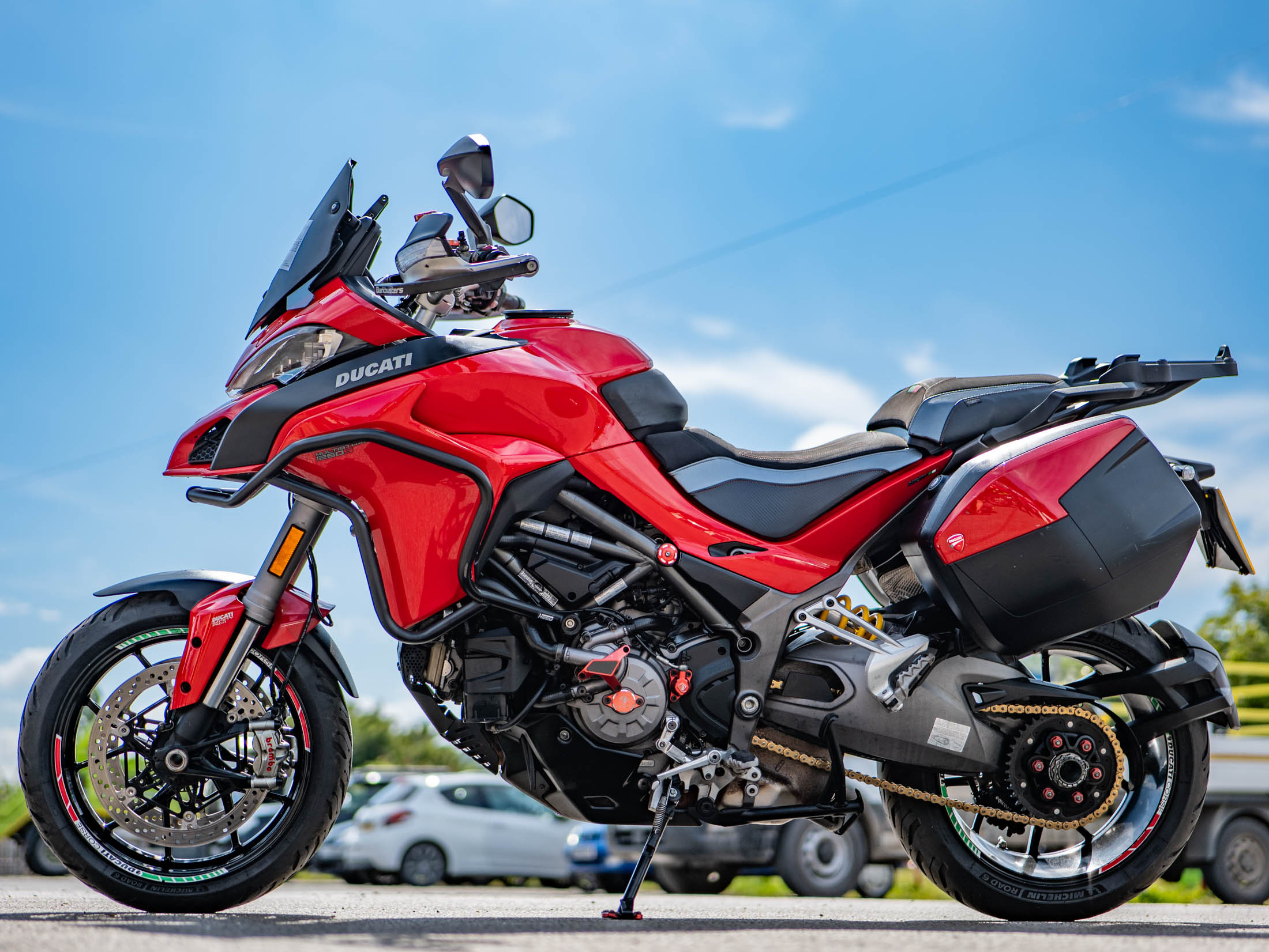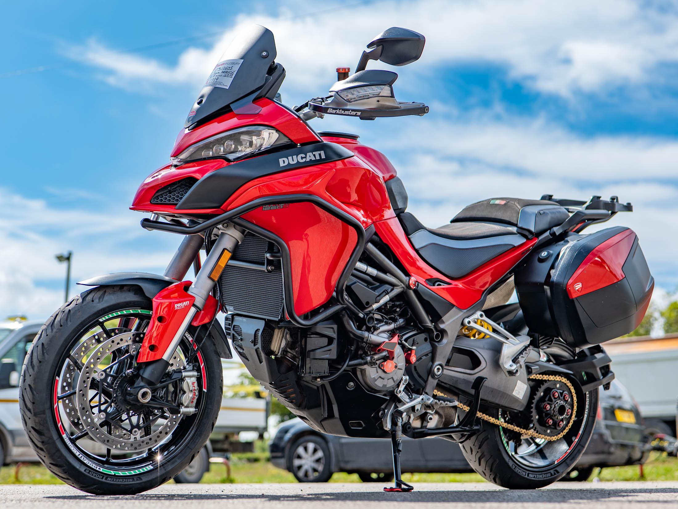 This particular Multistrada 1260 S is further enhanced with a host of desirable upgrades. It features a throaty Termignoni silencer (performance exhaust) for that unmistakable Ducati roar, a unique clear clutch cover that showcases the internal workings, and robust engine bars for added protection. Comfort is elevated by comfort seats and practical heated grips, while long-distance capability is boosted by a rear rack for luggage. The bike also sports a stylish gold chain, protective Barkbusters handguards, and precision-engineered Evotech rad guards.