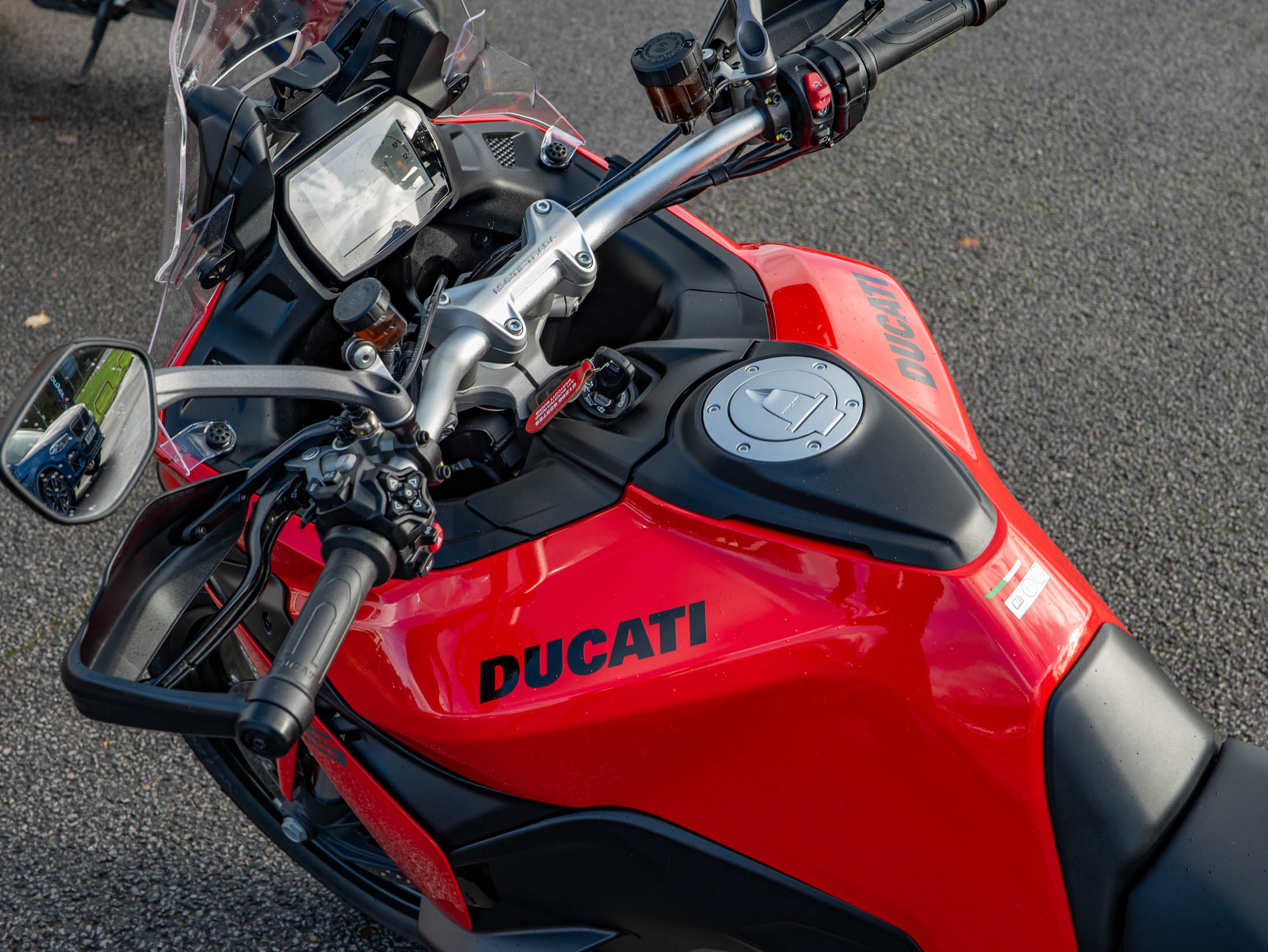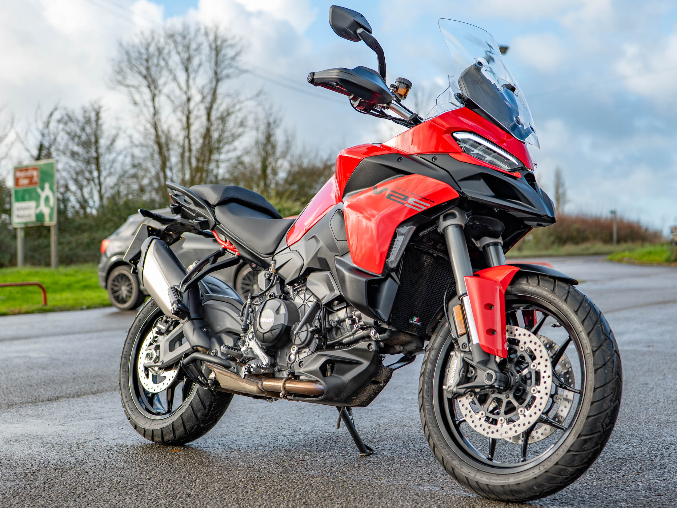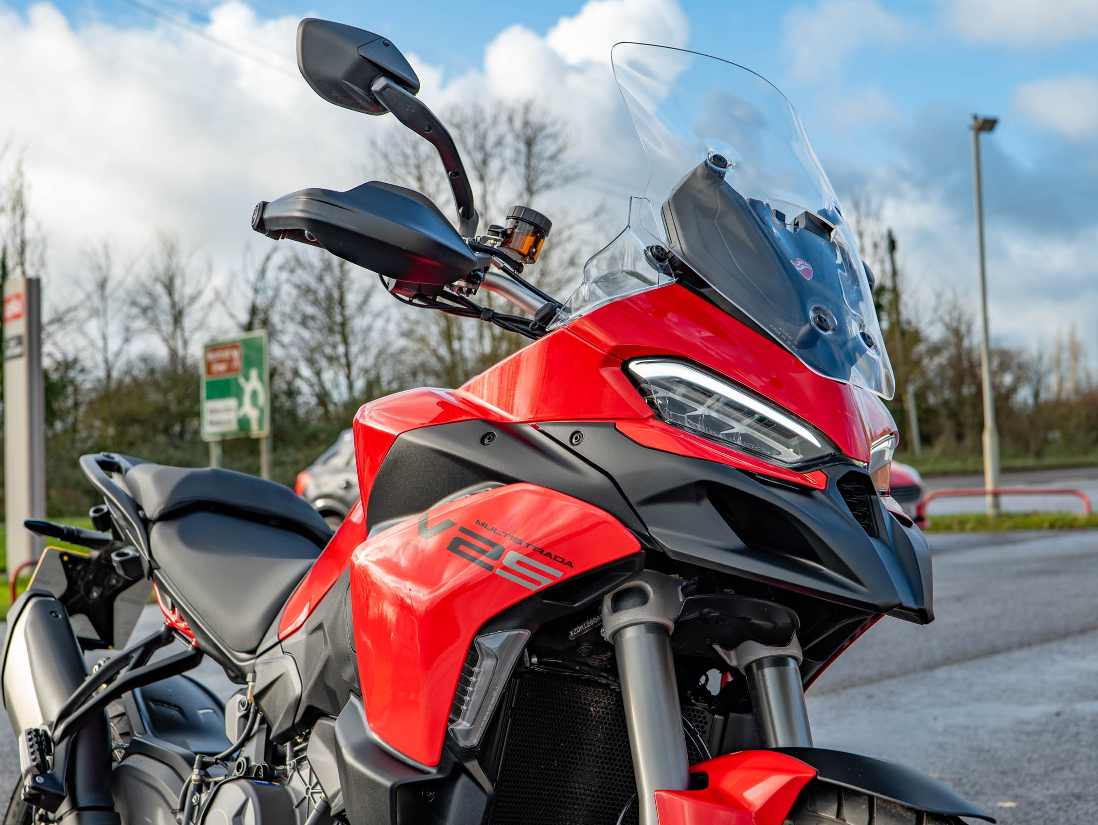 The rider experience is exceptional, thanks to the comprehensive electronics package featuring Cornering ABS, multiple Riding Modes, Ducati Traction Control (DTC), and Ducati Wheelie Control (DWC). This specific machine is further enhanced with highly desirable accessories for all-weather comfort and protection, including genuine Heated Grips and an Evotech Rad Guard for engine protection. For added security, the bike is fitted with a BikeTrac unit and also includes the practical Centre Stand and Hand Guards, making it fully equipped for any journey. The Multistrada V2 S is intuitive, comfortable, and offers Ducati performance in a truly accessible package.