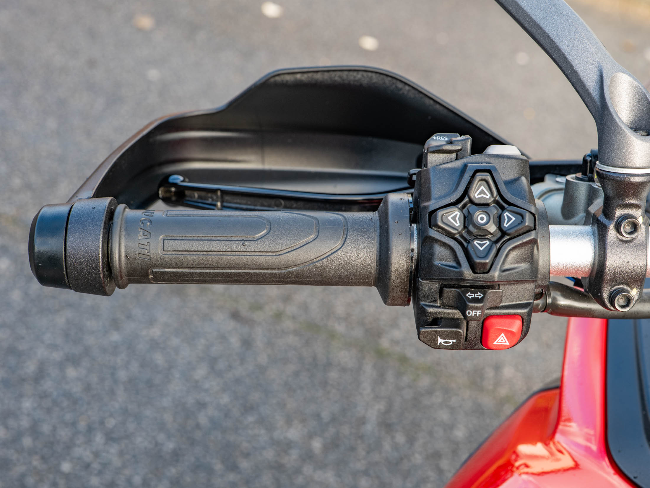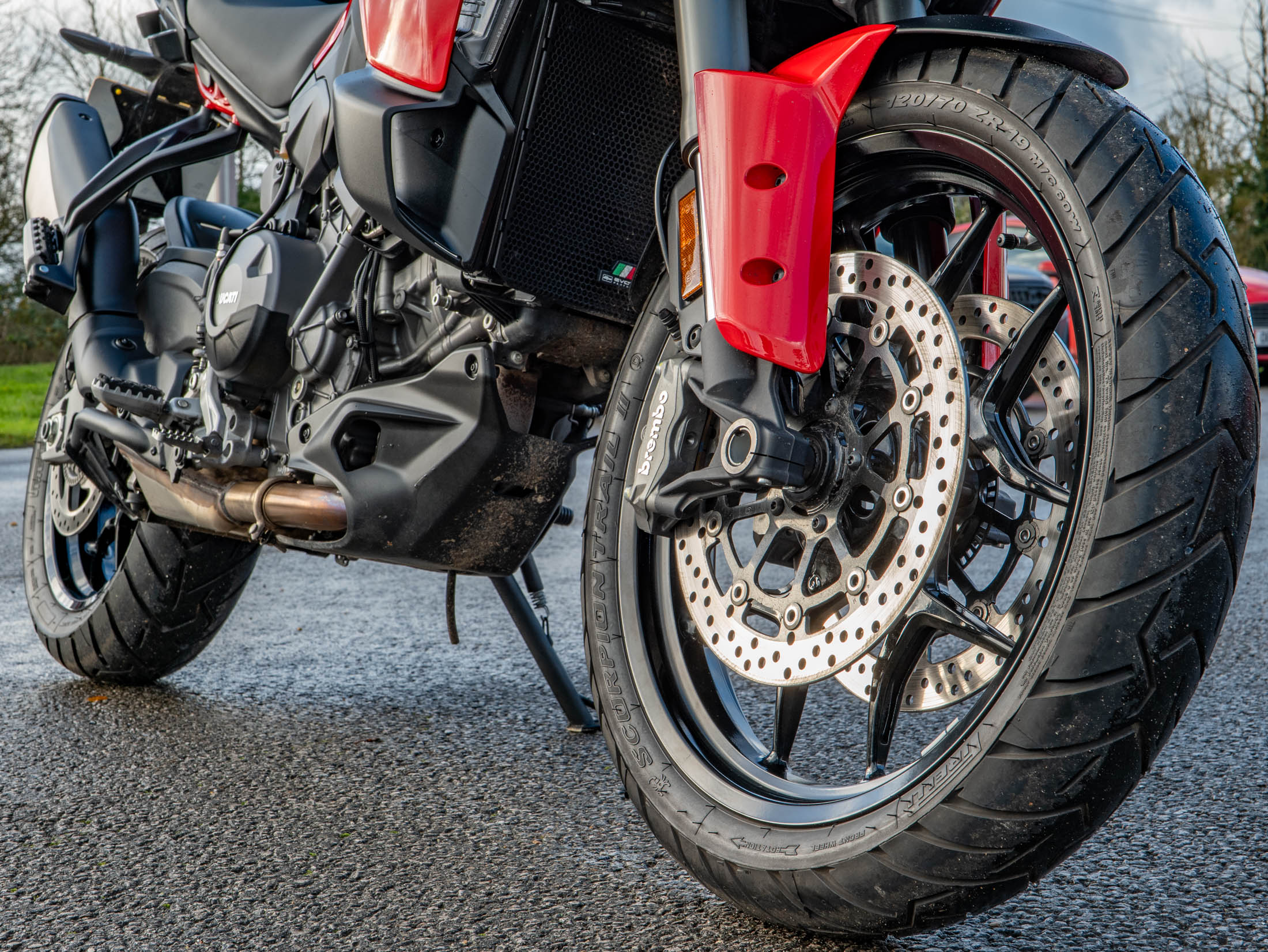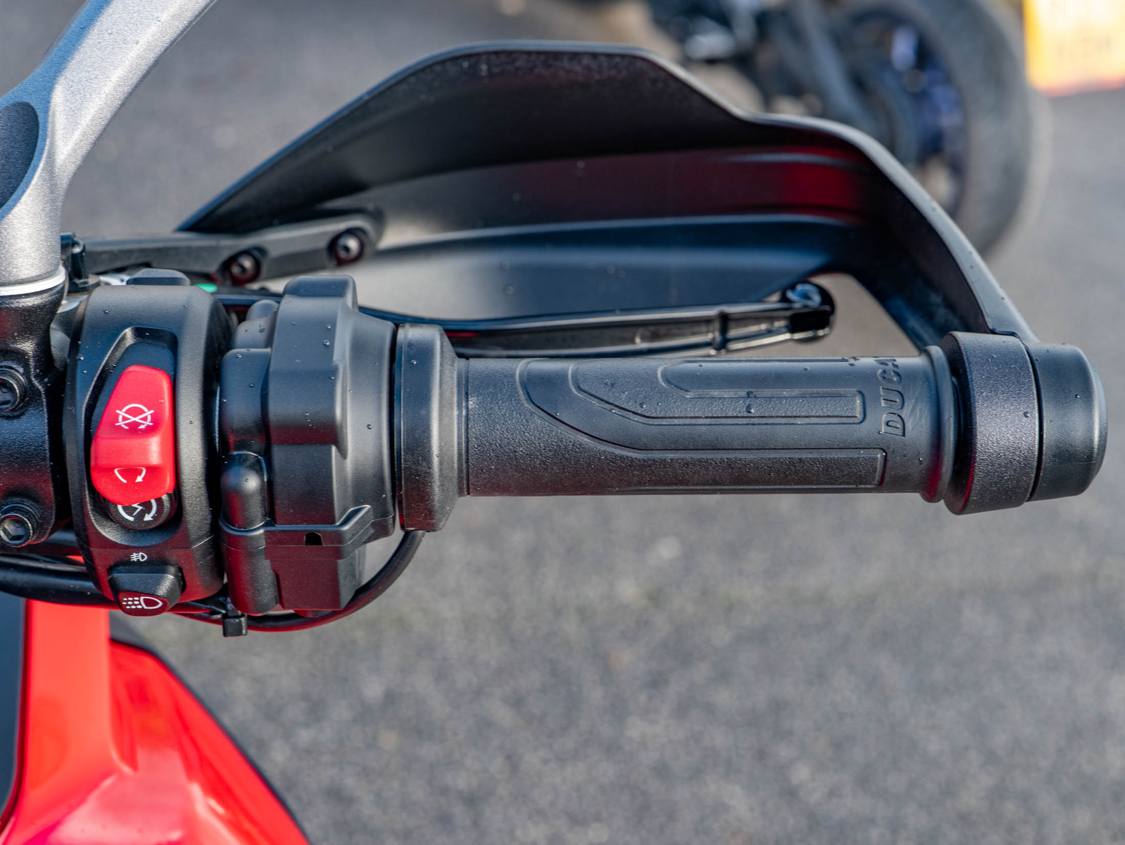 The rider experience is exceptional, thanks to the comprehensive electronics package featuring Cornering ABS, multiple Riding Modes, Ducati Traction Control (DTC), and Ducati Wheelie Control (DWC). This specific machine is further enhanced with highly desirable accessories for all-weather comfort and protection, including genuine Heated Grips and an Evotech Rad Guard for engine protection. For added security, the bike is fitted with a BikeTrac unit and also includes the practical Centre Stand and Hand Guards, making it fully equipped for any journey. The Multistrada V2 S is intuitive, comfortable, and offers Ducati performance in a truly accessible package.