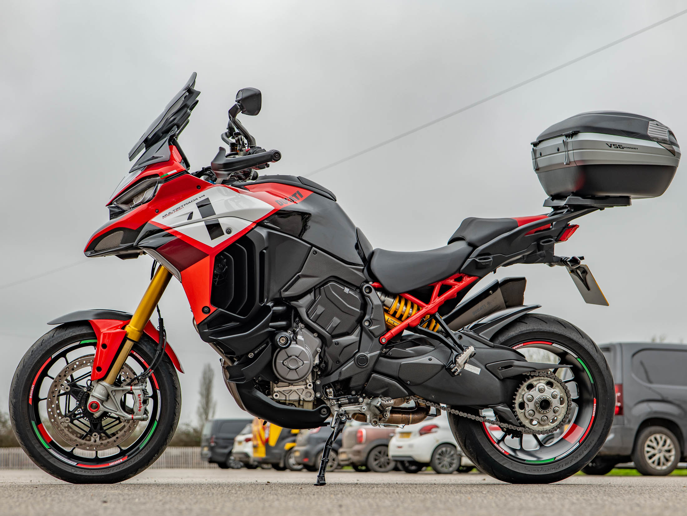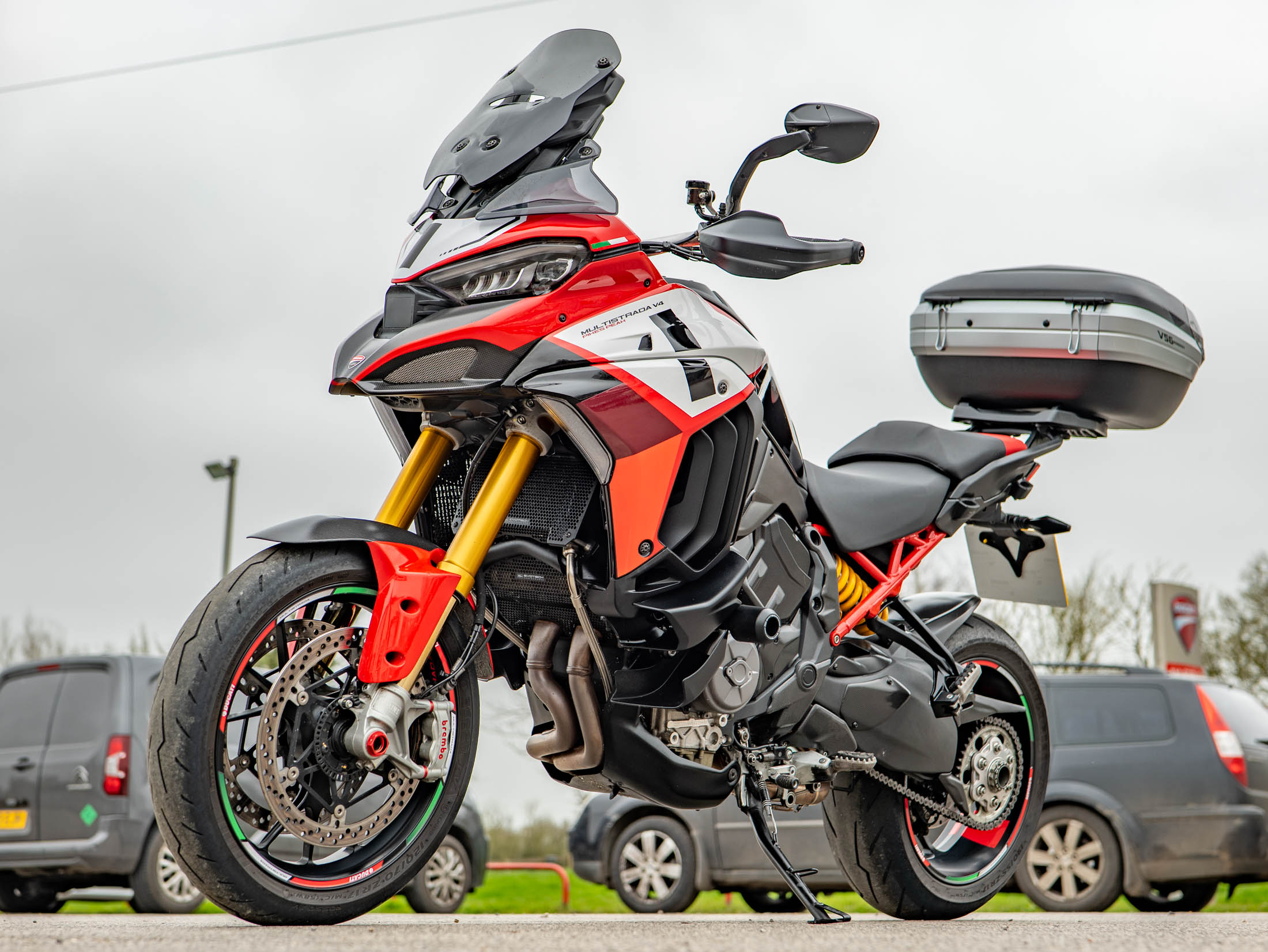Unrivalled 170 hp MotoGP-inspired Adventure-Sport, 1 owner from new with premium touring upgrades. Available now at On Yer Bike / Ducati Aylesbury near Aylesbury, this 2022 Ducati Multistrada V4 Pikes Peak is the ultimate expression of the "sportiest Multistrada ever." Finished in the iconic multi-coloured Pikes Peak livery—inspired by the Desmosedici GP—this one-owner machine has covered 13,500 miles and is supported by a full service history. As the pinnacle of the V4 range, the Pikes Peak transforms the versatile Multistrada into a 17-inch wheeled, apex-hunting weapon.