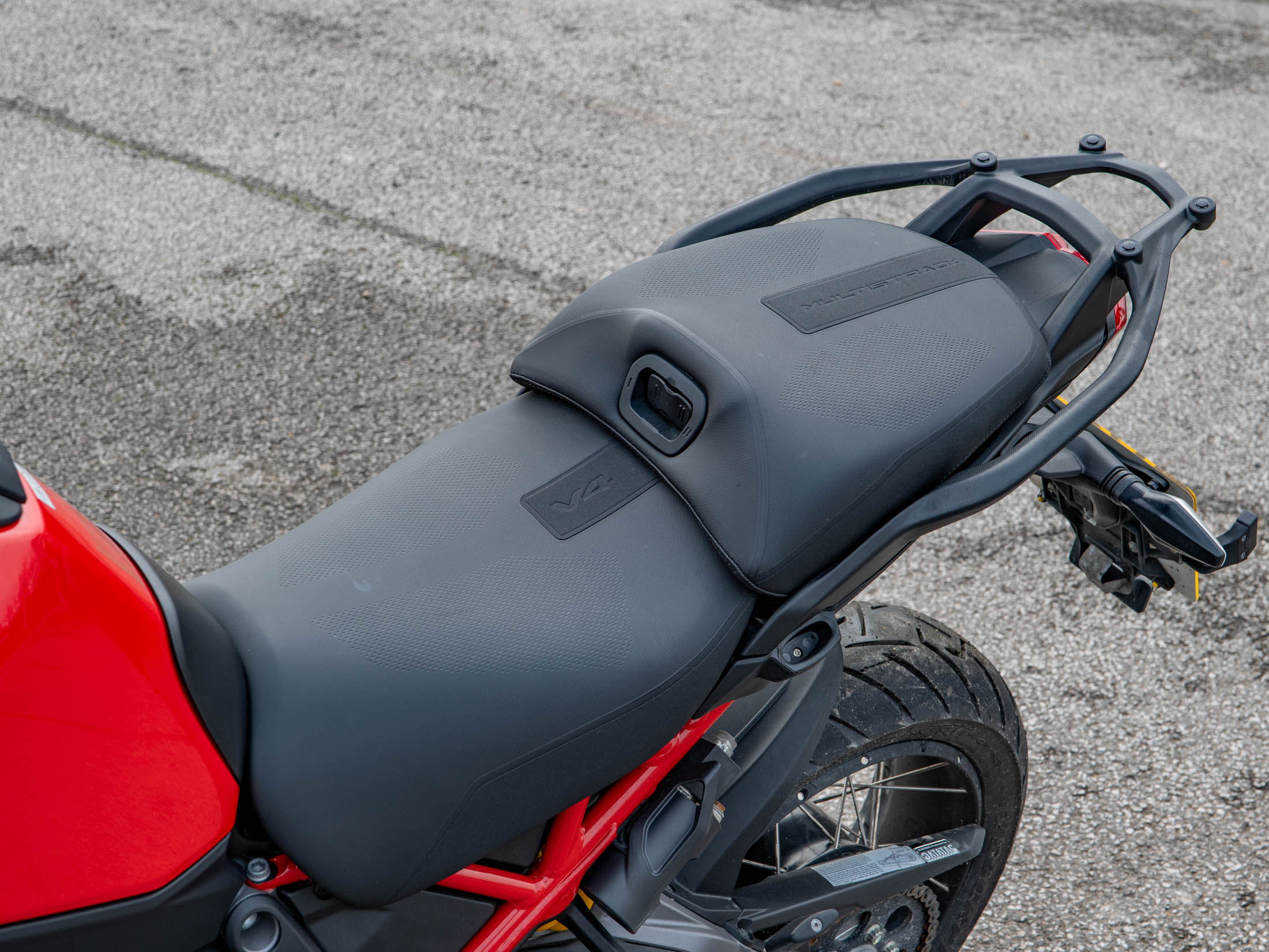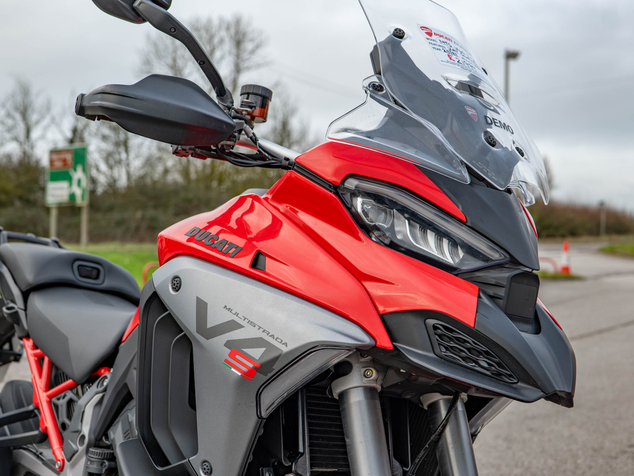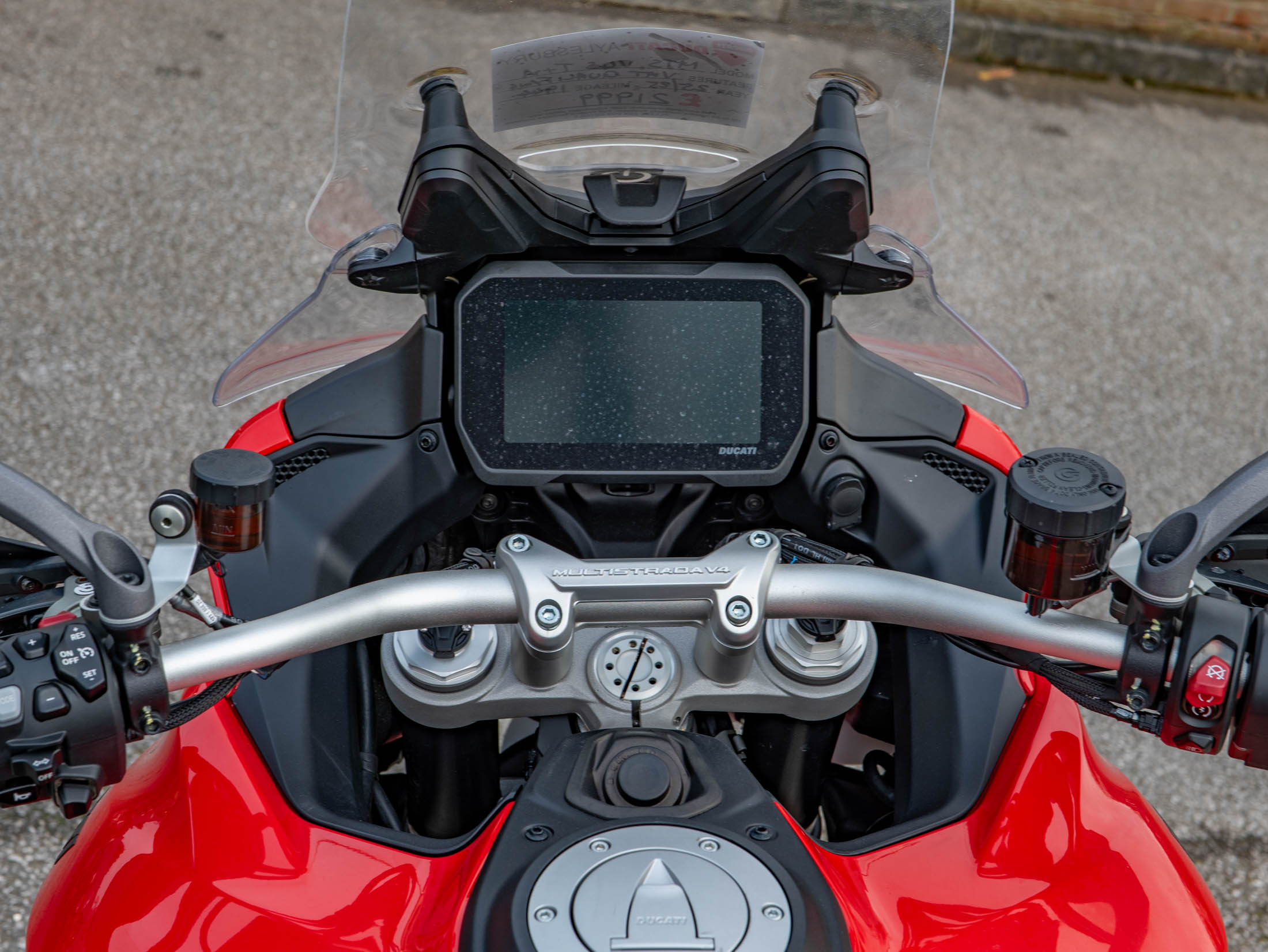 Riding the Multistrada V4 S is an experience that redefines the adventure-sport category. The 1158cc V4 Granturismo engine is a marvel of engineering, delivering a massive 170 hp with a smoothness that makes long-distance travel feel effortless. The ride is characterised by its incredible versatility; whether you are carving through mountain passes in Sport mode or cruising the motorway in Touring mode, the semi-active Skyhook suspension adapts in real-time to provide the perfect balance of support and comfort. This 2025 model features the new automatic lowering device, which reduces the seat height at low speeds to make handling this high-tech machine even more intuitive when coming to a halt.