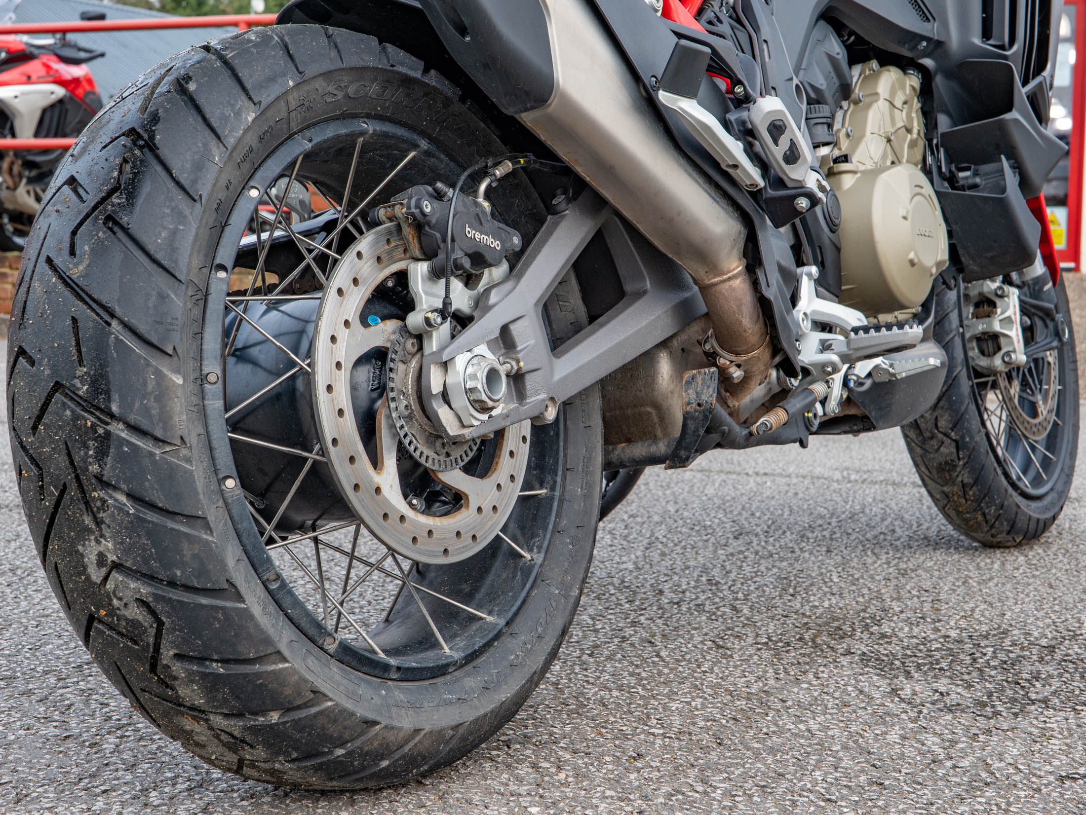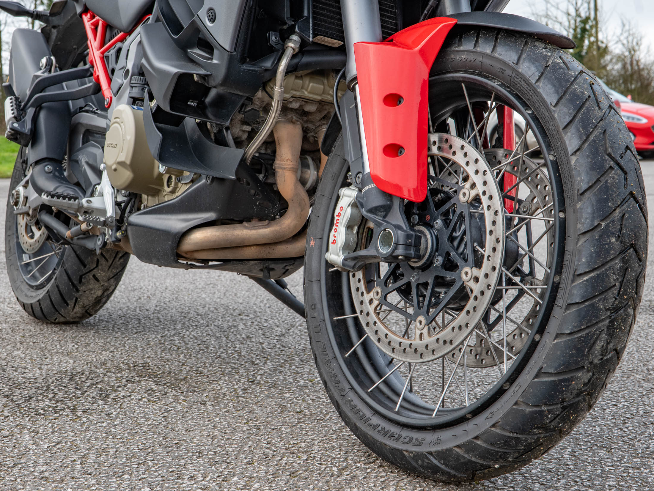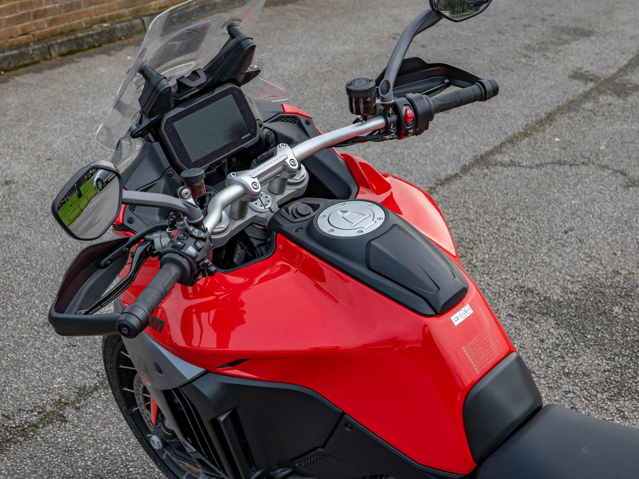 This Adventure and Travel edition is specified to the highest level, featuring the robust aluminium side cases which have never even been fitted, ensuring they are in pristine condition for your first trip. The bike is packed with premium comfort and safety features, including heated grips and heated seats for both the rider and passenger, making it a true four-season tourer. Safety is paramount with the integrated front and rear radar system, providing adaptive cruise control and blind-spot detection. The inclusion of spoked wheels adds to the rugged aesthetic and off-road capability, while the centre stand and hand guards provide the practical touches expected of a premium Ducati tourer.