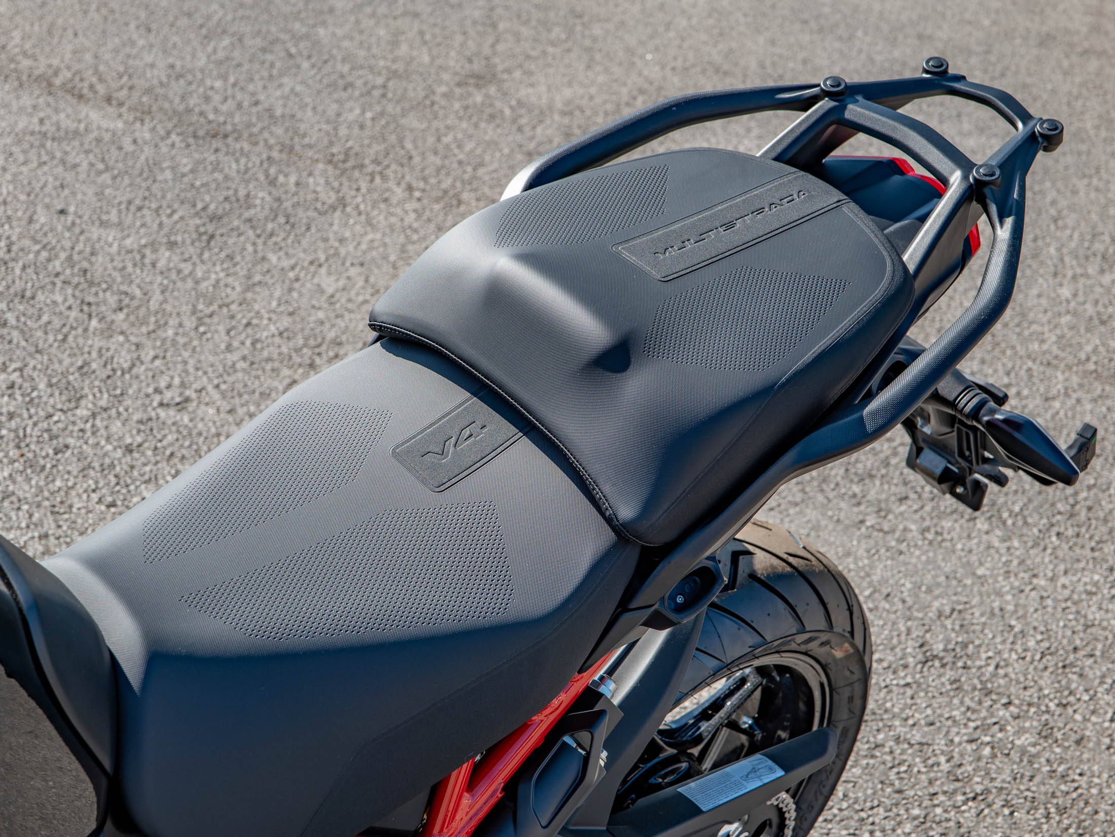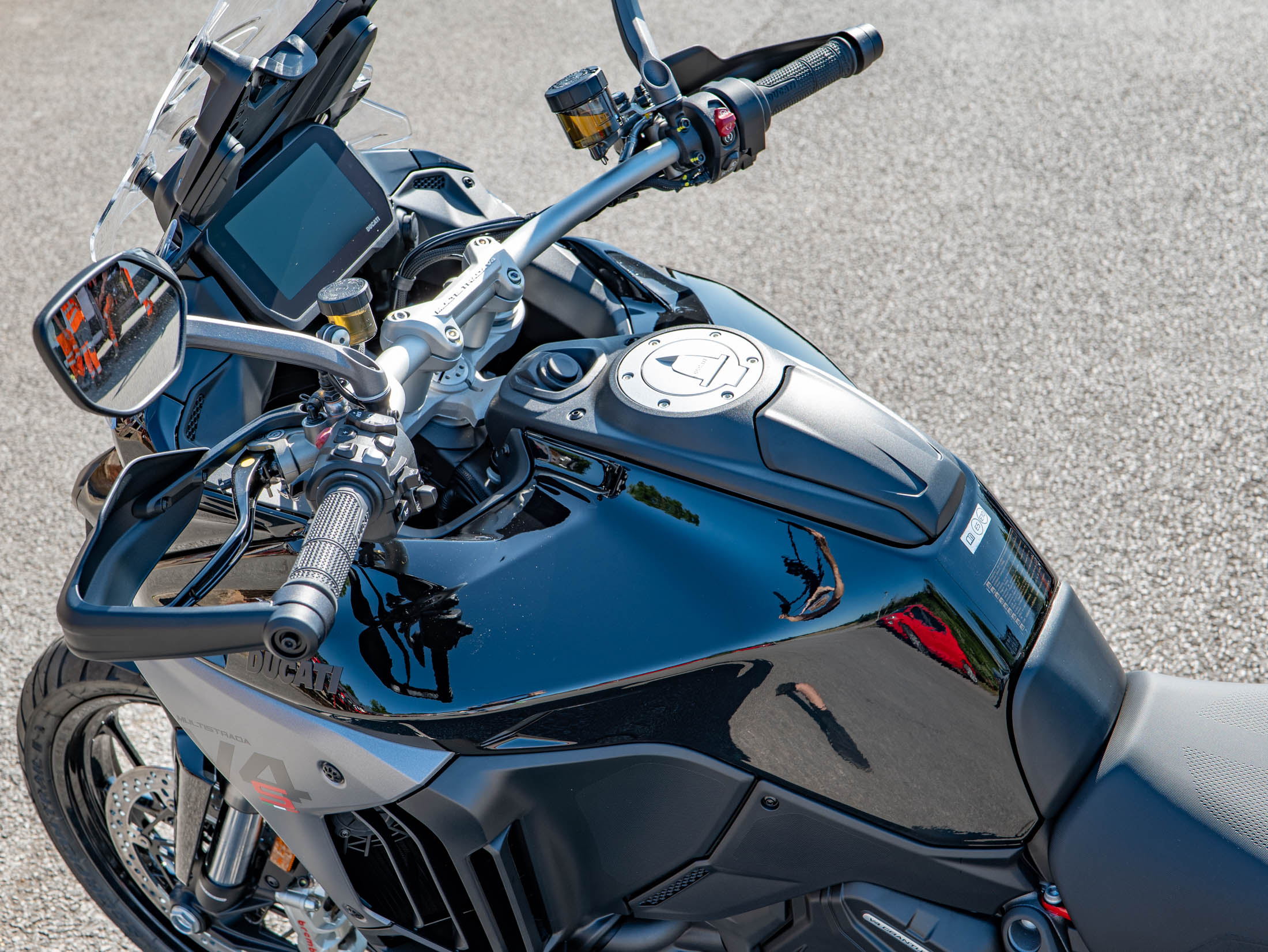 The Multistrada V4 S is packed with a comprehensive electronics suite, offering selectable Riding Modes (Sport, Touring, Urban, Enduro) and Power Modes to tailor performance. It includes advanced safety features such as Ducati Traction Control (DTC) EVO, Ducati Wheelie Control (DWC) EVO, and lean-angle sensitive Cornering ABS. For added convenience, you'll find Vehicle Hold Control (VHC) and Hands-Free ignition. All vital information is displayed on a vibrant 6.5-inch full-colour TFT display with Ducati Connect (smartphone mirroring), complemented by full LED lighting with DRL and Ducati Cornering Lights (DCL) for excellent visibility.