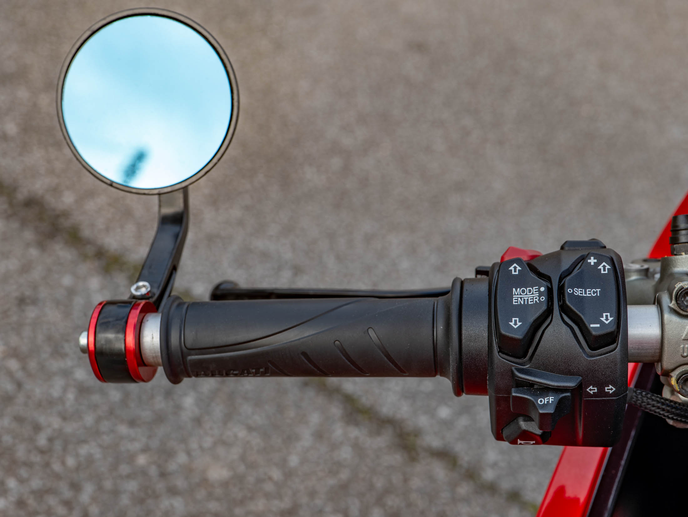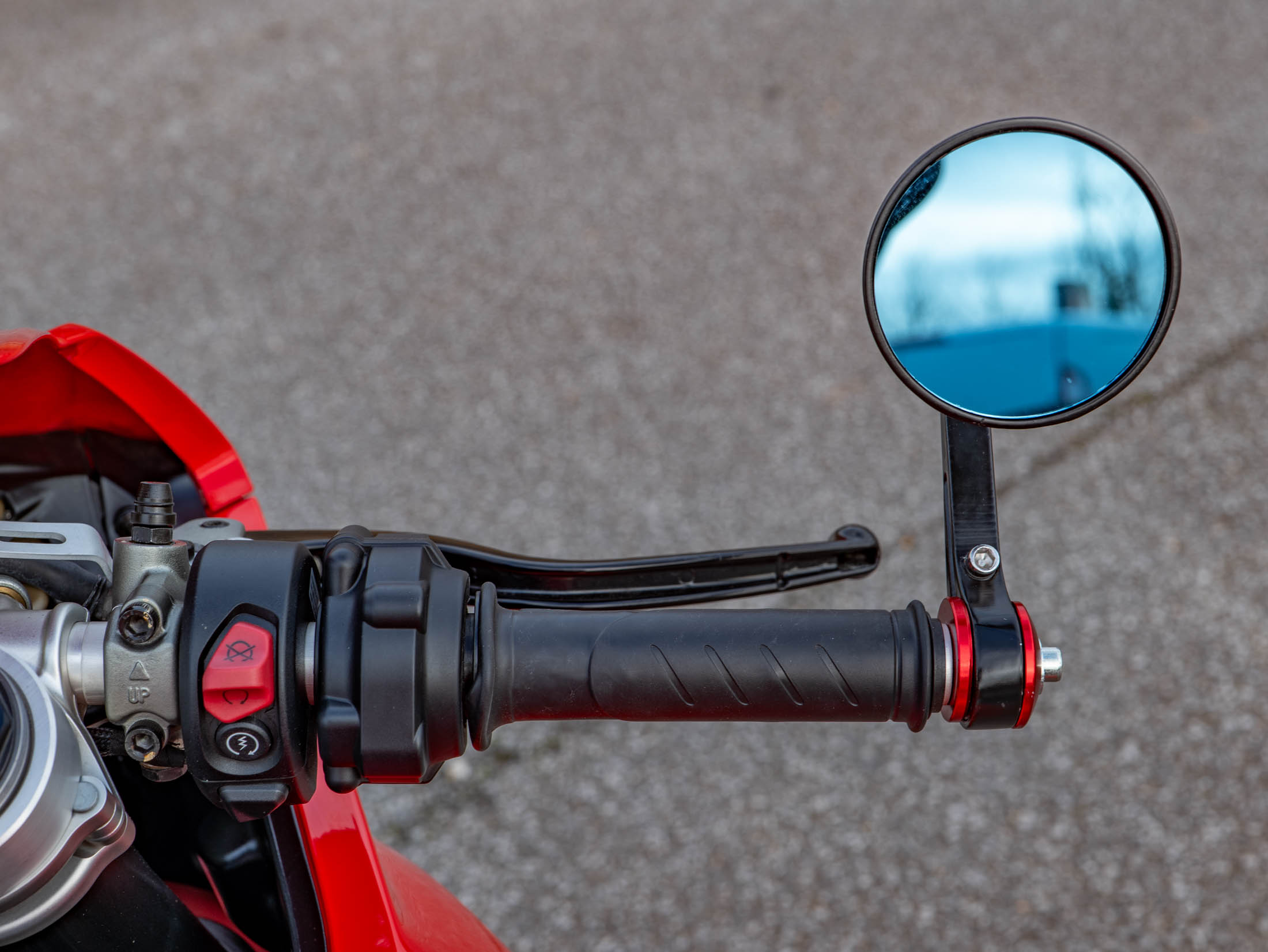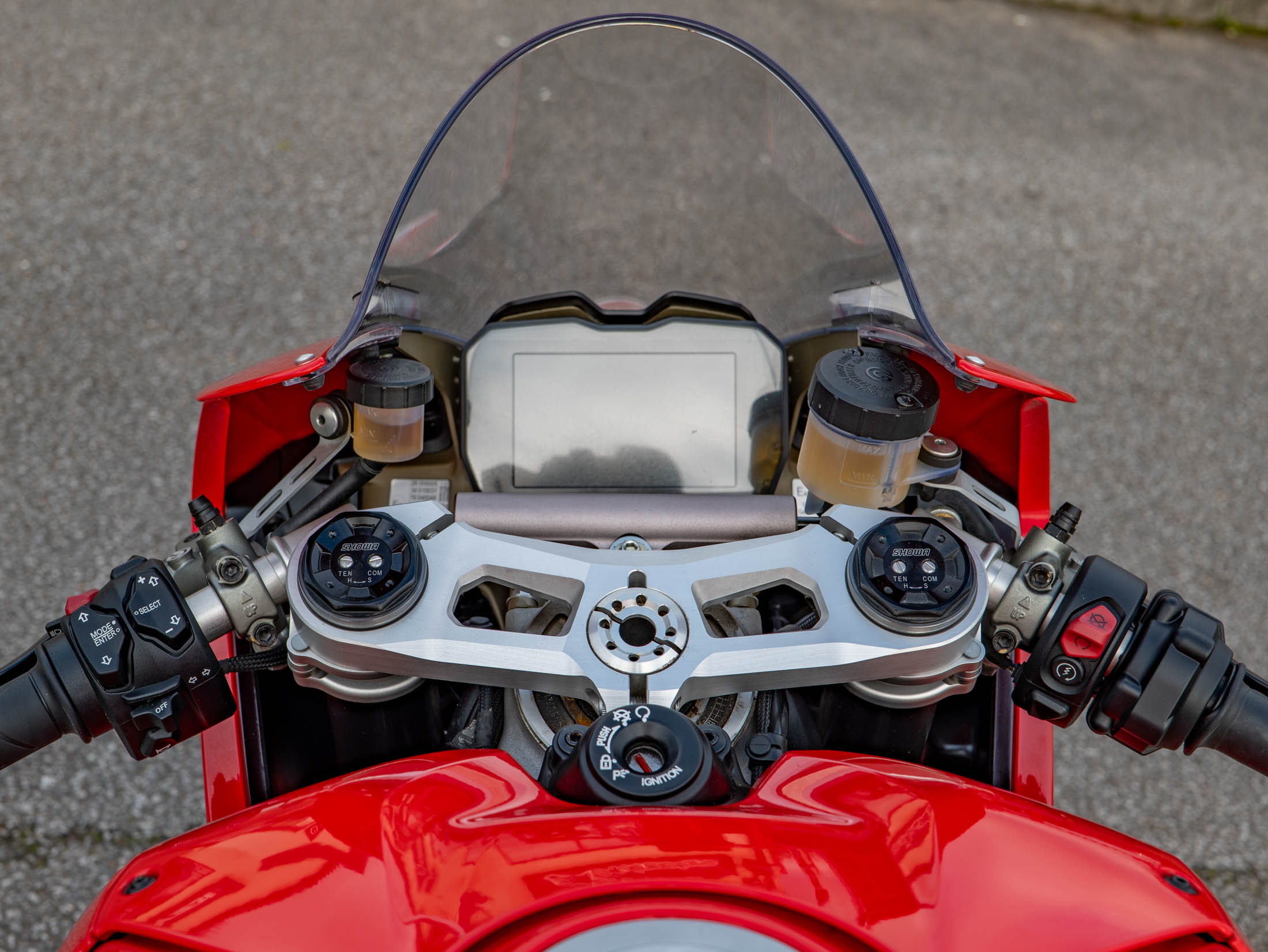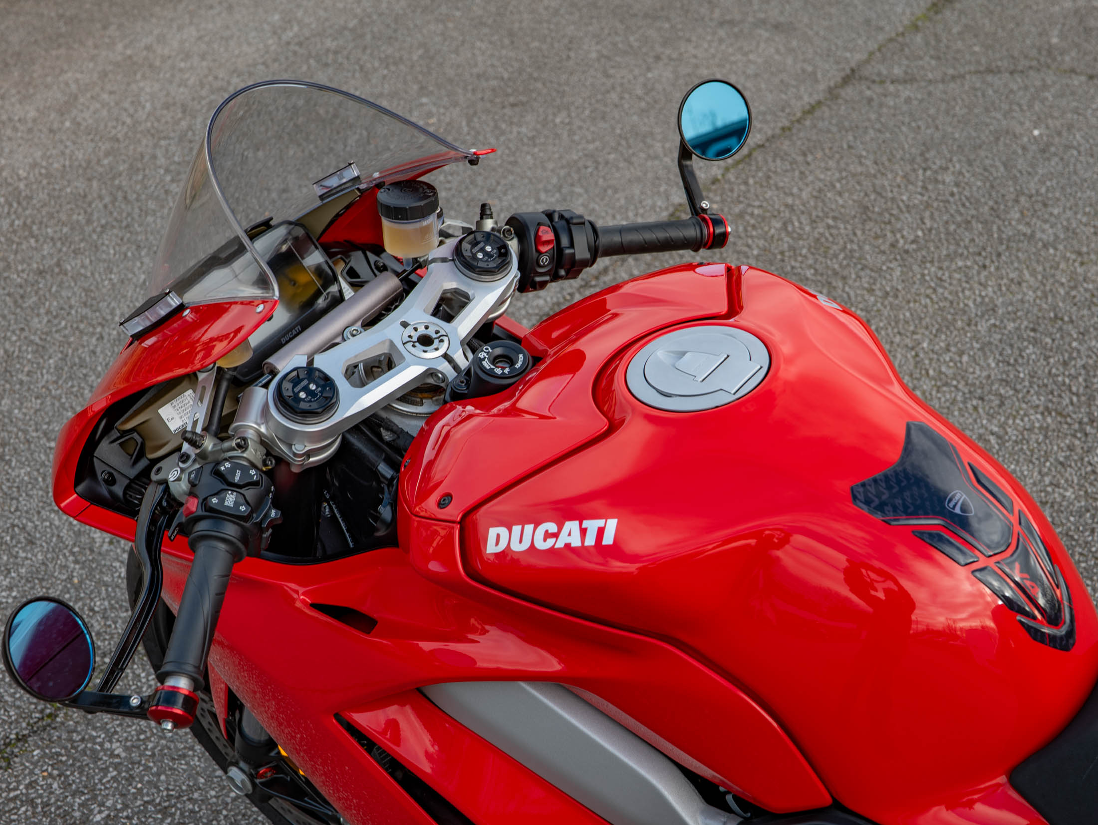 A standout feature on this specific bike is the stunning NiceCNC Clear Clutch Cover, offering an exposed view of the spinning clutch assembly, a fantastic aesthetic upgrade that showcases the bike's mechanical beauty. Further tasteful upgrades include a sporty Tail Tidy to clean up the rear end, Bar End Mirrors for a more aggressive look, and a Tank Pad for paint protection. Control is maintained through a standard Steering Damper. The combination of ultra-low mileage, certified service history, and desirable visual enhancements makes this V4 a truly desirable proposition for any enthusiast.