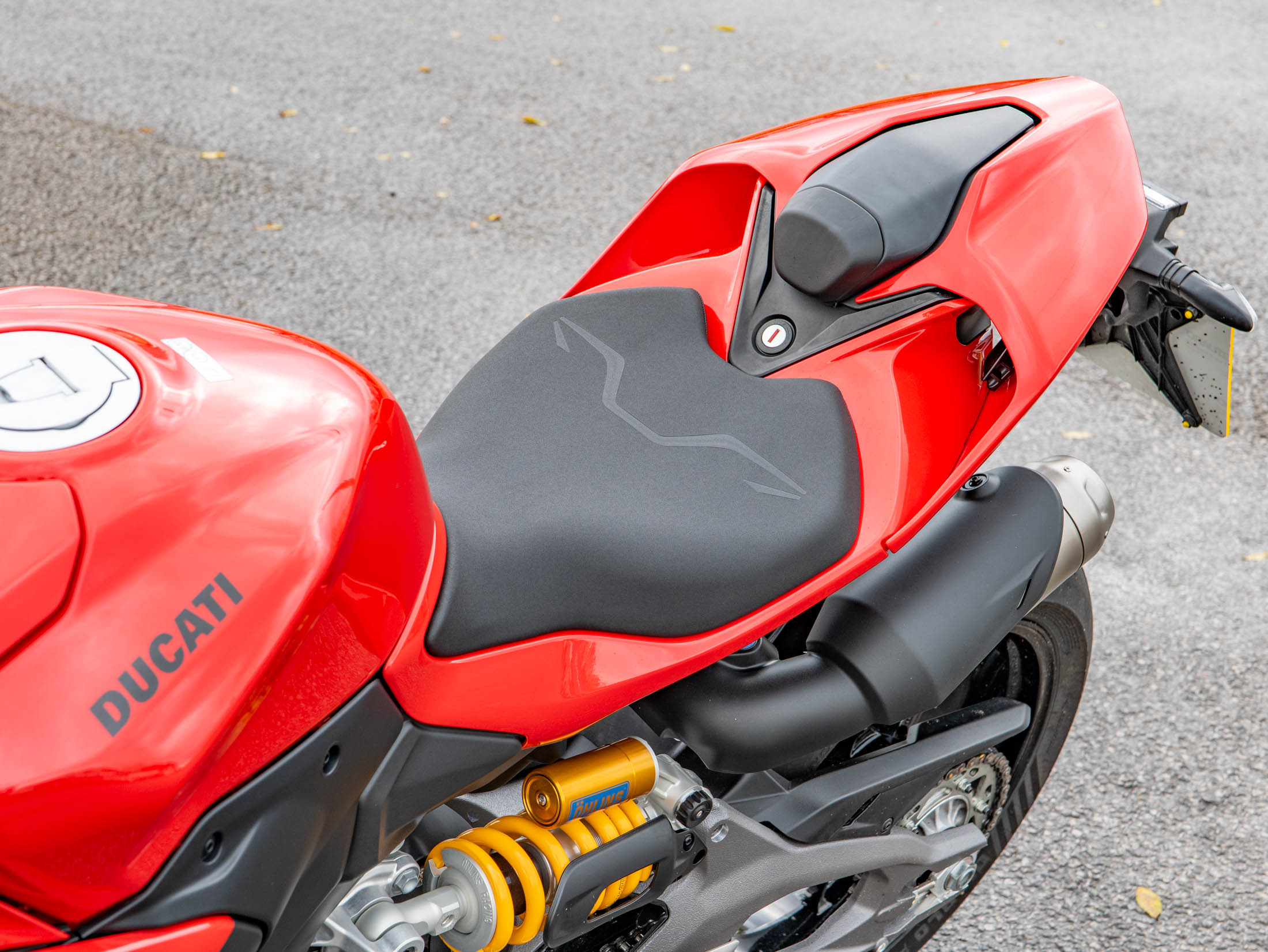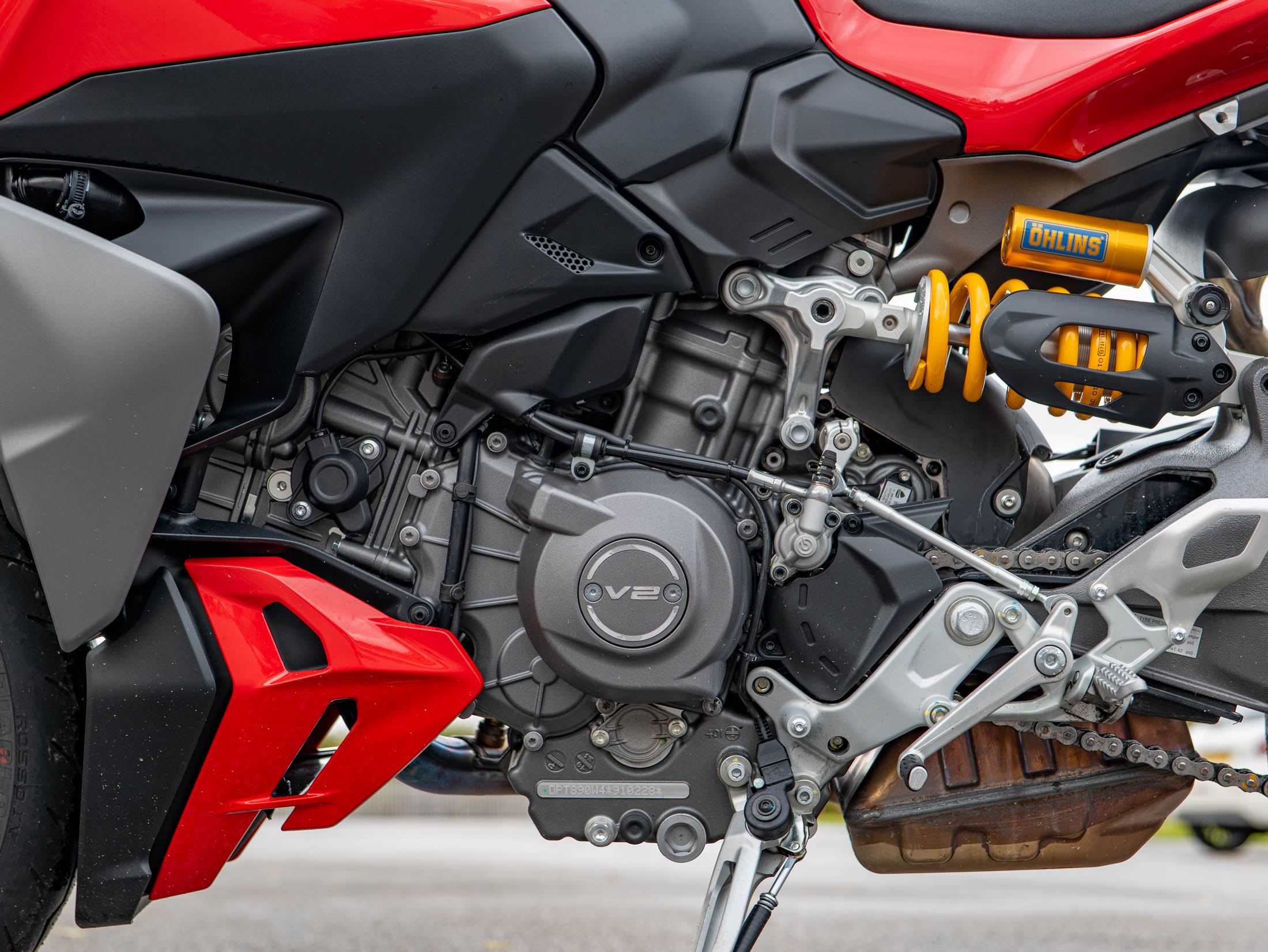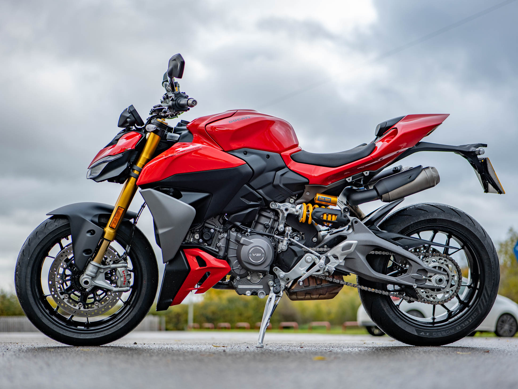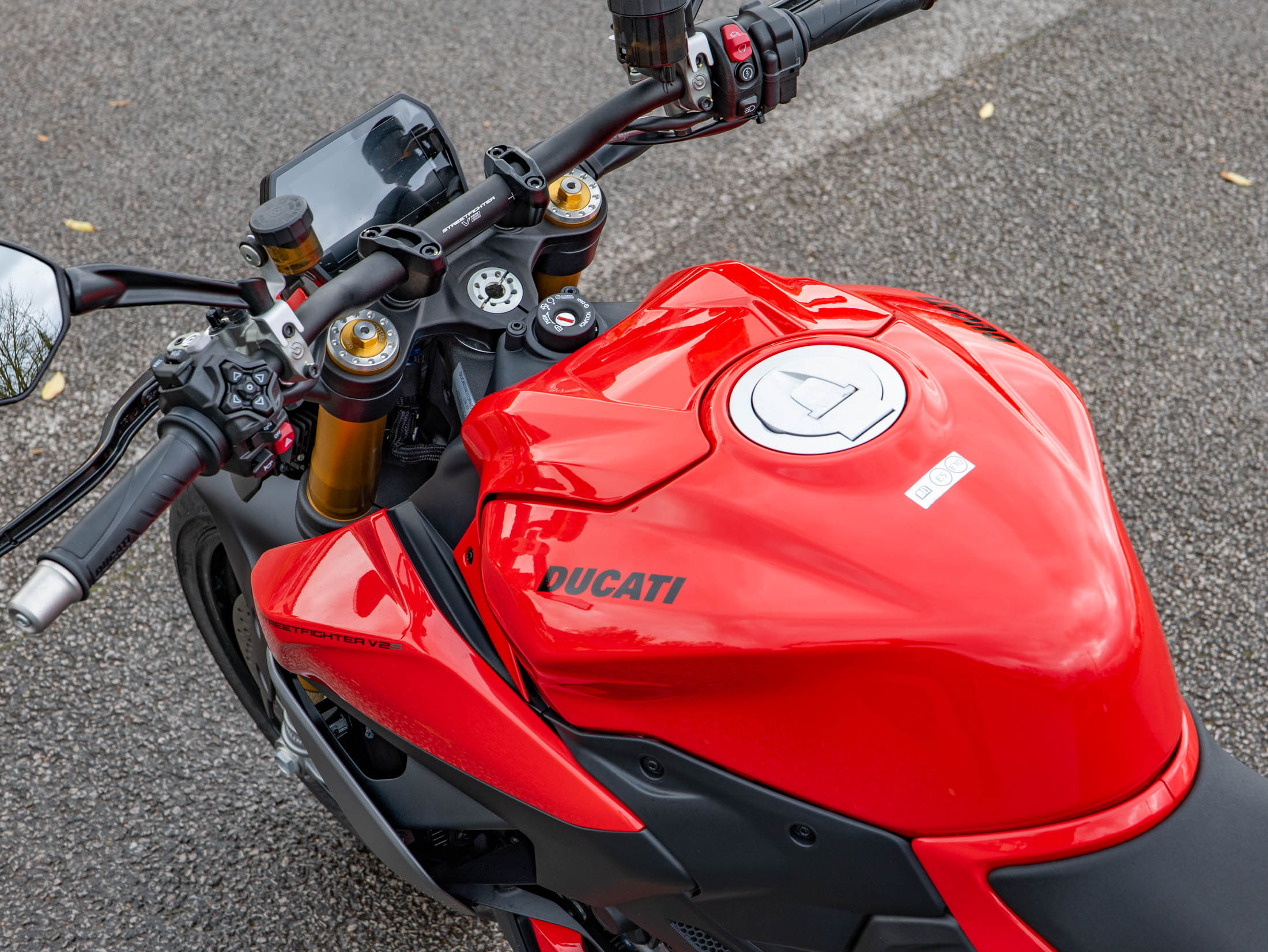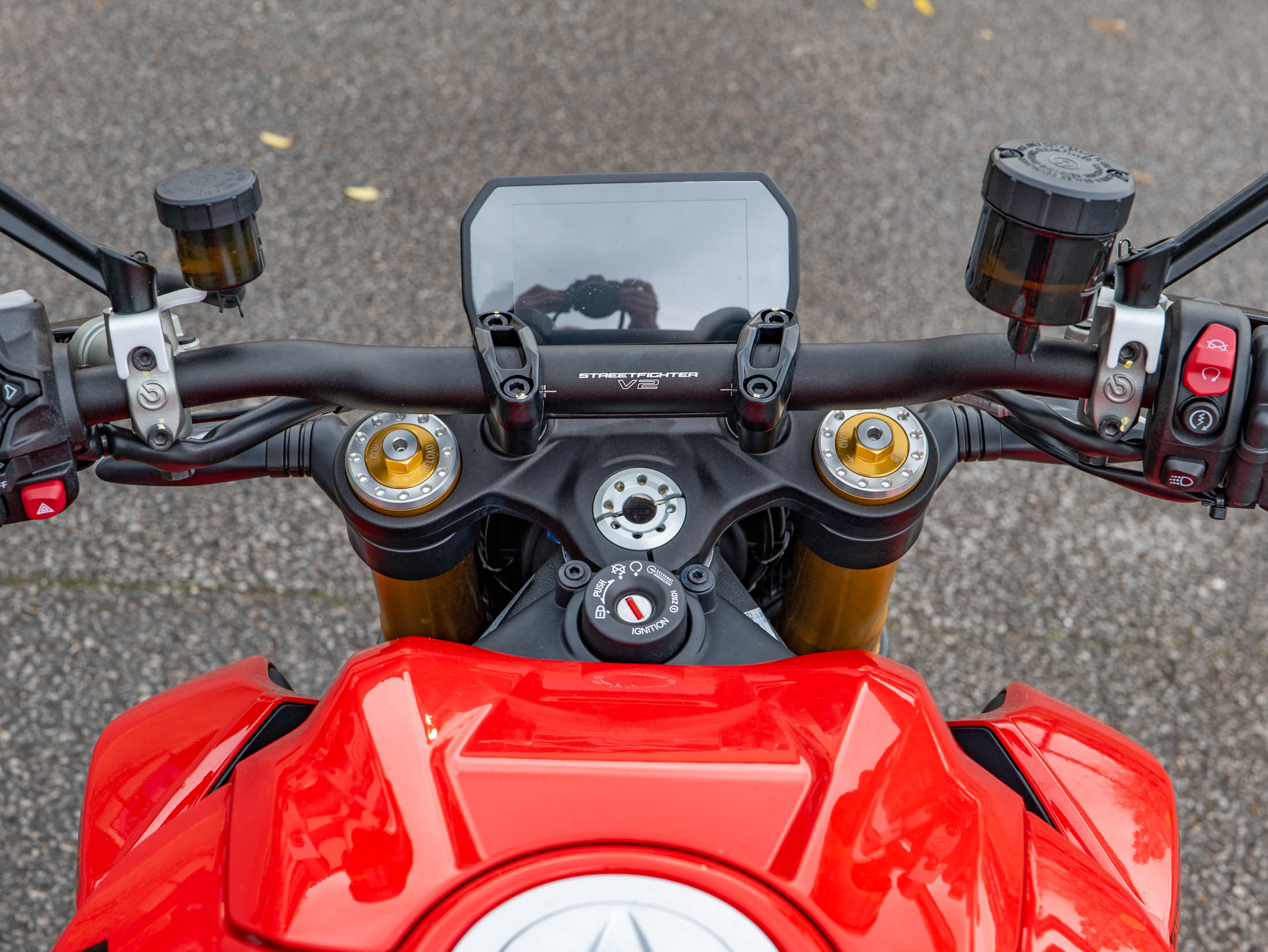 The Streetfighter V2 S is powered by the new generation 890cc 90° V2 engine, a high-revving L-Twin that delivers a thrilling 120 hp and incredible torque throughout the rev range, making for a potent and engaging ride whether on the street or the track. This power is expertly managed by a comprehensive electronics package, featuring Riding Modes, multi-level Traction Control, Wheelie Control, and a lightning-fast Quickshifter for seamless up and down shifts. The "S" model elevates the handling with fully adjustable Öhlins suspension front and rear, giving the rider superior feedback and customisation options compared to the standard model.