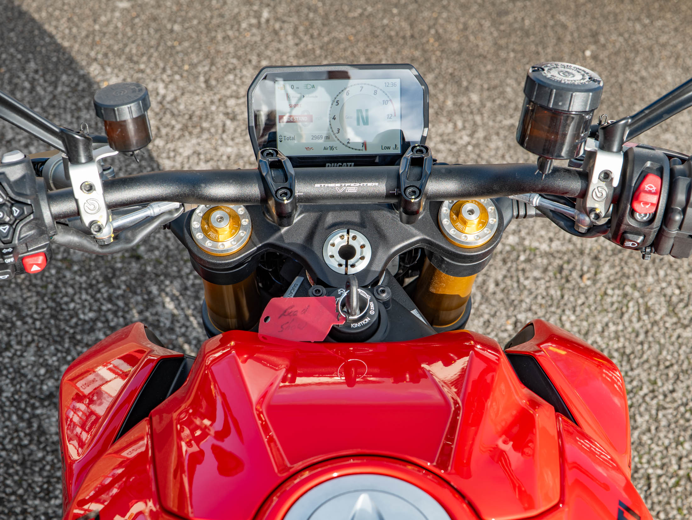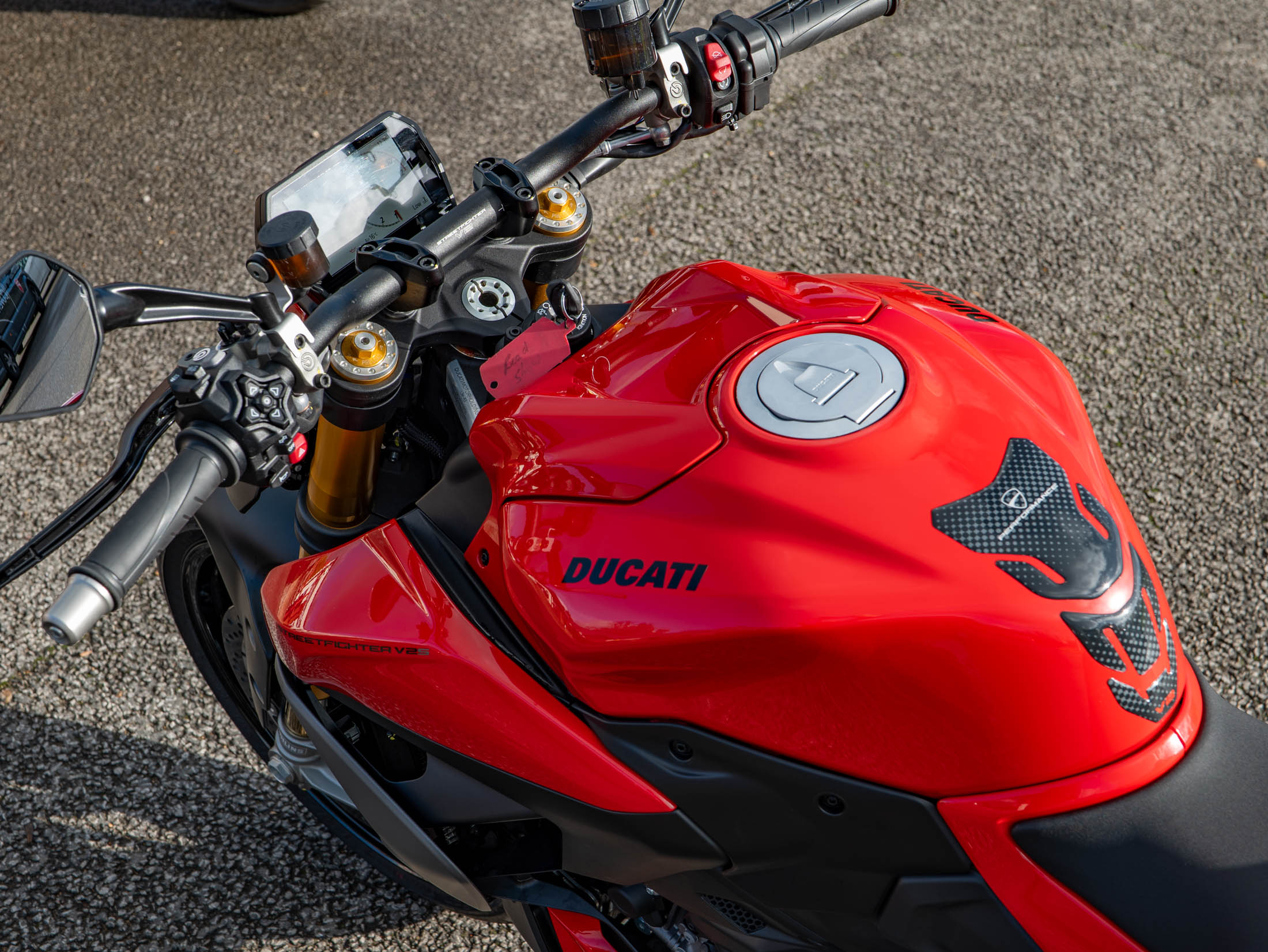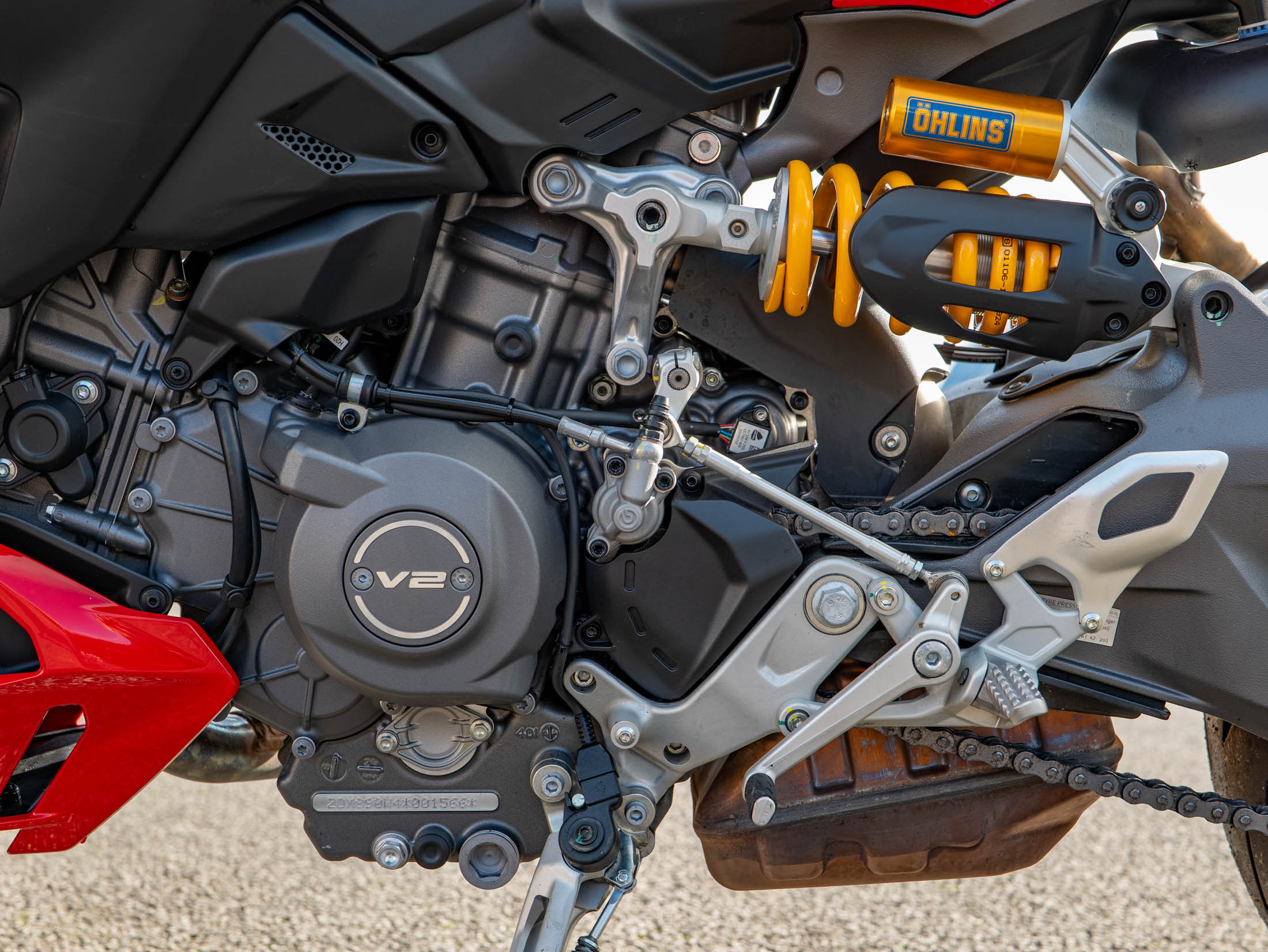 This 2025 Streetfighter V2 is built around Ducati’s new 890cc V2 engine, which focuses on enhanced torque delivery and lighter weight, resulting in a more user-friendly and agile naked bike. The new engine delivers a potent 120 hp through a six-speed manual transmission, offering thrilling performance that is more accessible for public road use than its predecessor. Power is managed flawlessly by the bi-directional Quickshifter (DQS EVO 2) for ultra-fast, clutchless gear changes. This model features a fully adjustable chassis, including Marzocchi front forks and a Kayaba rear monoshock (as is standard on the V2), providing excellent handling and rider feedback.