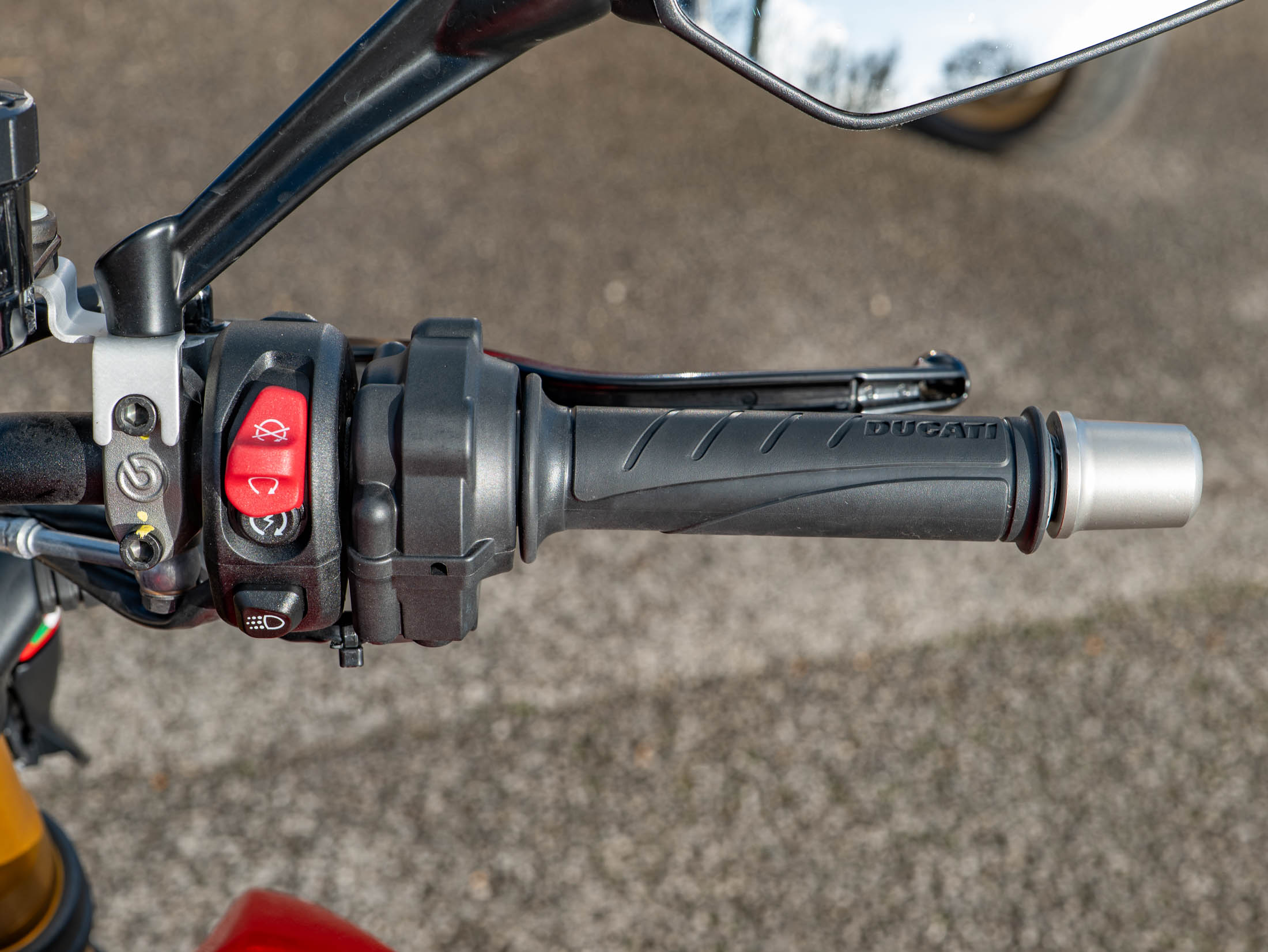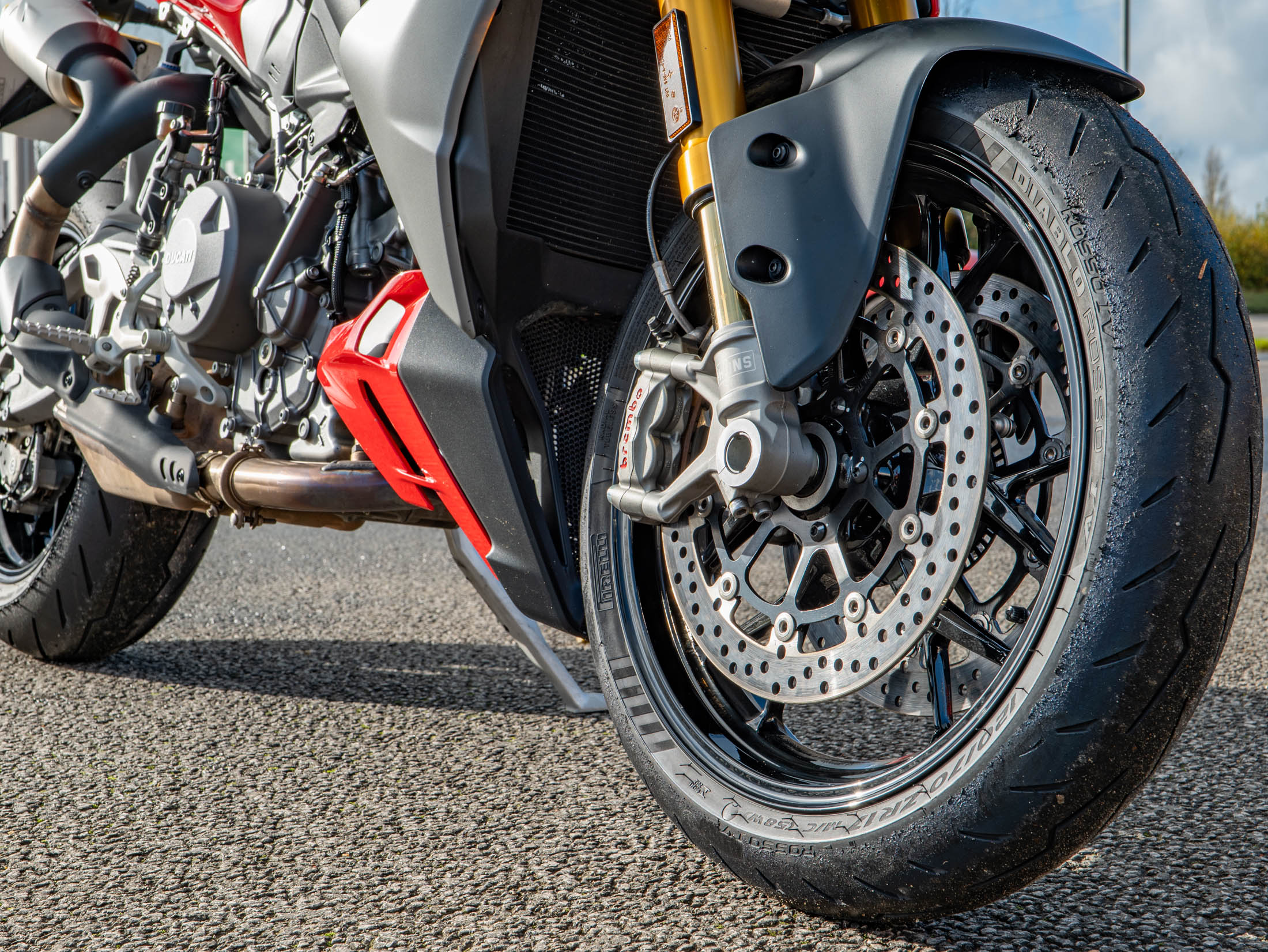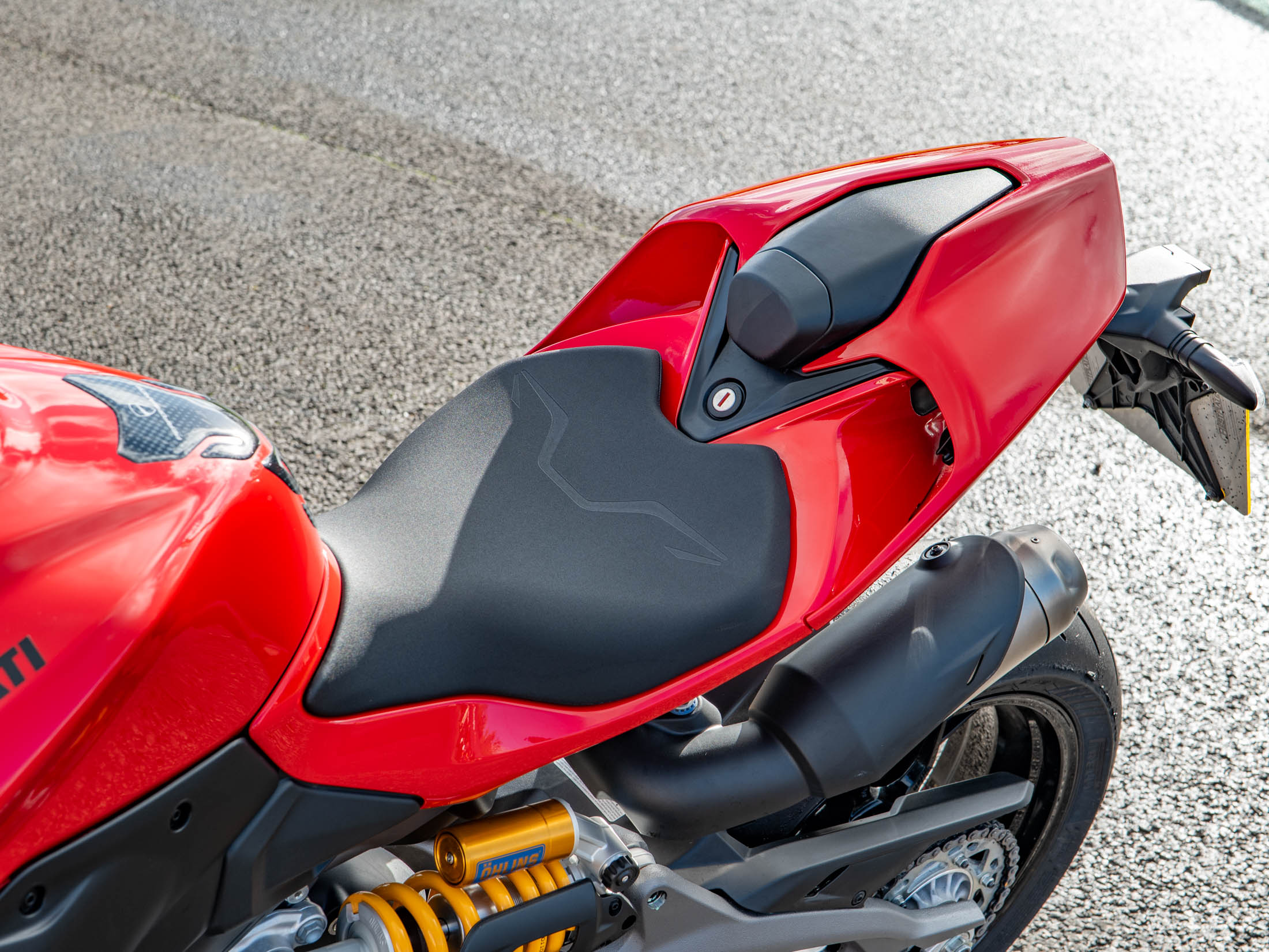 This 2025 Streetfighter V2 is built around Ducati’s new 890cc V2 engine, which focuses on enhanced torque delivery and lighter weight, resulting in a more user-friendly and agile naked bike. The new engine delivers a potent 120 hp through a six-speed manual transmission, offering thrilling performance that is more accessible for public road use than its predecessor. Power is managed flawlessly by the bi-directional Quickshifter (DQS EVO 2) for ultra-fast, clutchless gear changes. This model features a fully adjustable chassis, including Marzocchi front forks and a Kayaba rear monoshock (as is standard on the V2), providing excellent handling and rider feedback.
