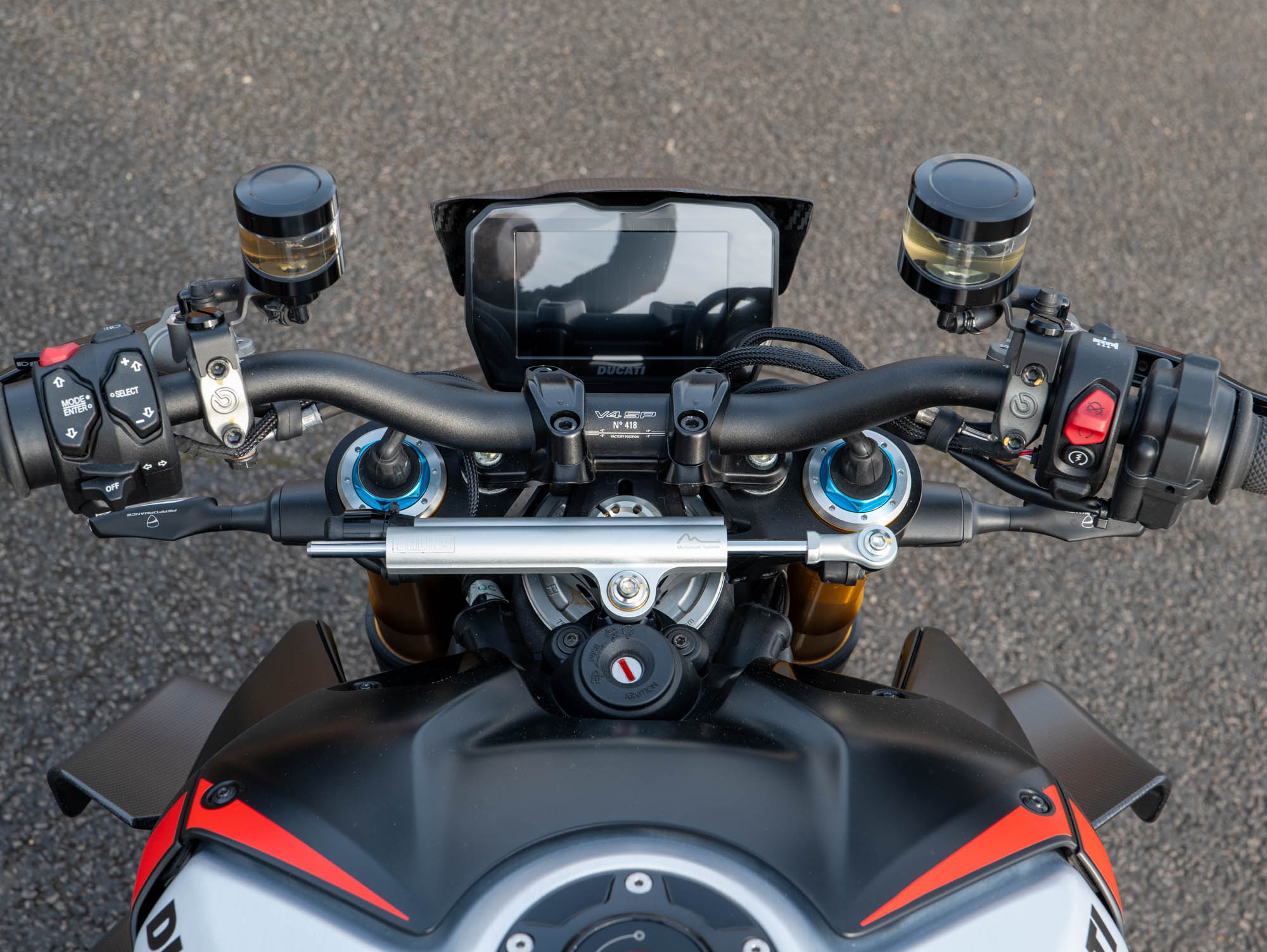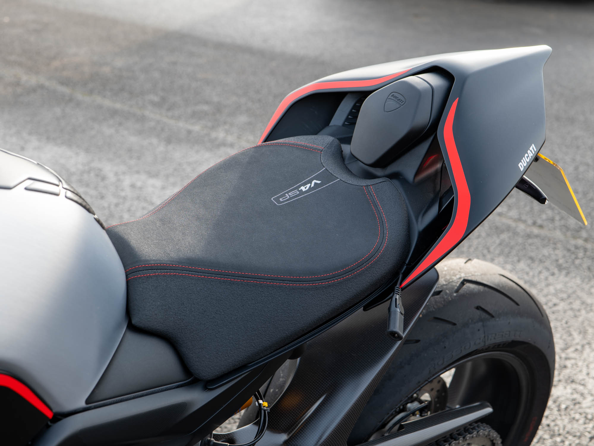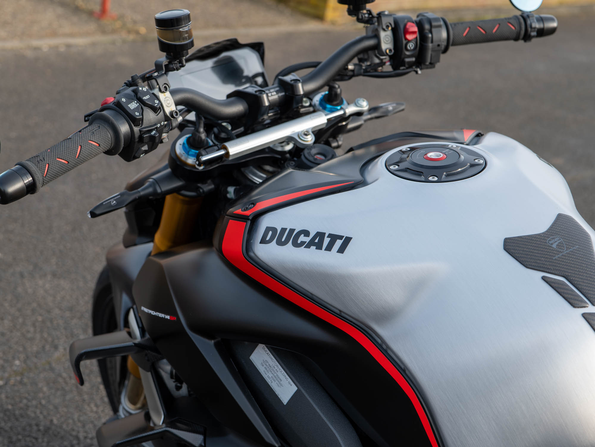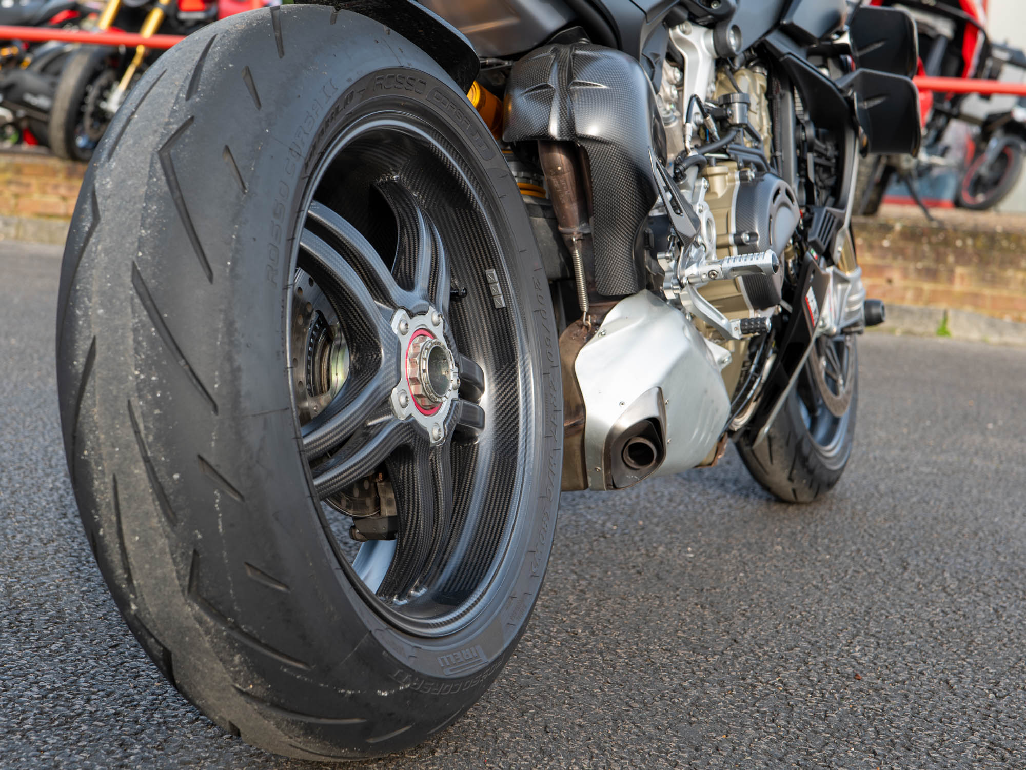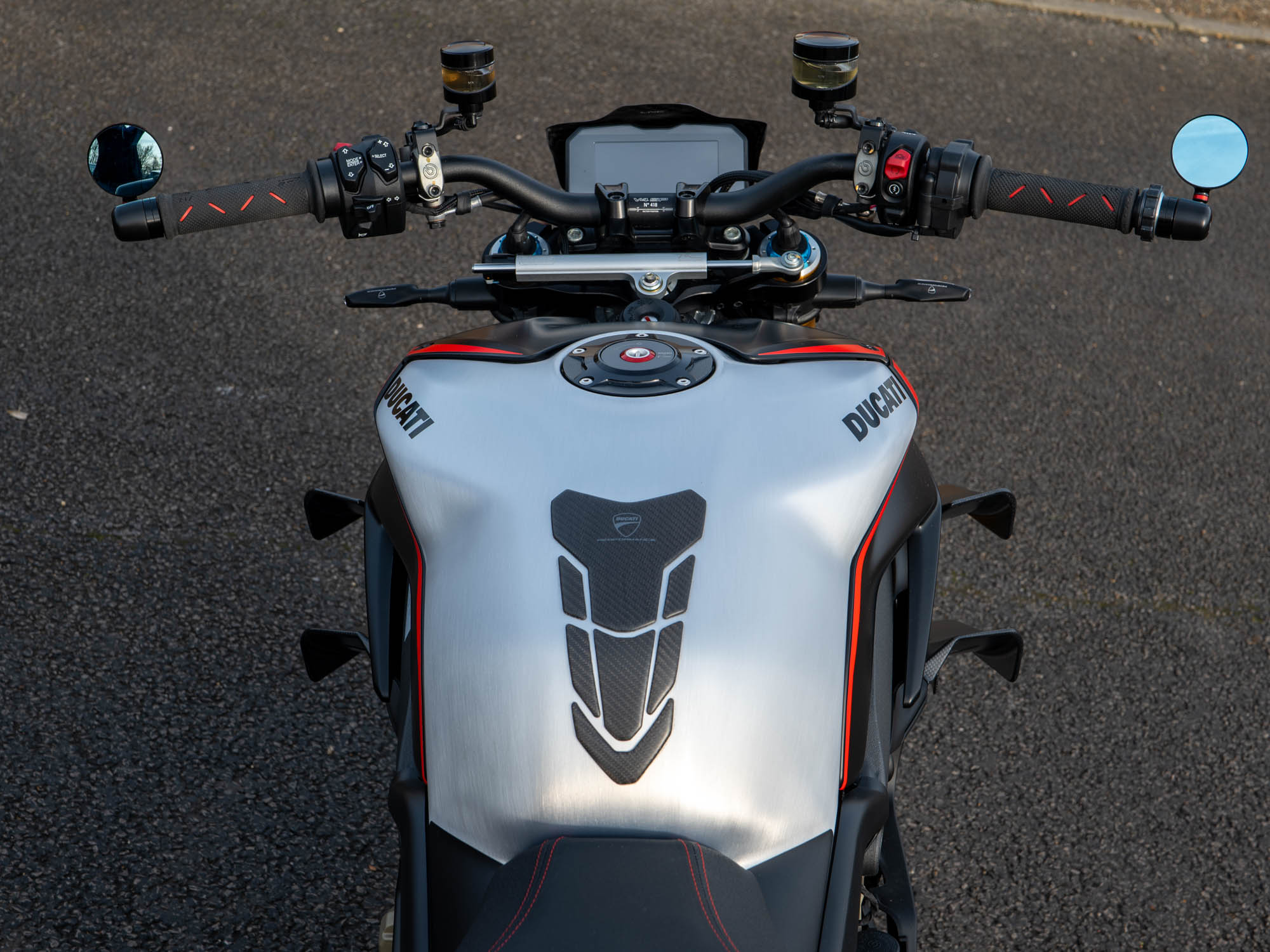 This particular example is loaded with carbon fibre accessories, enhancing its aesthetics and performance. It also includes Ducati Performance indicators, adding to its exclusive appeal.