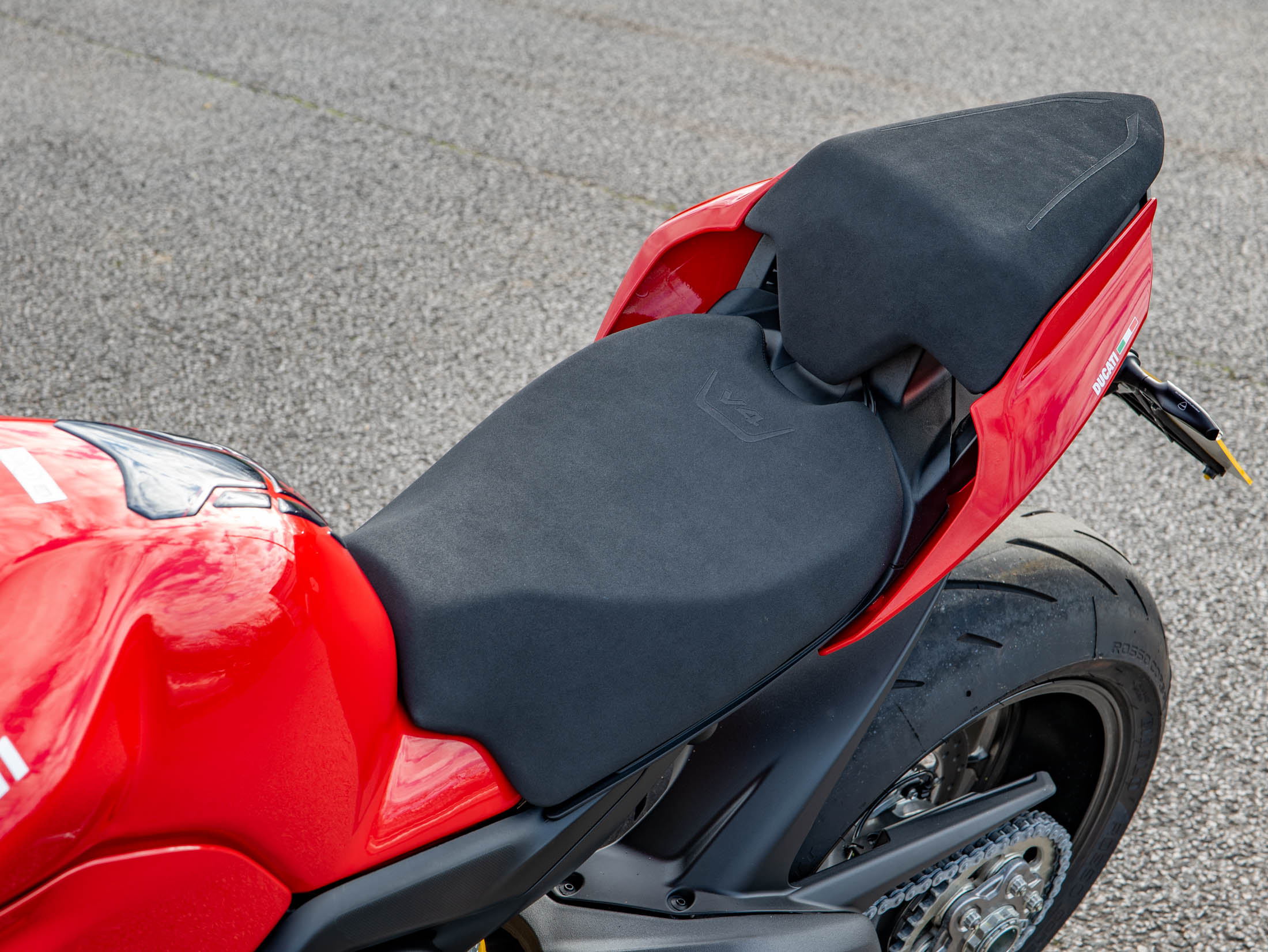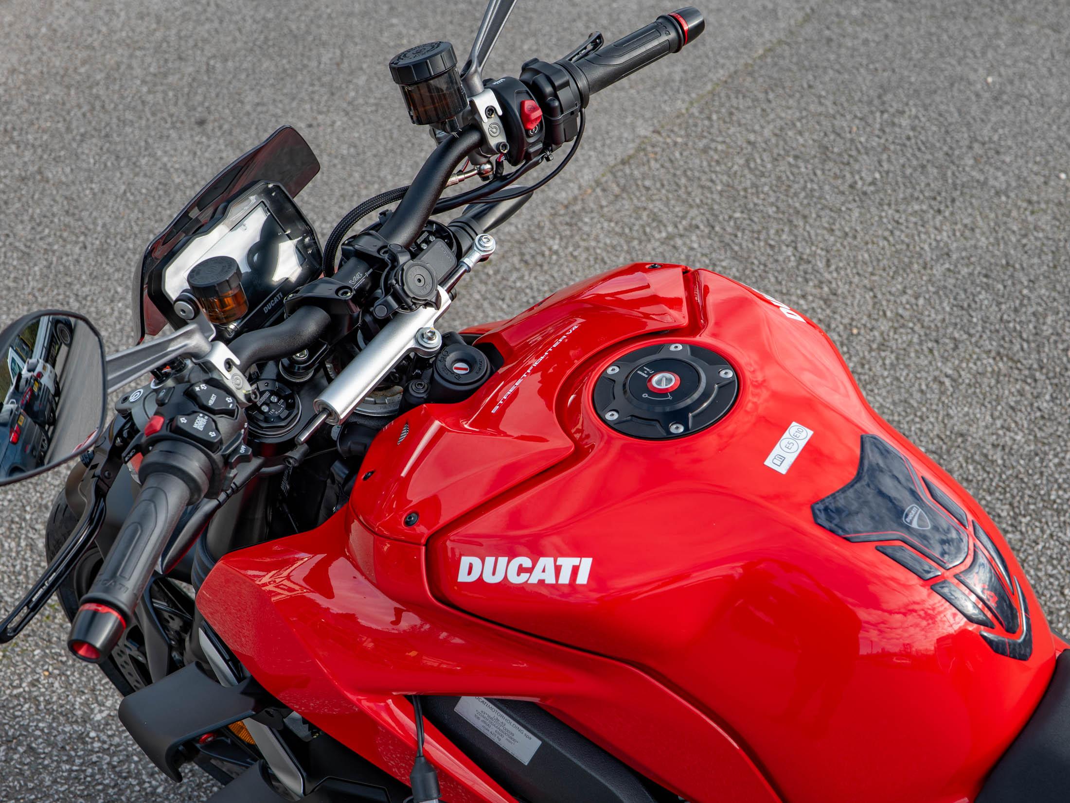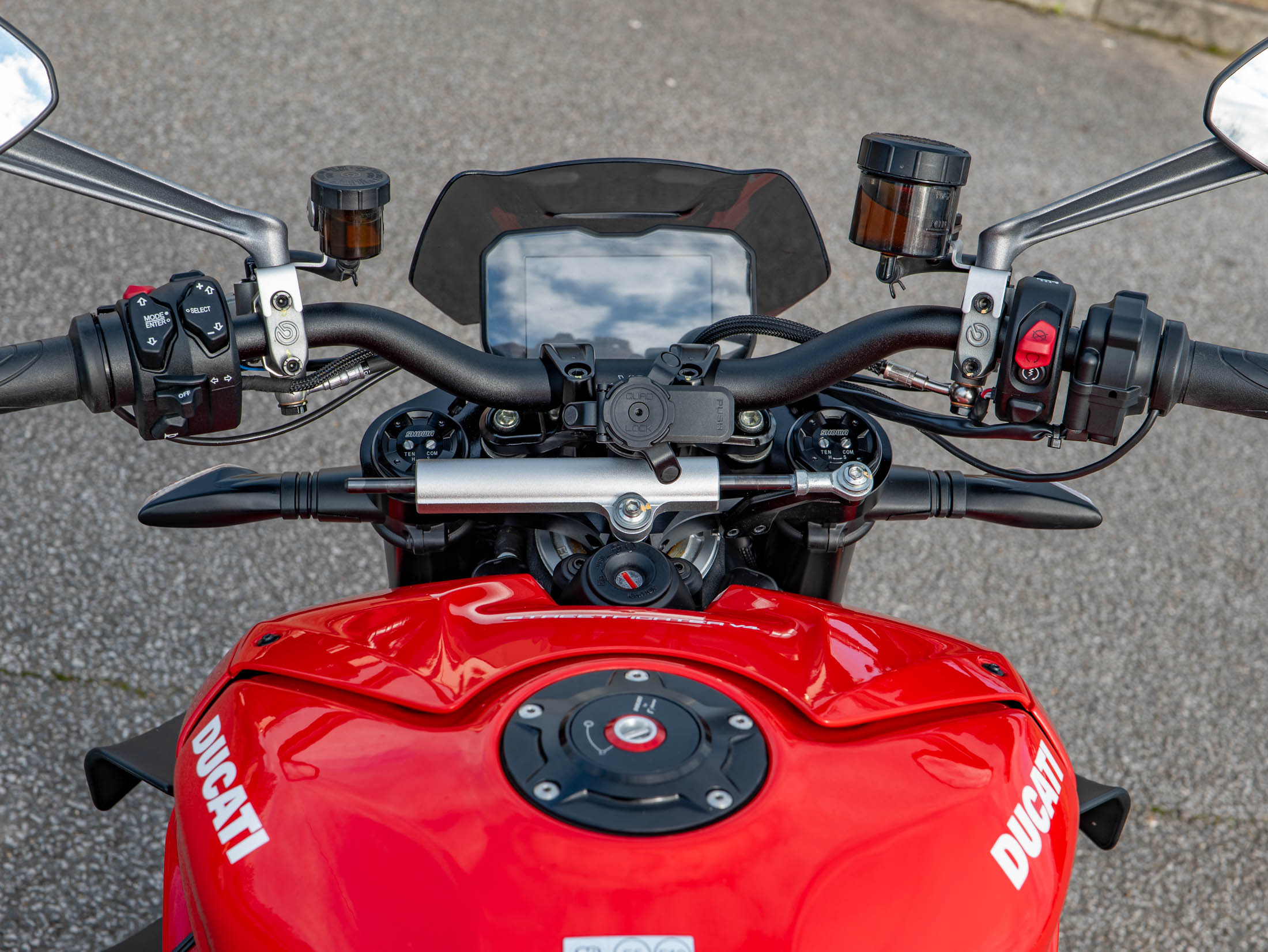 This specific Streetfighter V4 has been enhanced with several choice, tasteful upgrades. It features the essential visual upgrade of a factory Ducati Tail Tidy to sharpen the rear end, along with a sporty Rizoma Filler Cap. For added protection, the bike is fitted with R&G Crash Bobbins (crash bungs) and Spindle Sliders on the front to safeguard the key components. The inclusion of a QuadLock Phone Mount offers modern convenience, while essential details like the Fly Screen and Tank Pad complete the package. Despite being a powerful superbike, it also includes factory Heated Grips for added comfort.