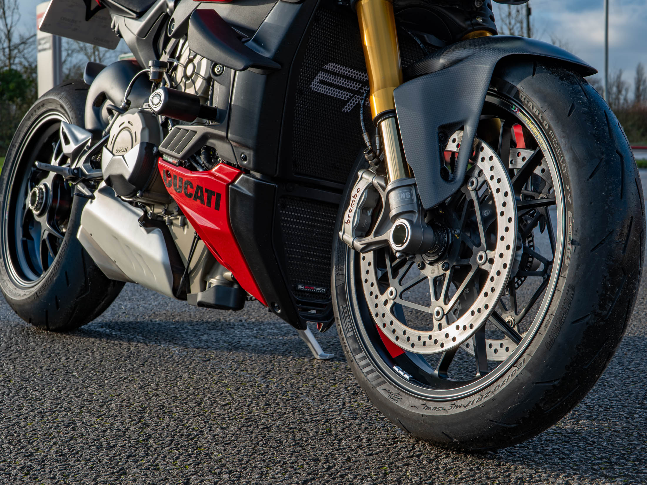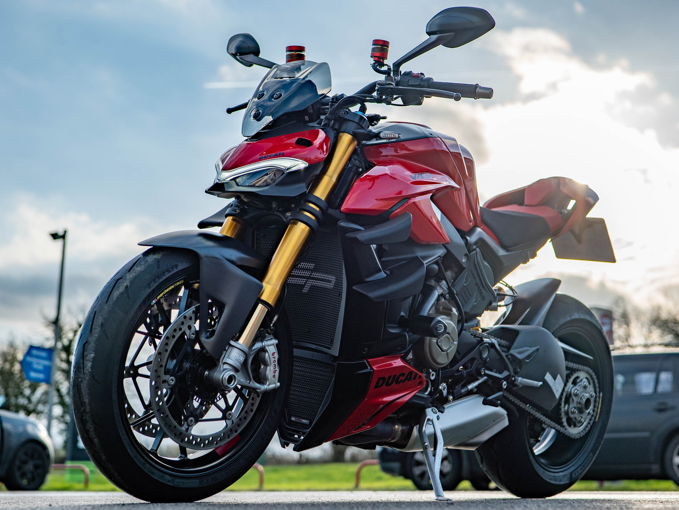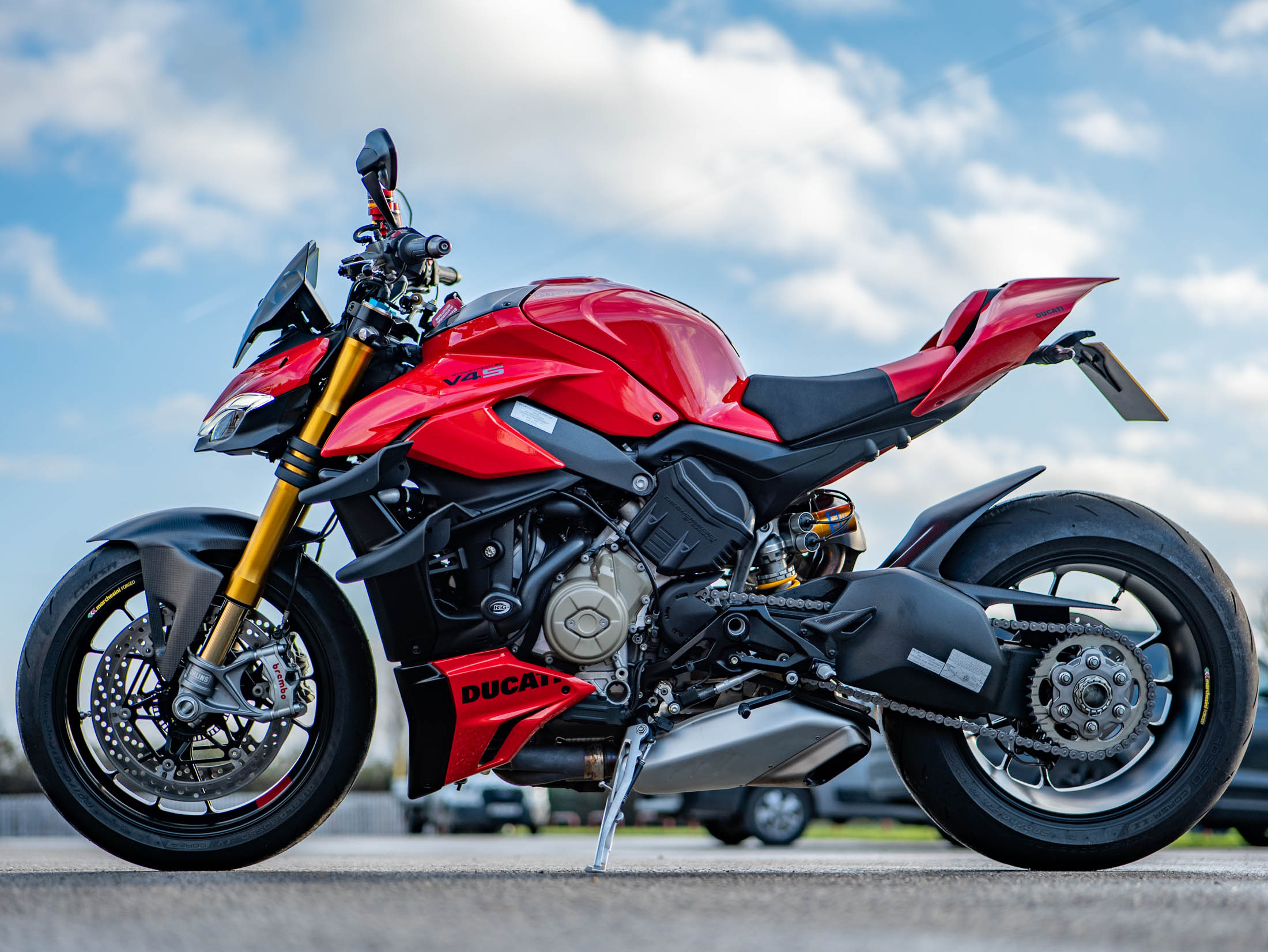 The Streetfighter V4 S is powered by the 1103 cc Desmosedici Stradale V4 engine, producing an incredible 208 hp, and features the essential bi-plane wings for high-speed stability. The 'S' model raises the bar for performance with its fully electronic, semi-active Öhlins Smart EC 2.0 suspension and lightweight forged Marchesini wheels. The motorcycle is fully equipped with Ducati's sophisticated electronic suite, which uses a six-axis IMU to manage features like Cornering ABS, multiple Riding Modes, and the Quickshifter (DQS) up/down for seamless gear changes.