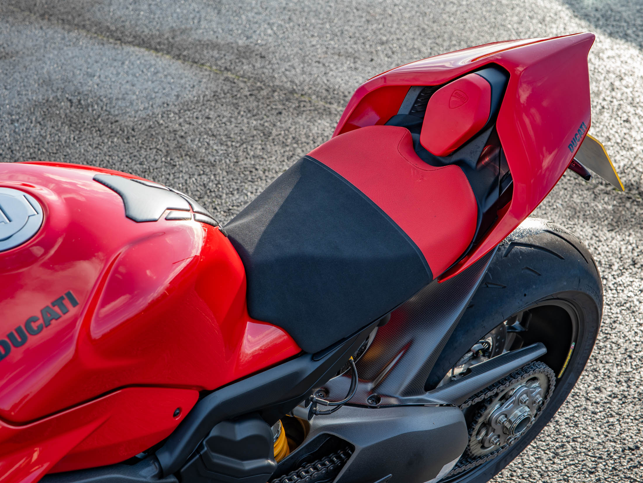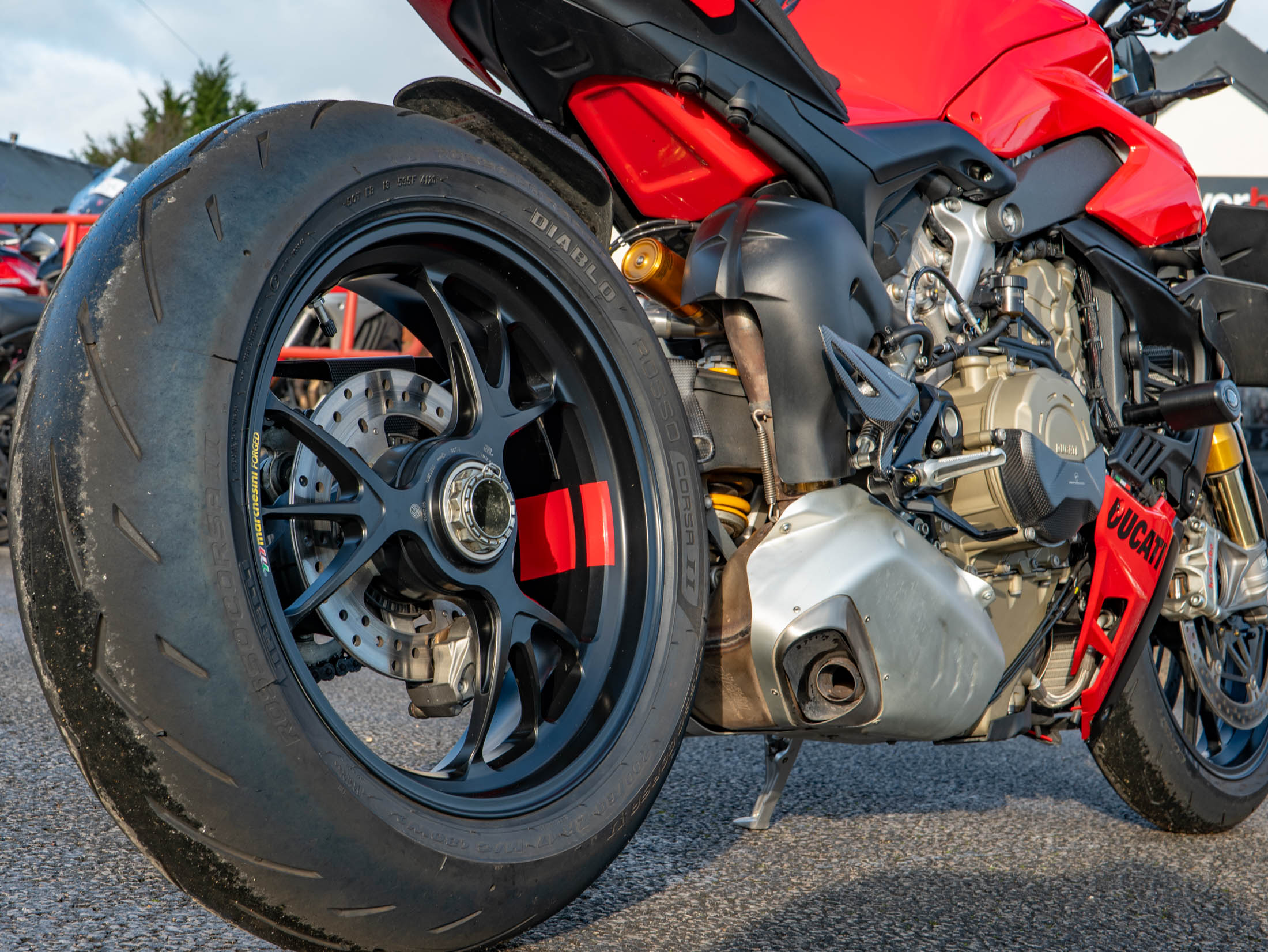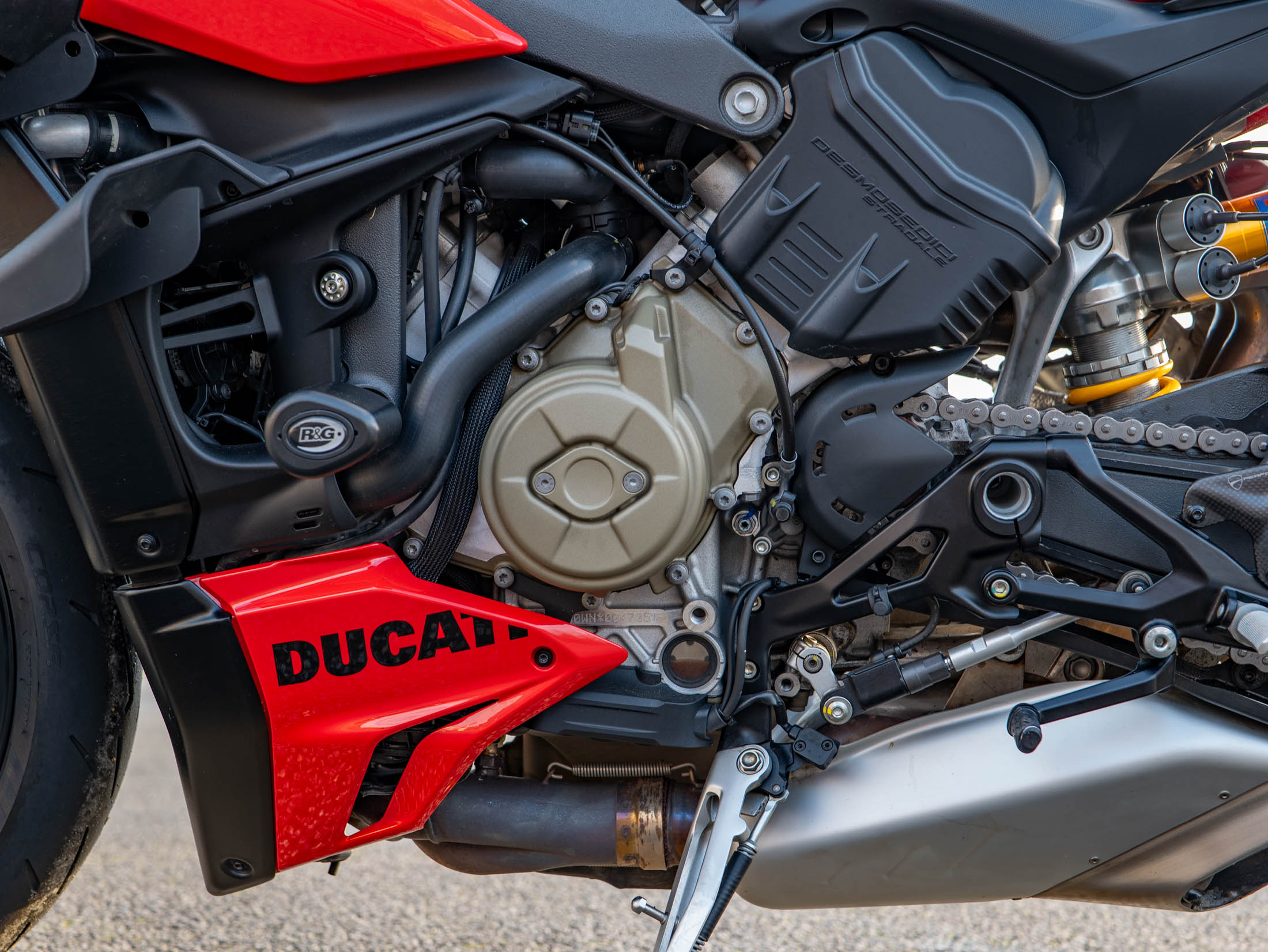 The Streetfighter V4 S is powered by the 1103 cc Desmosedici Stradale V4 engine, producing an incredible 208 hp, and features the essential bi-plane wings for high-speed stability. The 'S' model raises the bar for performance with its fully electronic, semi-active Öhlins Smart EC 2.0 suspension and lightweight forged Marchesini wheels. The motorcycle is fully equipped with Ducati's sophisticated electronic suite, which uses a six-axis IMU to manage features like Cornering ABS, multiple Riding Modes, and the Quickshifter (DQS) up/down for seamless gear changes.