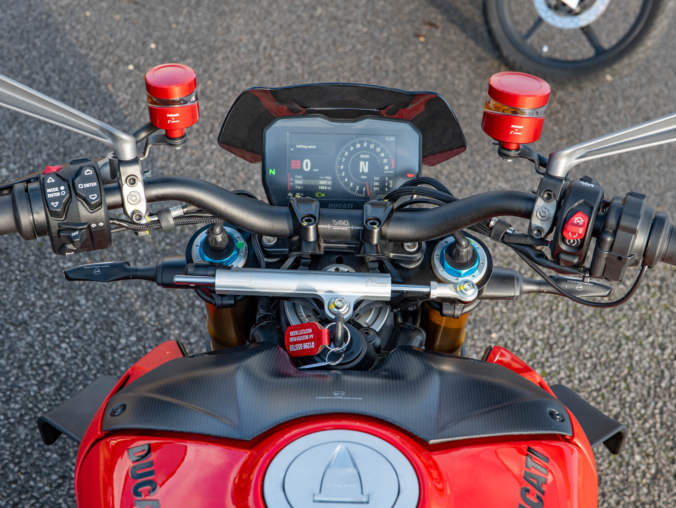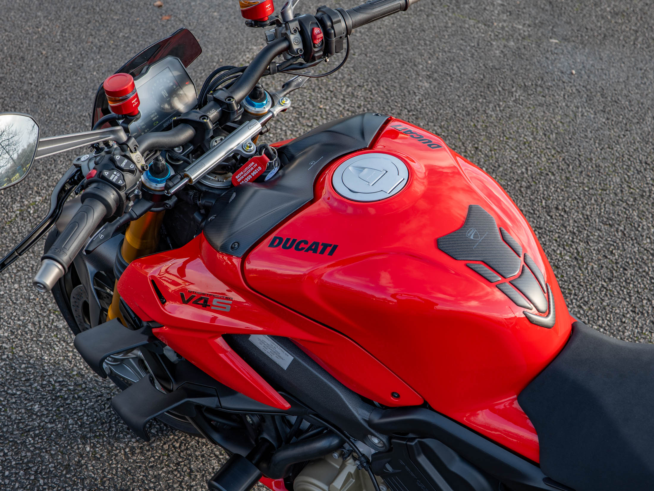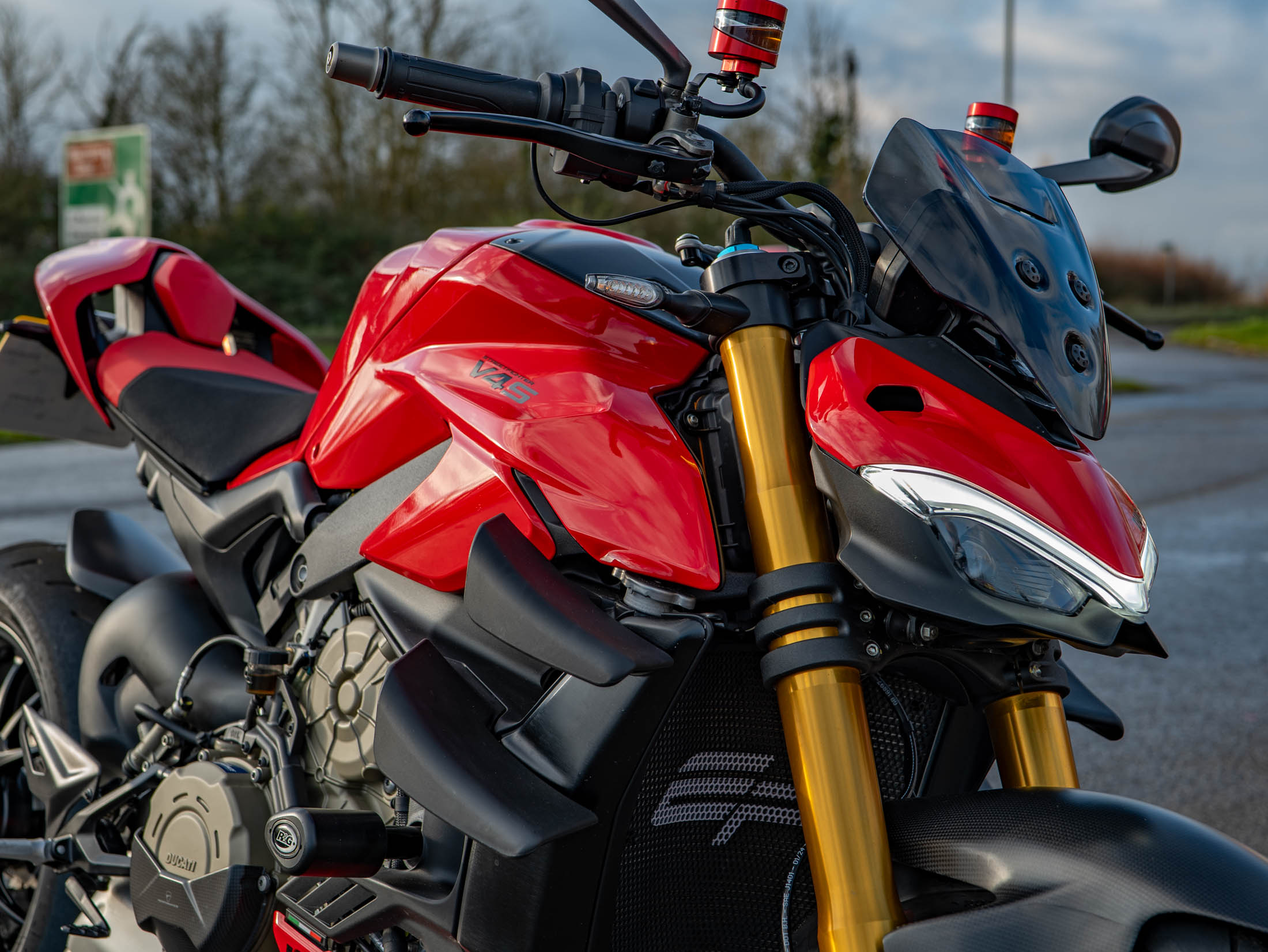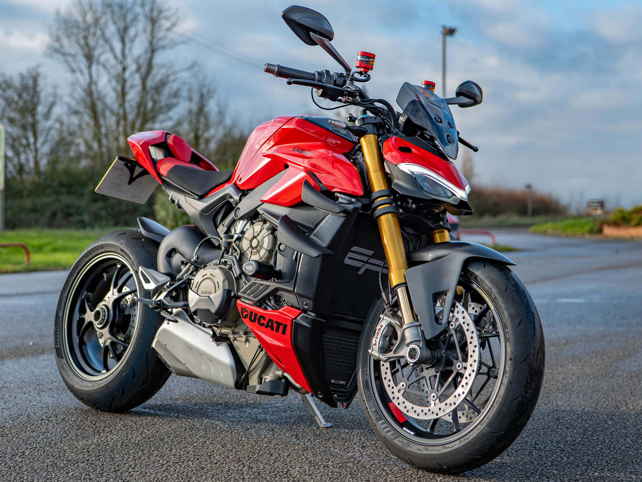 This particular machine has been significantly upgraded with a collection of high-quality components. Protection is taken care of with essential R&G Crash Bobbins and Evotech Rad Guards for both the oil and water radiators. For enhanced aesthetics, the bike features a high-quality Carbon Tank Cover, genuine Ducati Performance Indicators, and sleek Rizoma Brake and Clutch Reservoirs for a custom, premium look. Furthermore, the bike offers excellent comfort and functionality thanks to factory-fitted Heated Grips and a practical Fly Screen for reduced wind blast. With its aggressive styling, race-derived electronics, and top-tier accessories, this Streetfighter V4 S is ready to dominate any road.