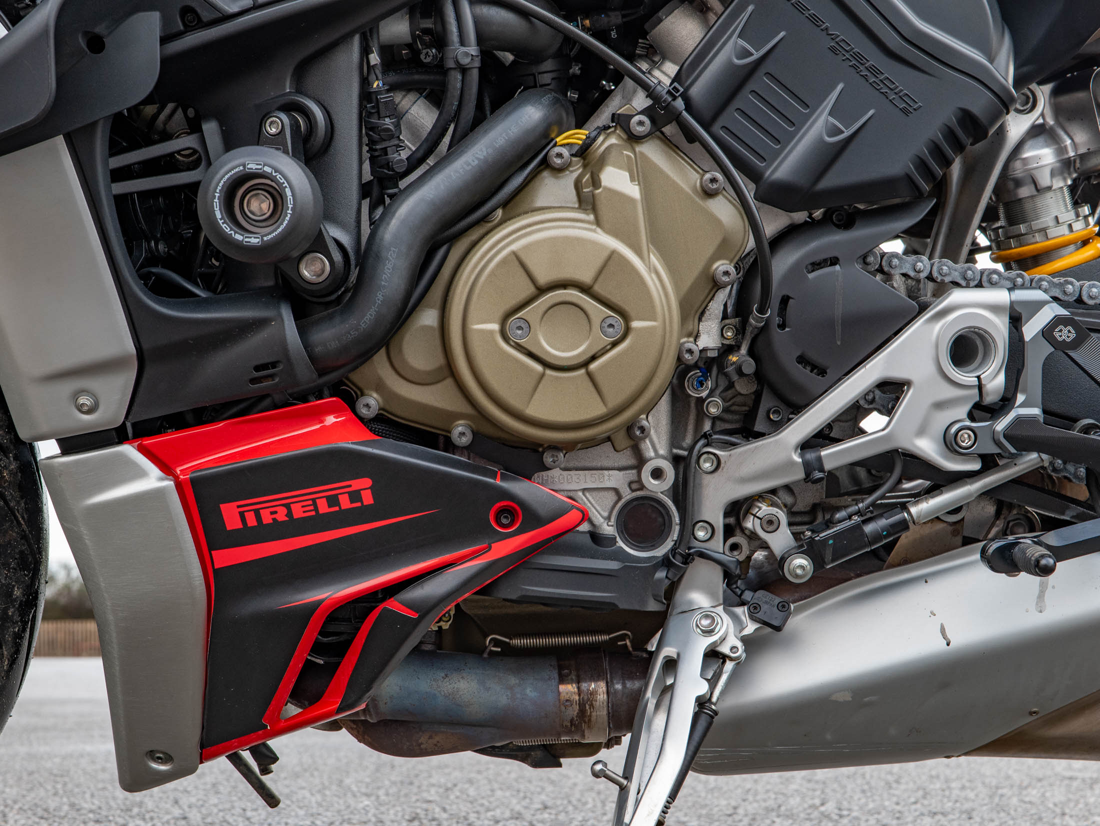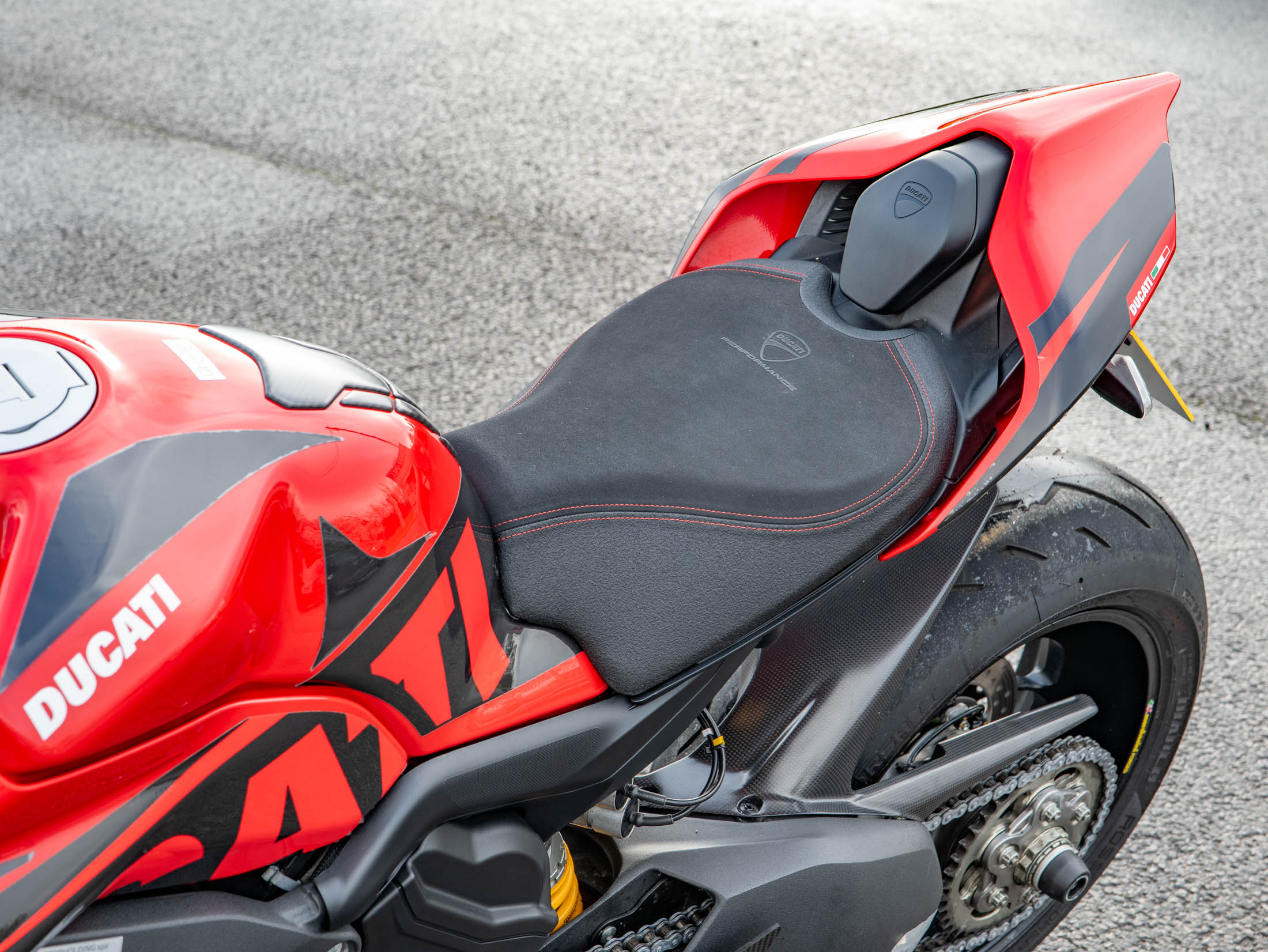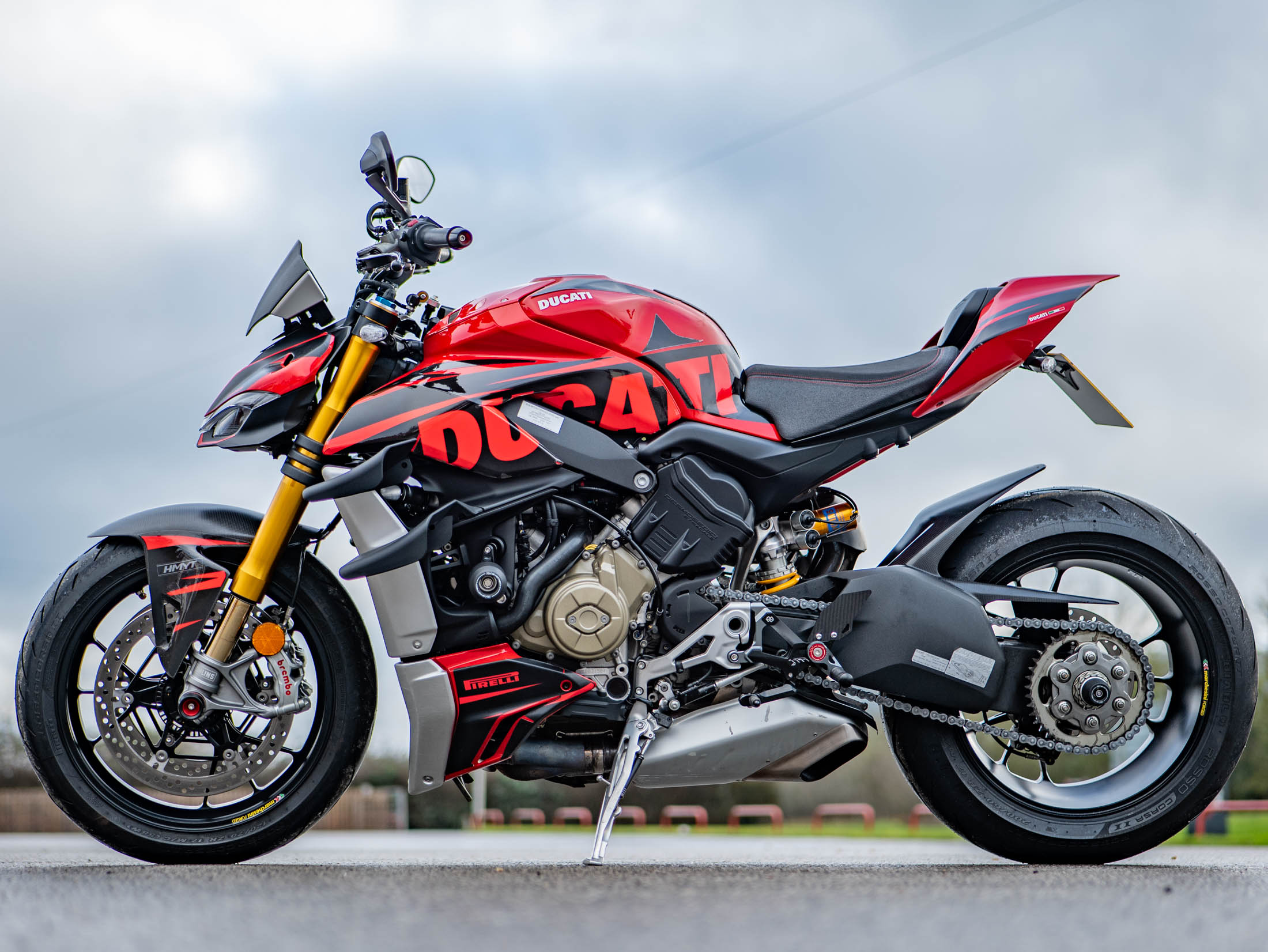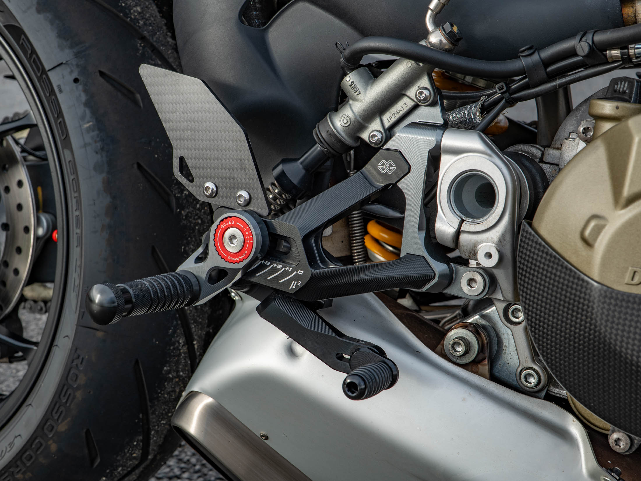 The level of high-end accessories on this particular example is truly exceptional. It is dripping in carbon fibre, featuring a carbon front mudguard, rear hugger, chain guard, screen, and protection for both the generator and clutch. The ergonomics have been upgraded with Gilles rearsets and a Ducati Performance seat, while the aesthetics are refined with a seat cowl and Rizoma components including spindle protection and billet fluid reservoirs. These additions not only enhance the bike's "factory custom" look but also improve the tactile feel and durability of the machine.
