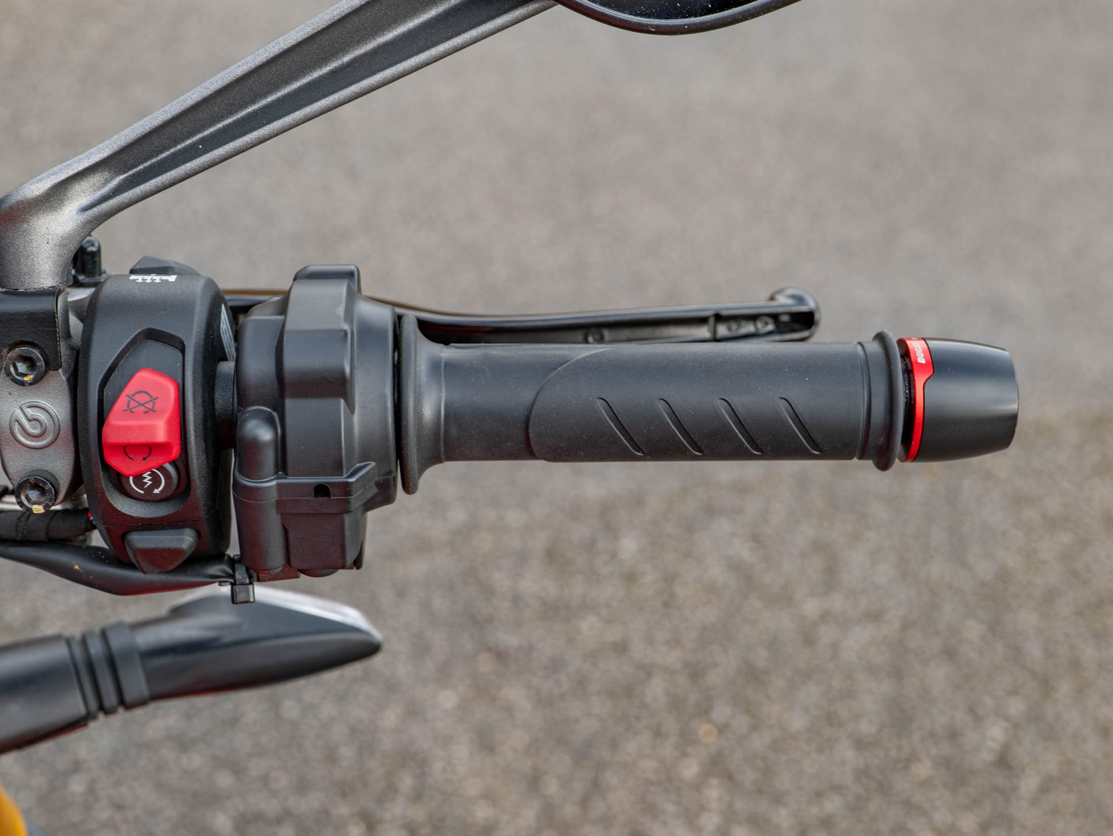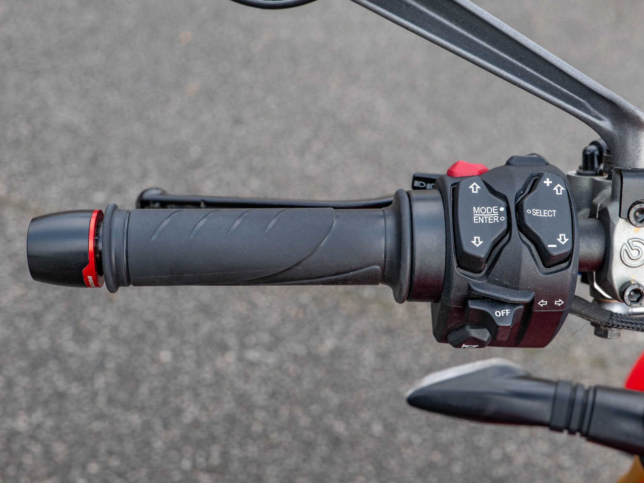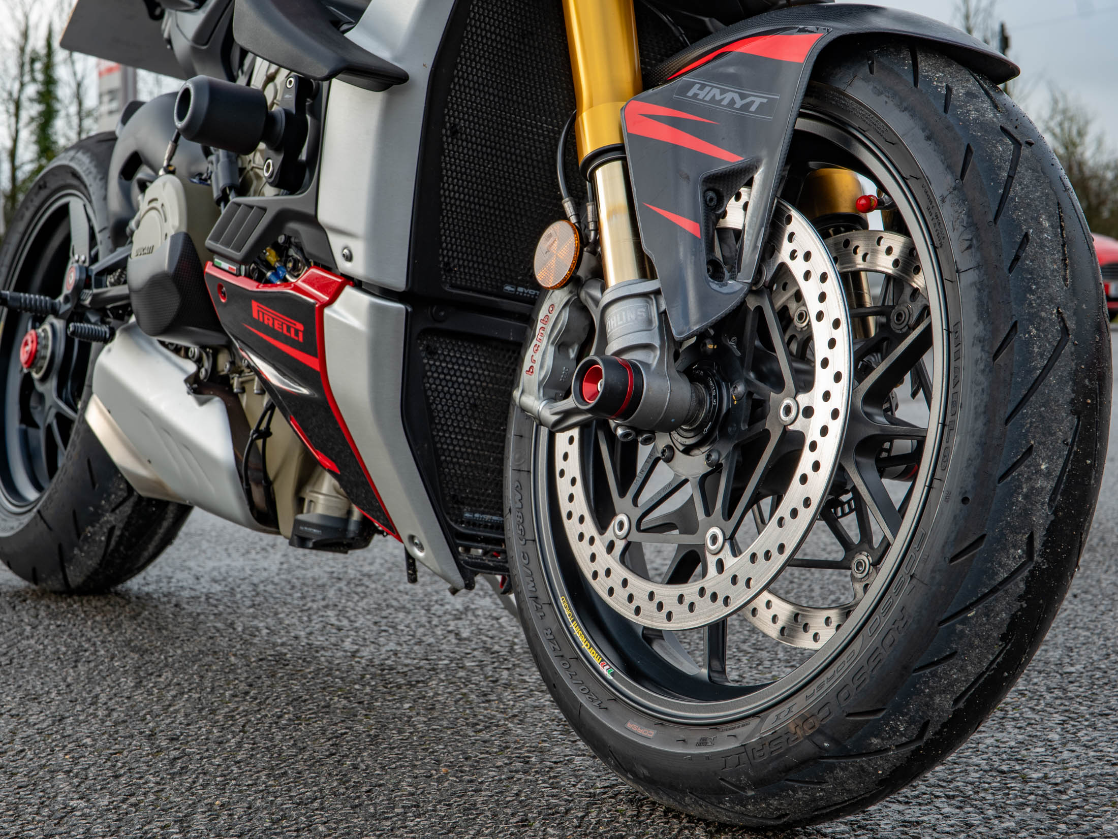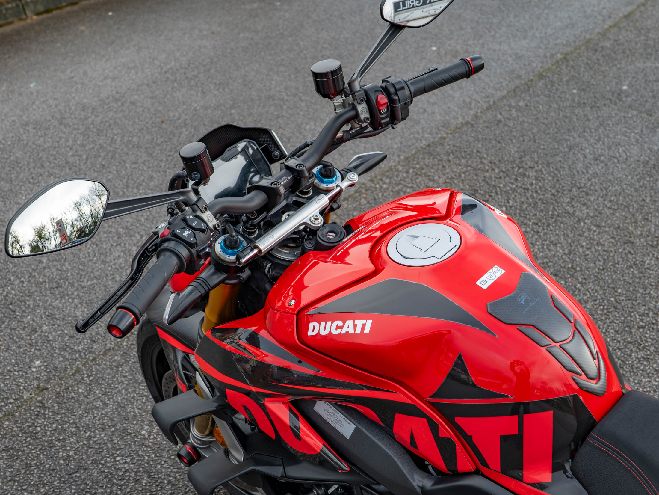 The level of high-end accessories on this particular example is truly exceptional. It is dripping in carbon fibre, featuring a carbon front mudguard, rear hugger, chain guard, screen, and protection for both the generator and clutch. The ergonomics have been upgraded with Gilles rearsets and a Ducati Performance seat, while the aesthetics are refined with a seat cowl and Rizoma components including spindle protection and billet fluid reservoirs. These additions not only enhance the bike's "factory custom" look but also improve the tactile feel and durability of the machine.