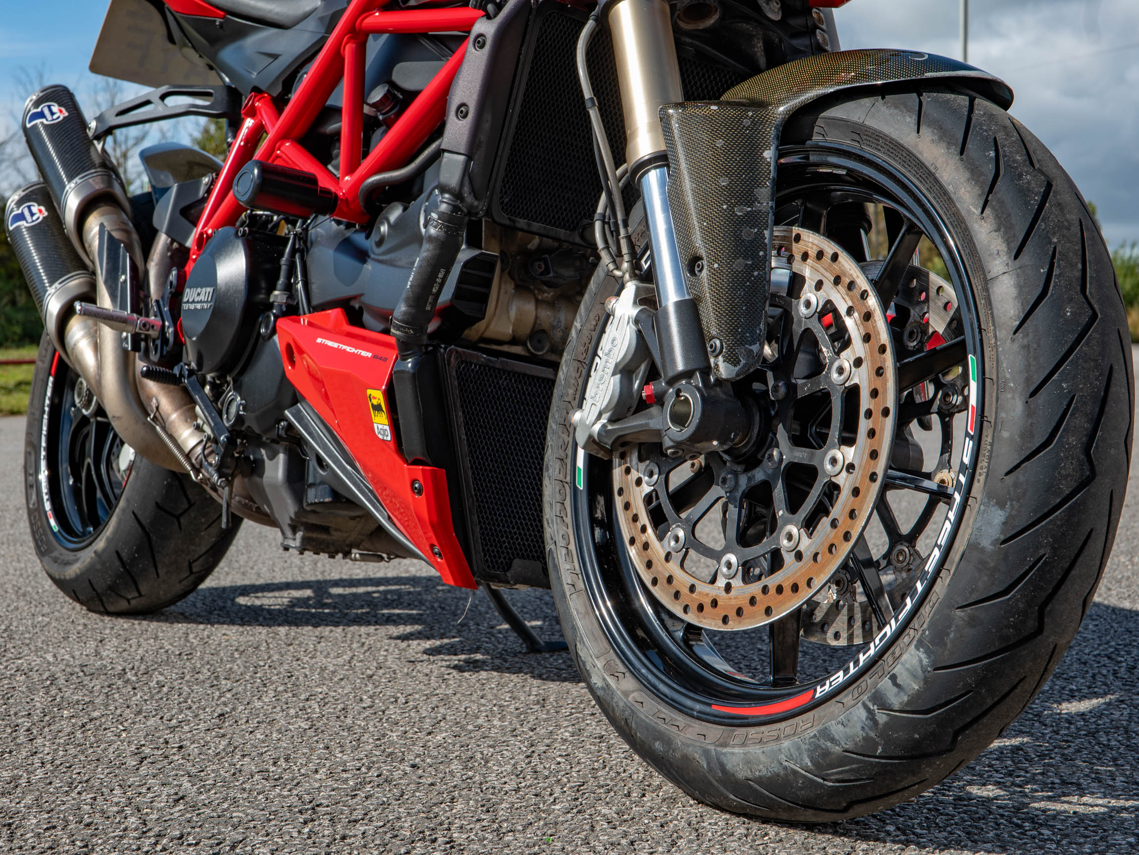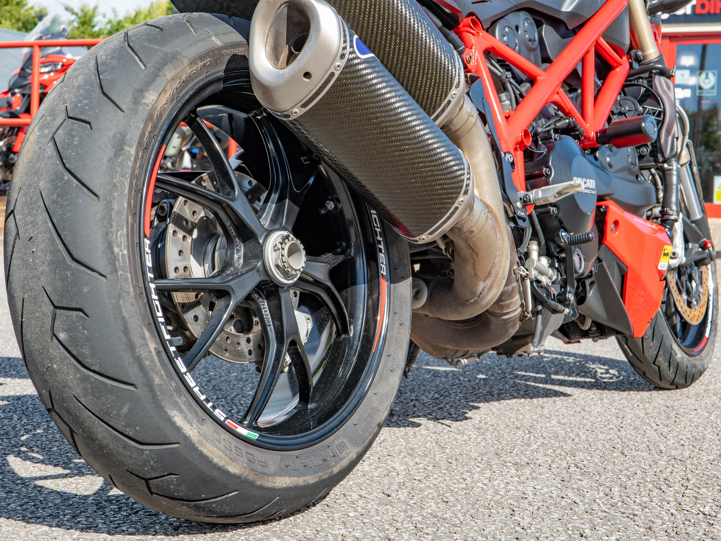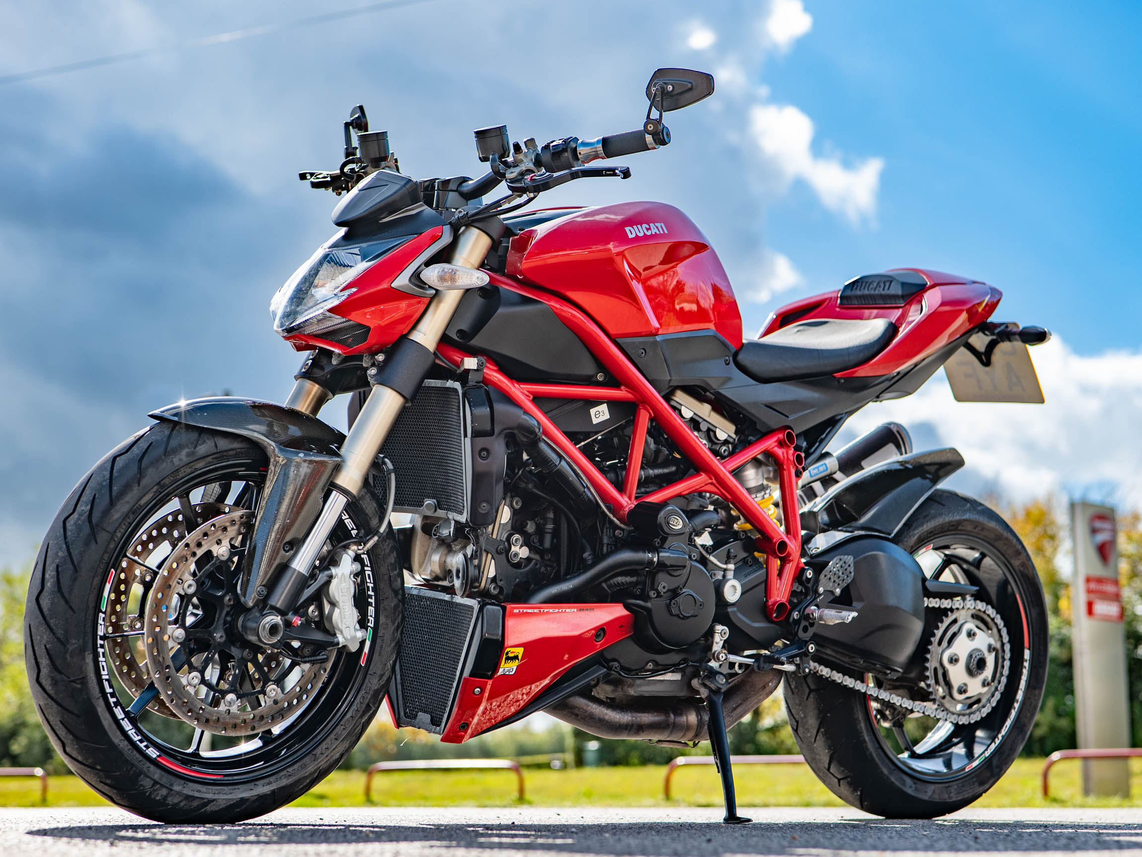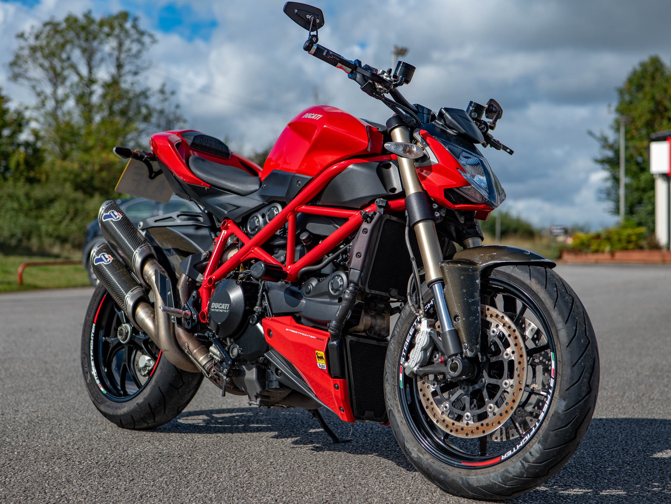 The Streetfighter 848 is all about raw, purposeful design and incredible performance. Its lightweight chassis and sharp handling make it a joy to ride, whether you're navigating urban traffic or carving through your favourite country lanes. This specific bike has been further enhanced with a number of high-quality aftermarket upgrades, including a carbon front and rear mudguard, Rizoma grips, and R&G crash bungs. These not only improve the bike's aesthetics but also provide crucial protection. The addition of a tail tidy and bar-end mirrors also contributes to its aggressive, minimalist look.