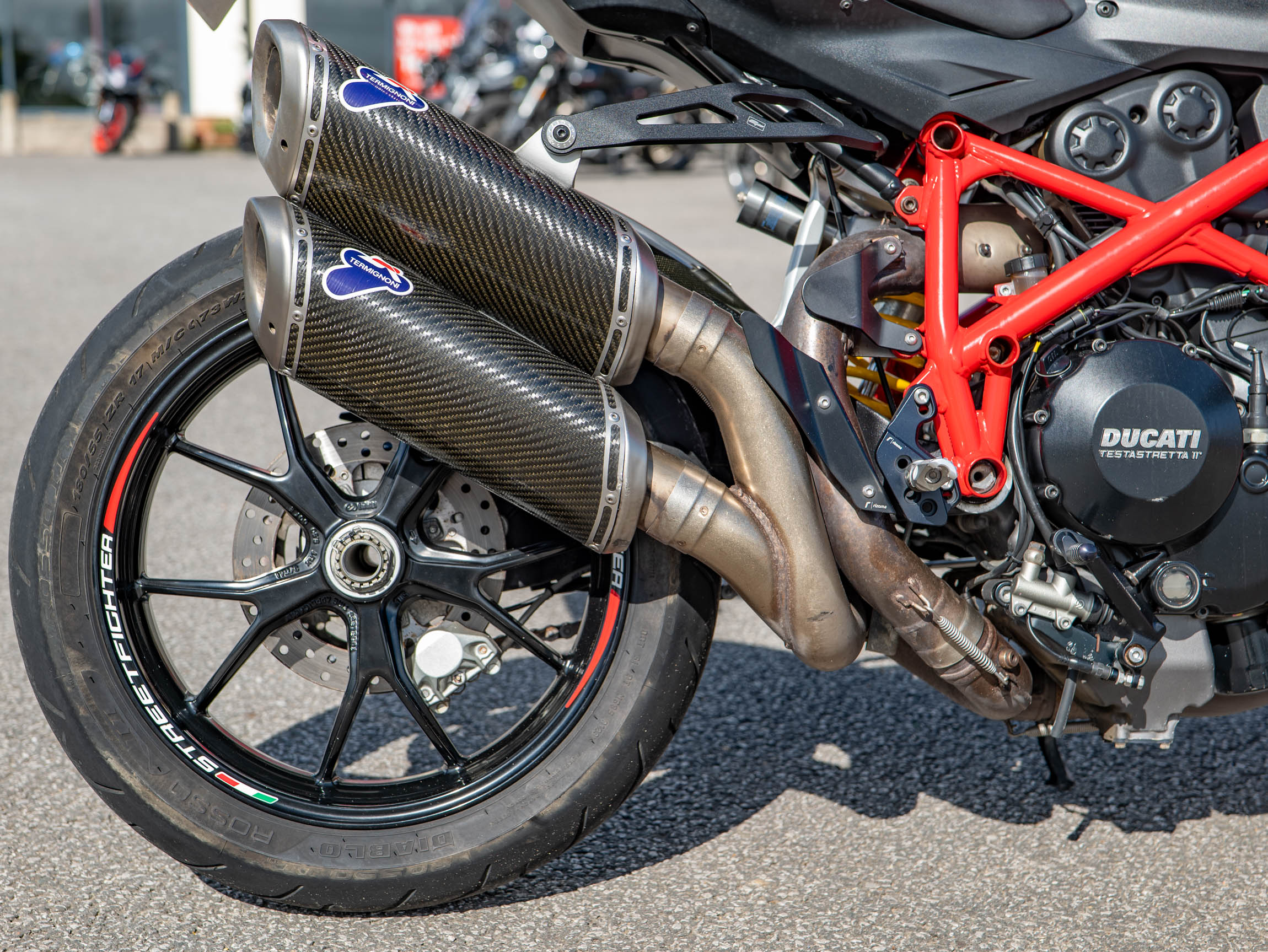 This is an exceptional example of a 2012 Ducati Streetfighter 848, a true naked-bike hooligan in a classic Ducati Red finish. With just 11,380 miles on the clock, this bike has been meticulously cared for, boasting an impressive 8-stamp service history. This Streetfighter 848 has a great history with us, having been sold by our dealership to its previous owner, a testament to its quality and reliability. At its core is the potent 849cc Testastretta 11° engine, which provides a thrilling 132 hp, delivering a perfect balance of exhilarating performance and everyday usability. Its powerful, yet refined, engine note is perfectly complemented by the Termignoni carbon pipes, an iconic upgrade that gives it a deeper and more aggressive sound.