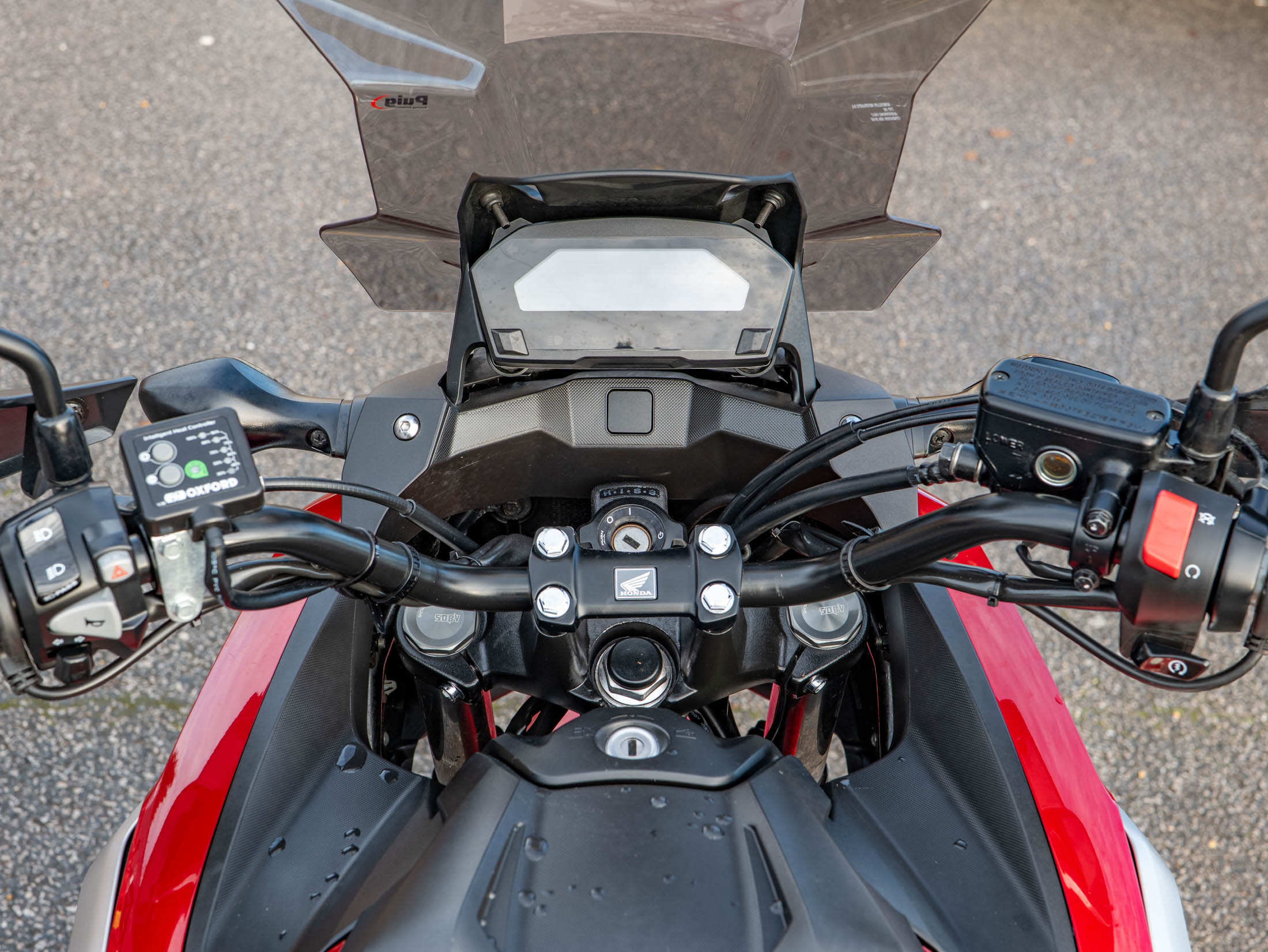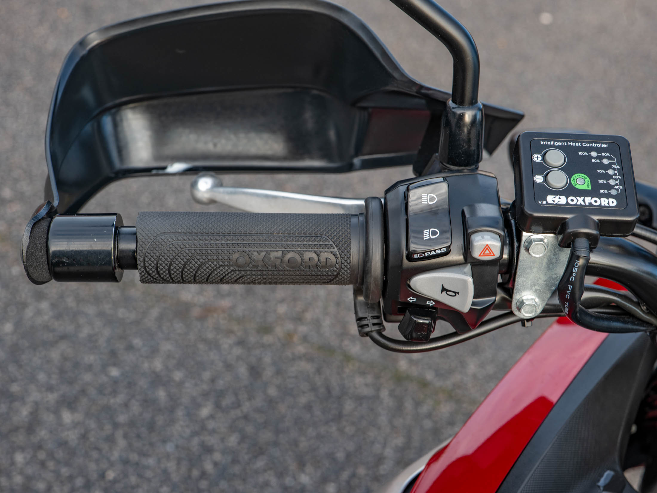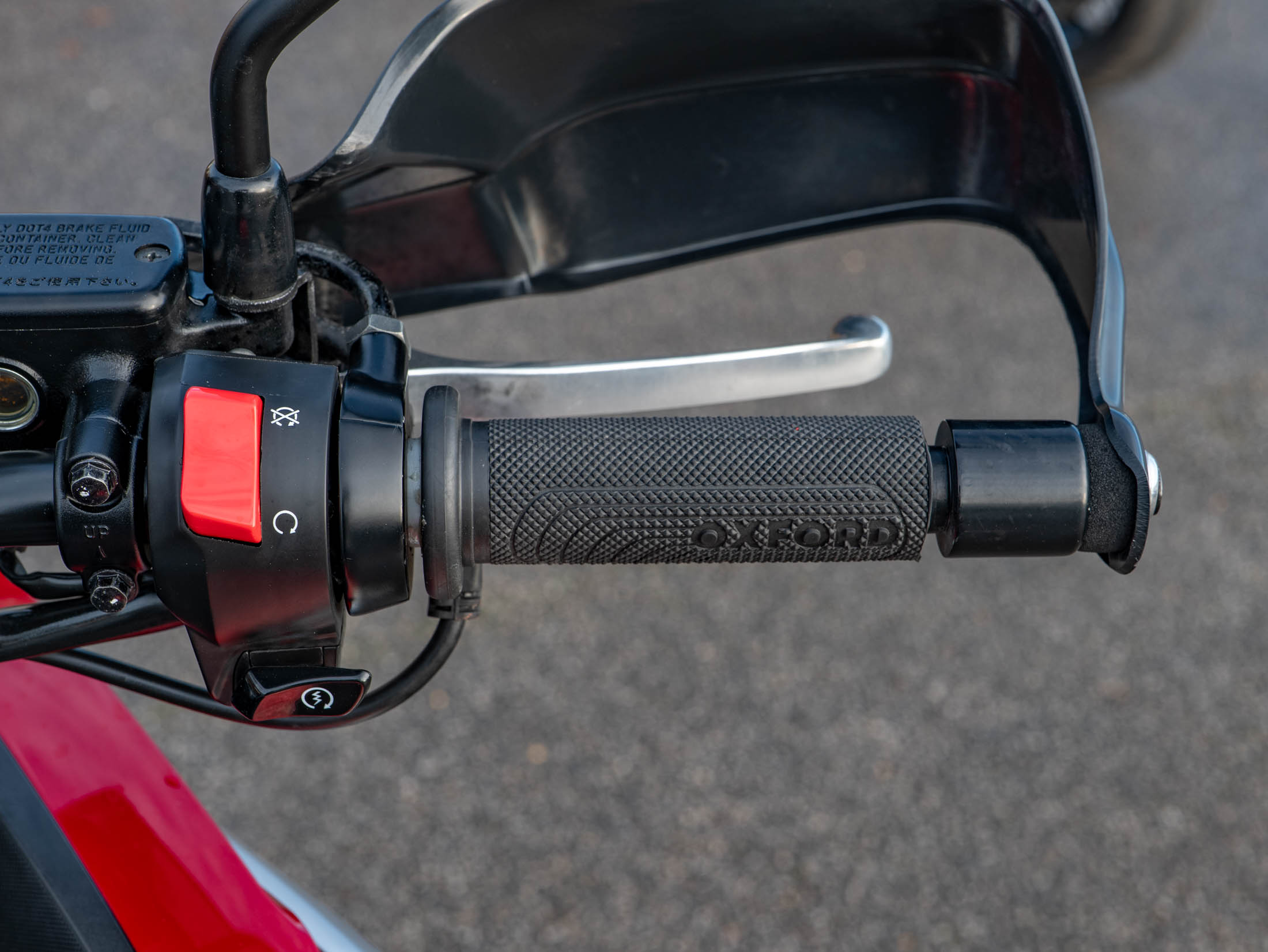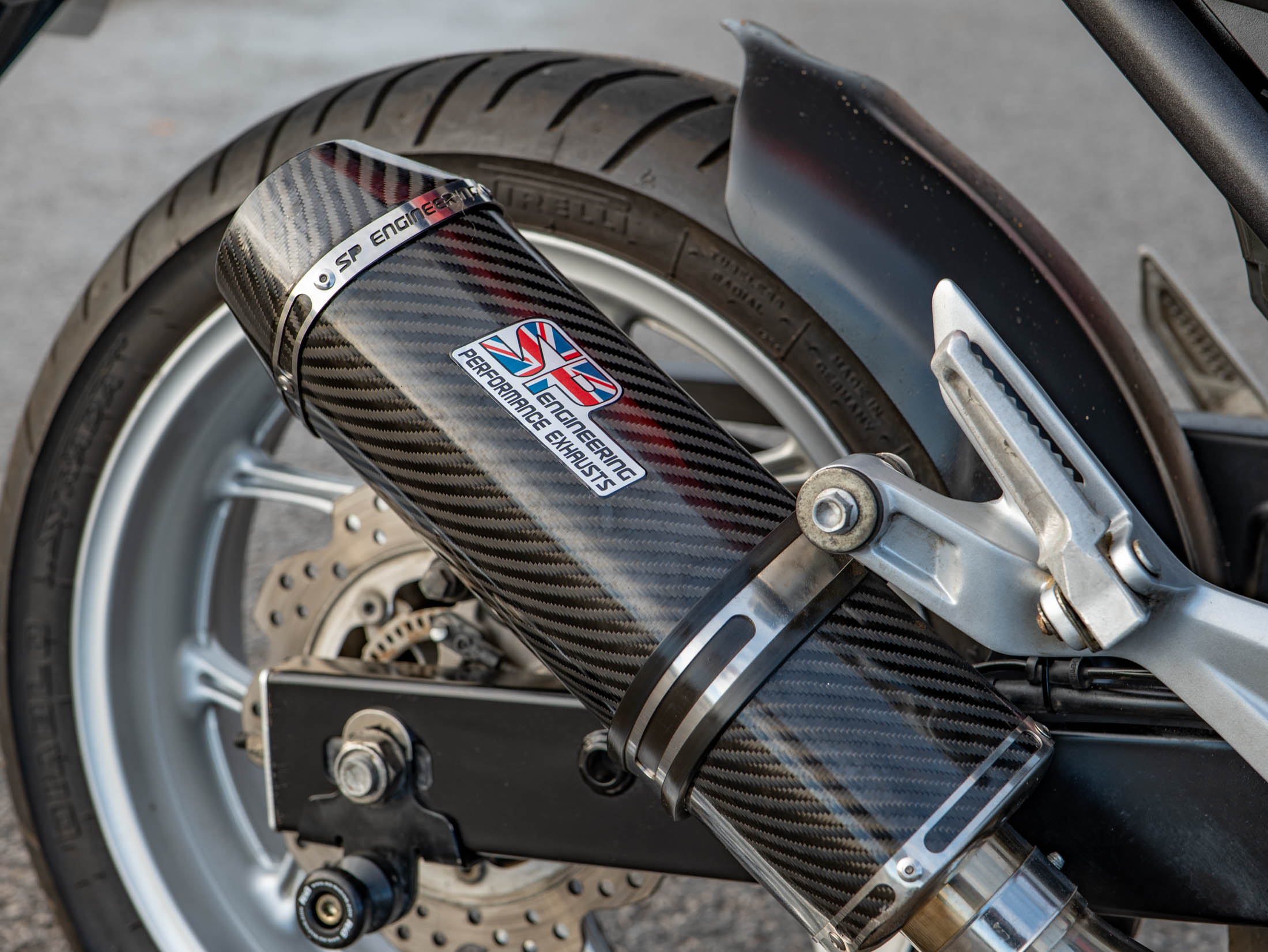 This particular machine has been thoughtfully upgraded for comfort and protection. It features sturdy Engine Bars (crash bars) to safeguard the engine, practical Hand Guards, and Oxford Heated Grips for all-season riding comfort. Performance and aesthetics are boosted by an SP Engineering Carbon Slip-On Exhaust (Performance Exhaust), which reduces weight and enhances the twin-cylinder sound. The bike is also fitted with a tinted Vario Screen, which uses an adjustable deflector to significantly reduce wind buffeting at speed. Completing the package are Paddock Stand Bobbins for easy maintenance.