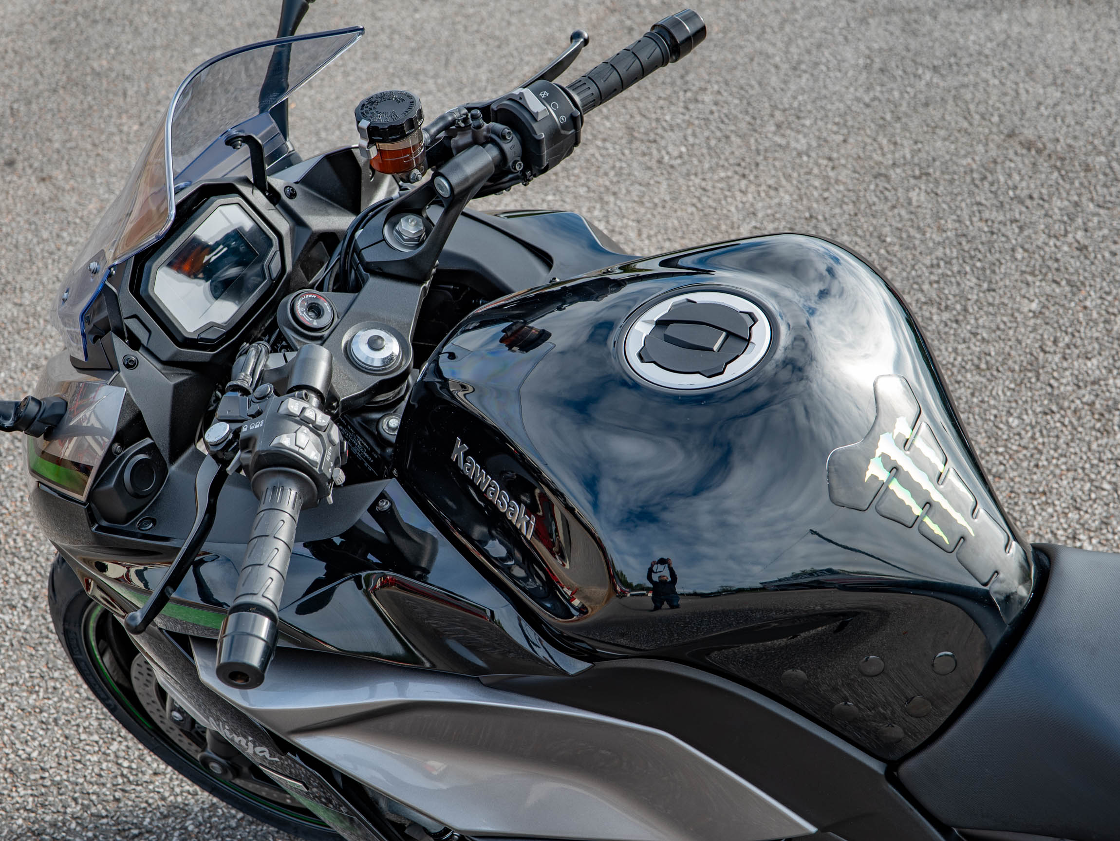 Further enhancing the safety and control of this high-performance machine are the integrated electronic aids, managed via a Bosch IMU. These features include Kawasaki’s Intelligent Anti-lock Braking System (KIBS) for lean-sensitive ABS and sophisticated Traction Control (KTRC), which work together to ensure optimal stability and grip in varying conditions. All rider information is displayed clearly on the new, full-colour TFT instrumentation, which also offers smartphone connectivity via the Rideology The App. The comfort level is excellent for a bike with such sporty handling, featuring an adjustable windscreen and the ergonomic riding position that defines the Ninja SX. This particular model also comes equipped with a Tank Pad, adding protection to the fuel tank’s finish. This is a chance to acquire a meticulously maintained, one-owner flagship sports tourer, ready for serious distance riding.