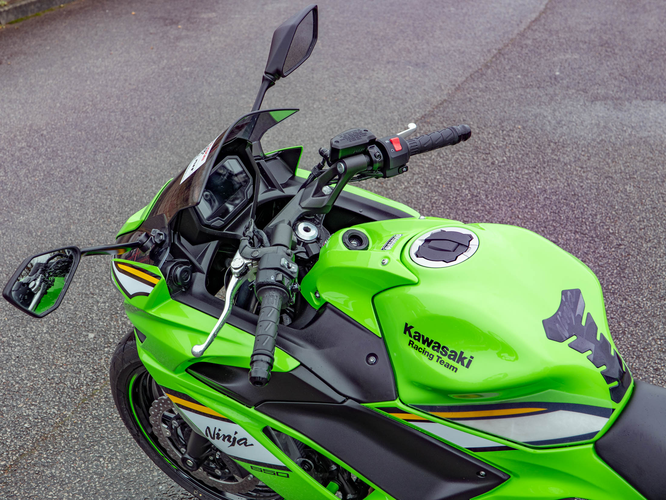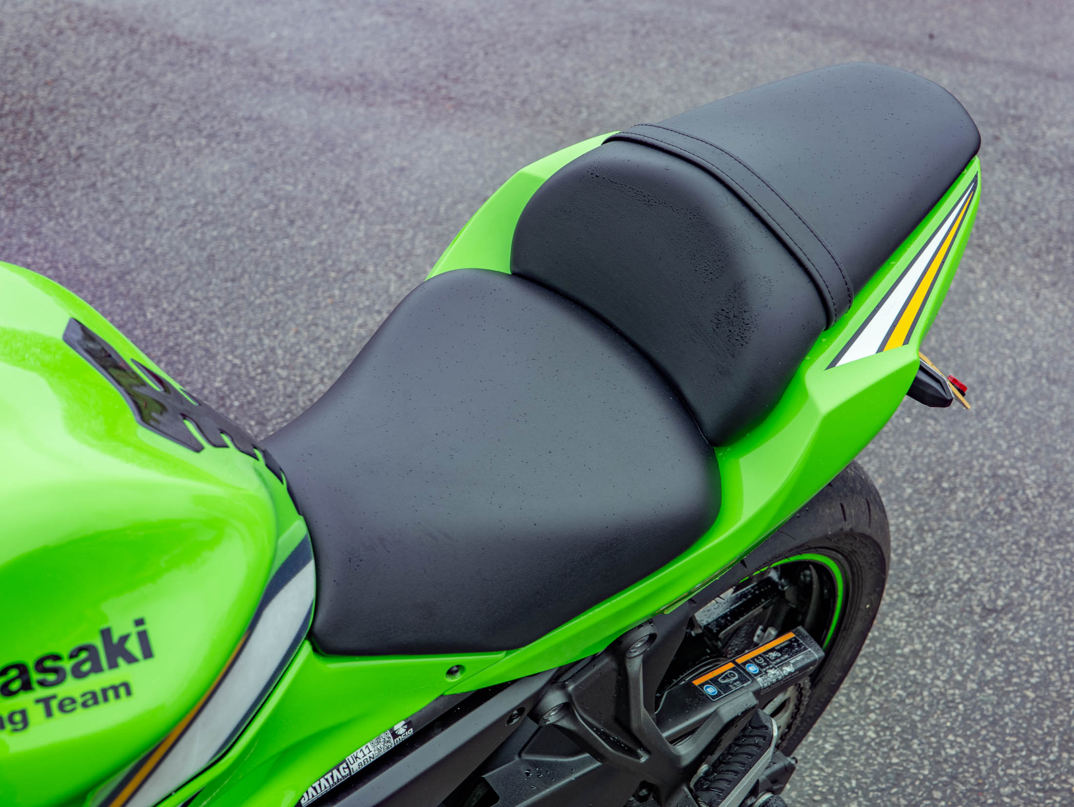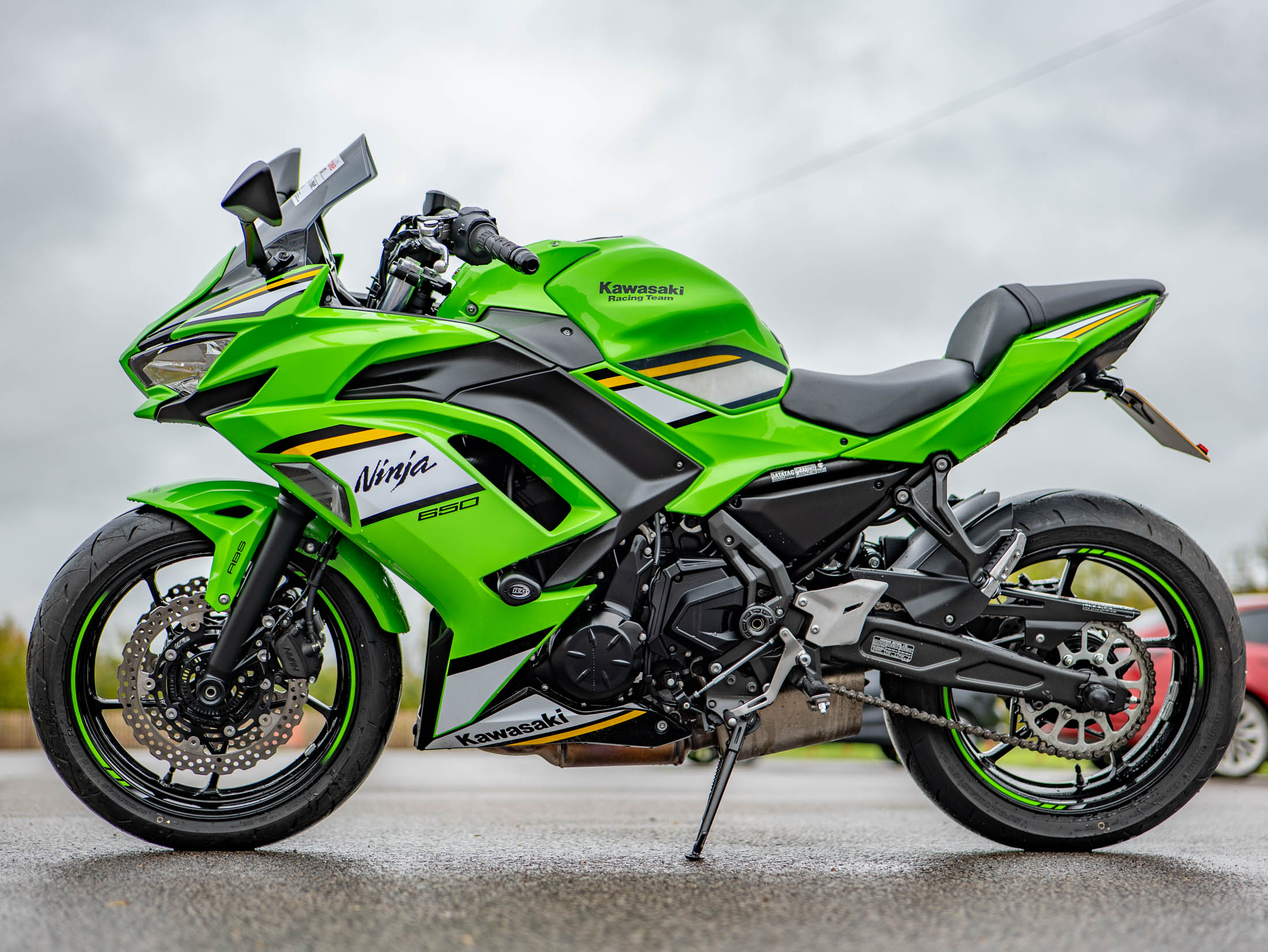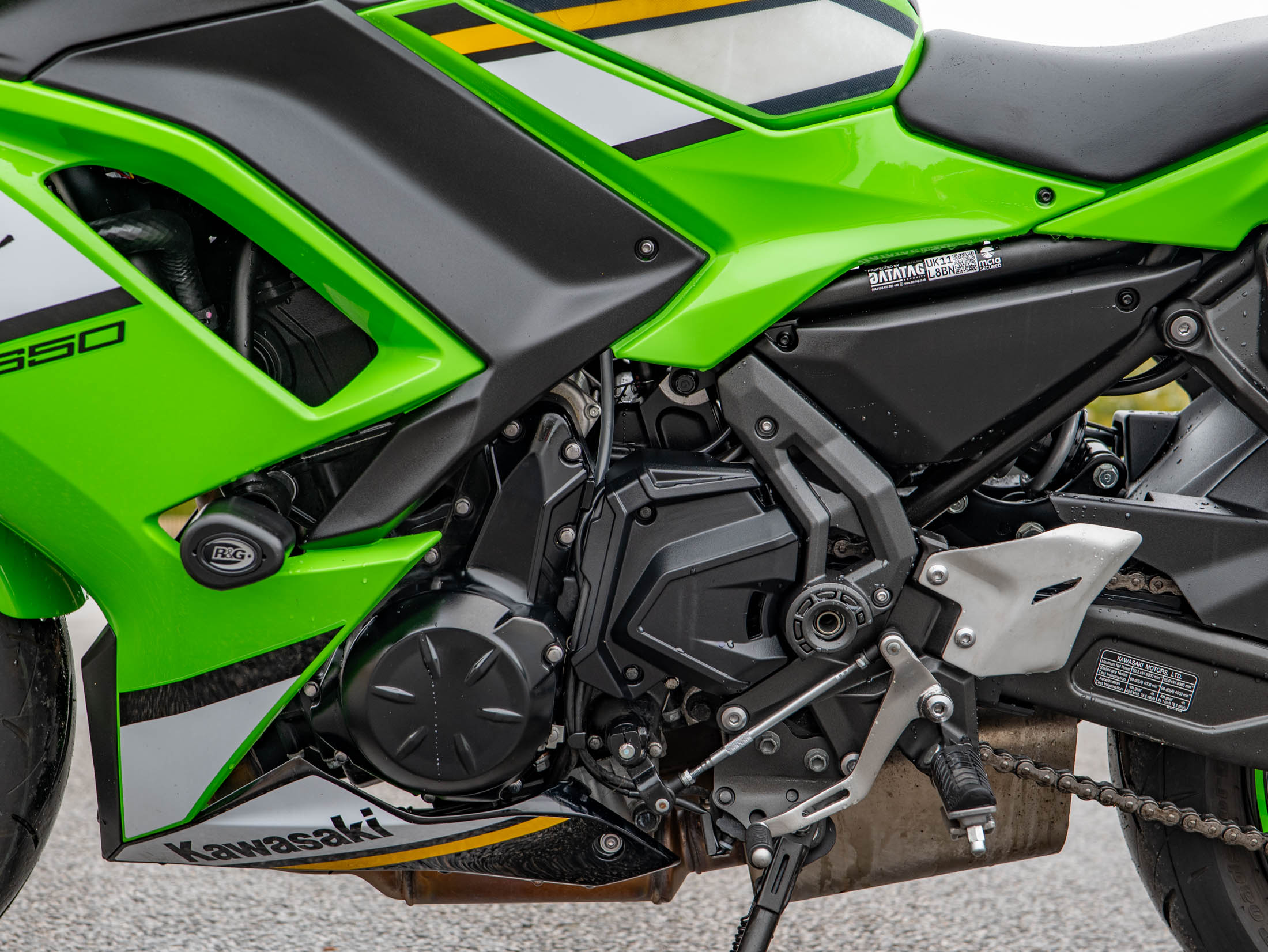 This example is fitted with key, high-quality protective and styling accessories: R&G Crash Bungs provide essential protection for the fairings and engine casing in the event of a drop; a Tail Tidy cleans up the rear end for a sharper, more focused aesthetic, and a Tank Pad protects the beautiful Green paintwork from jacket and zip abrasions.