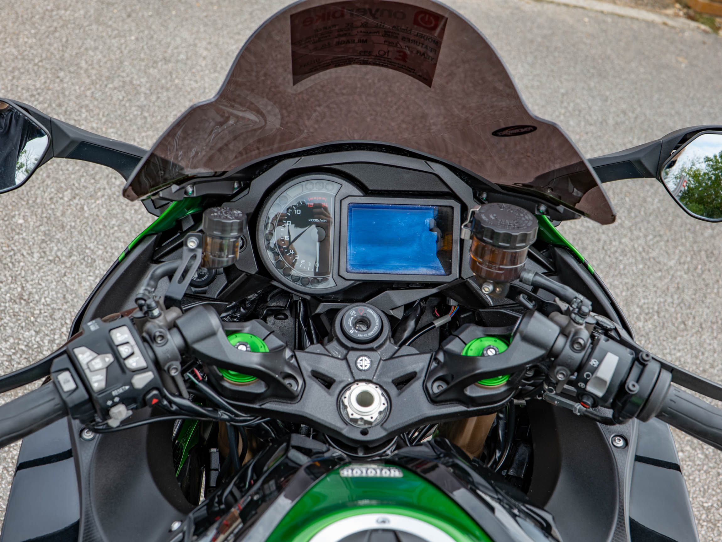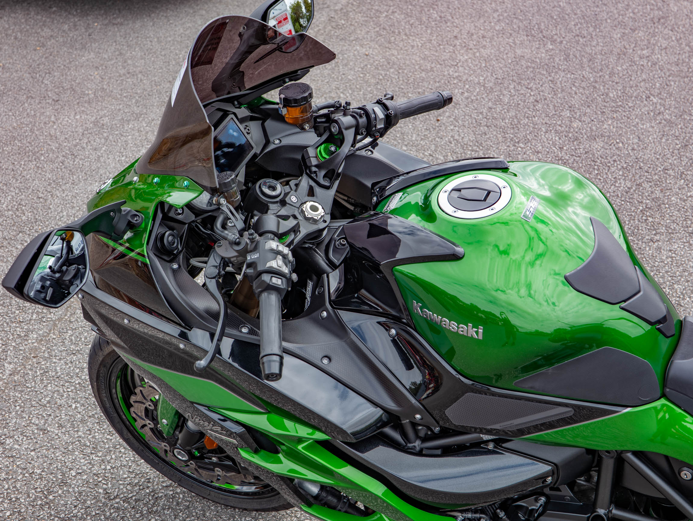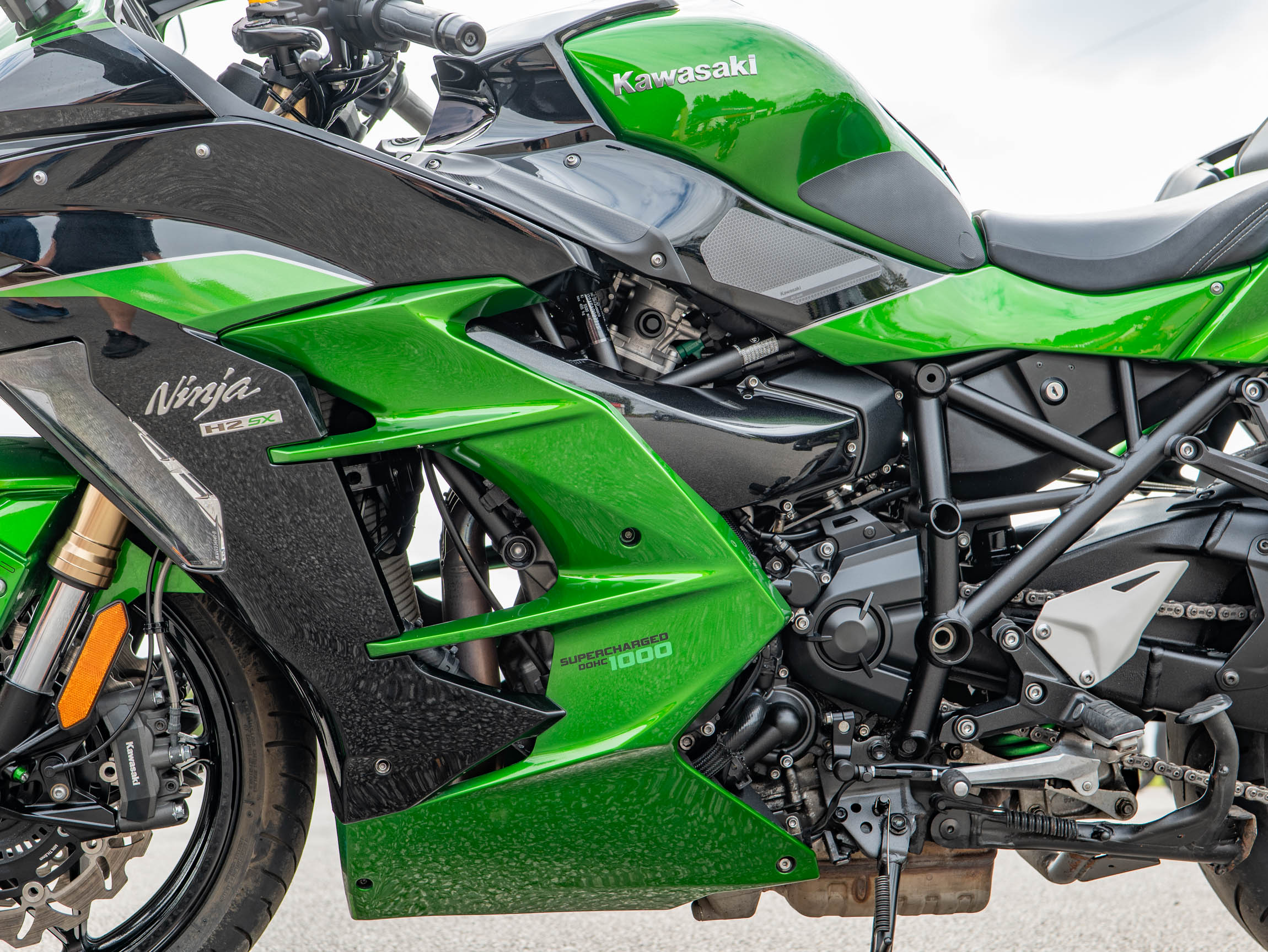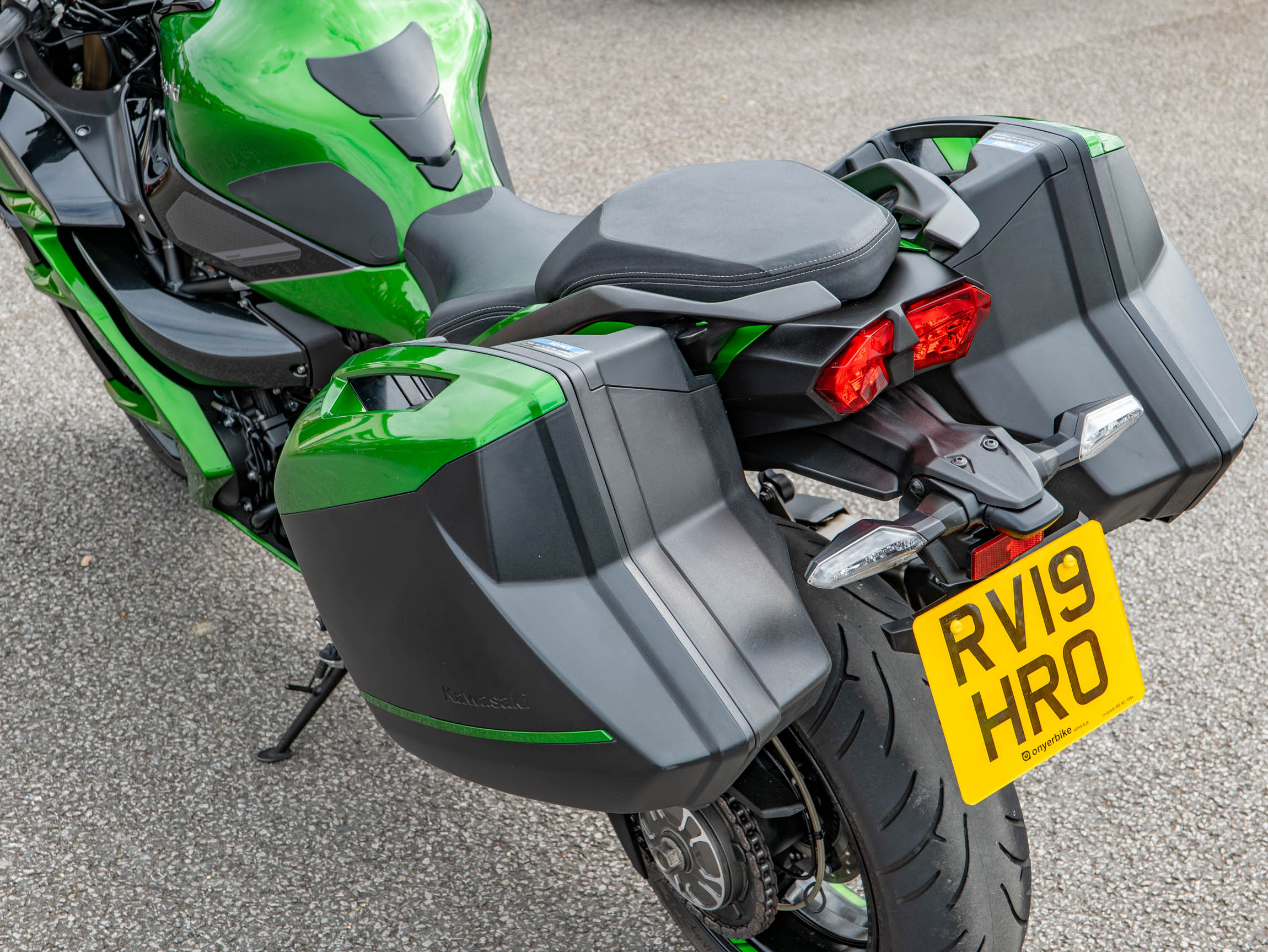 As the highest-spec "SE Tourer" model, this H2 SX is fully equipped for long-distance comfort and advanced performance. It features the incredible KECS (Kawasaki Electronic Control Suspension), which automatically adjusts to deliver a perfect balance of ride quality and handling. Rider comfort is enhanced by heated grips and an adjustable windscreen (not explicitly mentioned but standard). This bike comes with a full touring setup, including genuine panniers and a convenient centre stand. Additional accessories include a dark screen, tank pad, and an integrated USB port for charging on the go.