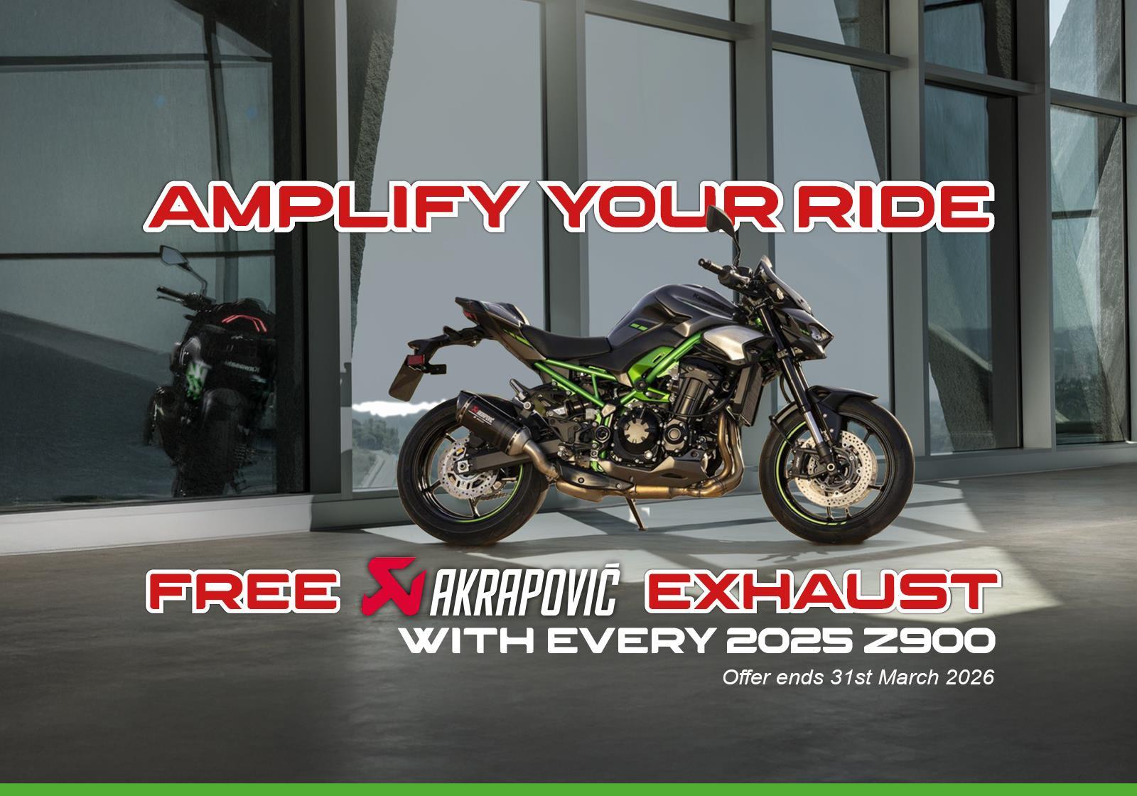 Unleash the raw power and aggressive style of the brand new Kawasaki Z900, presented in a dynamic Candy Lime Green with striking Metallic Spark Black accents. This iconic naked supernaked machine is ready to deliver an exhilarating and commanding riding experience. Now available with a FREE Akrapovic Upgrade.