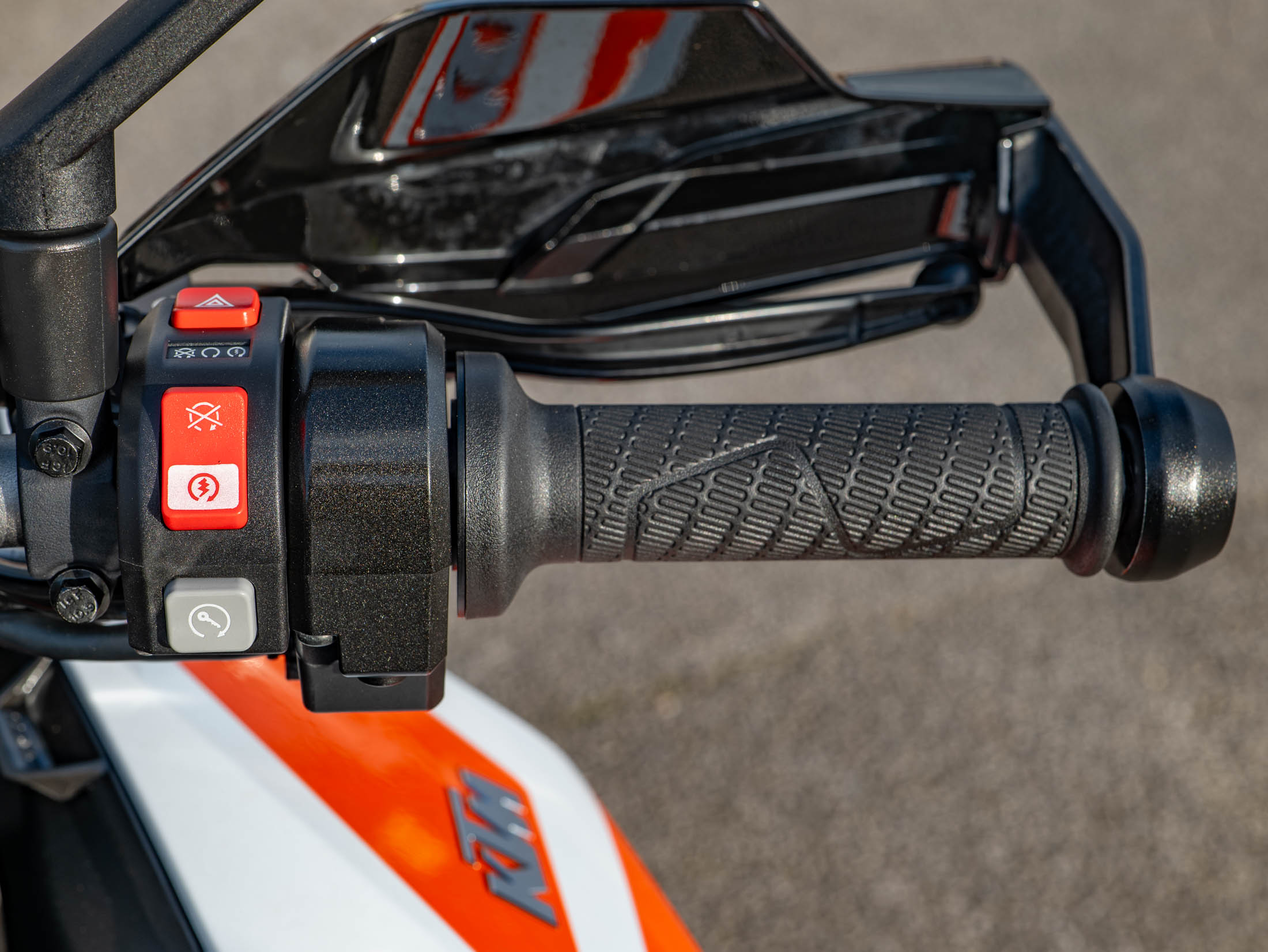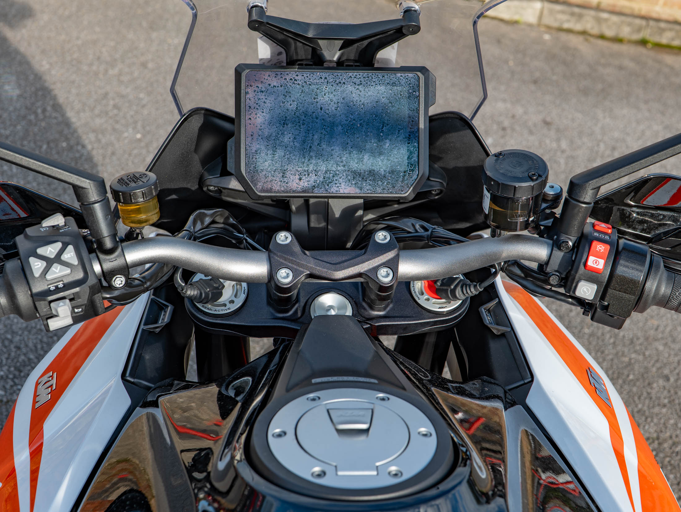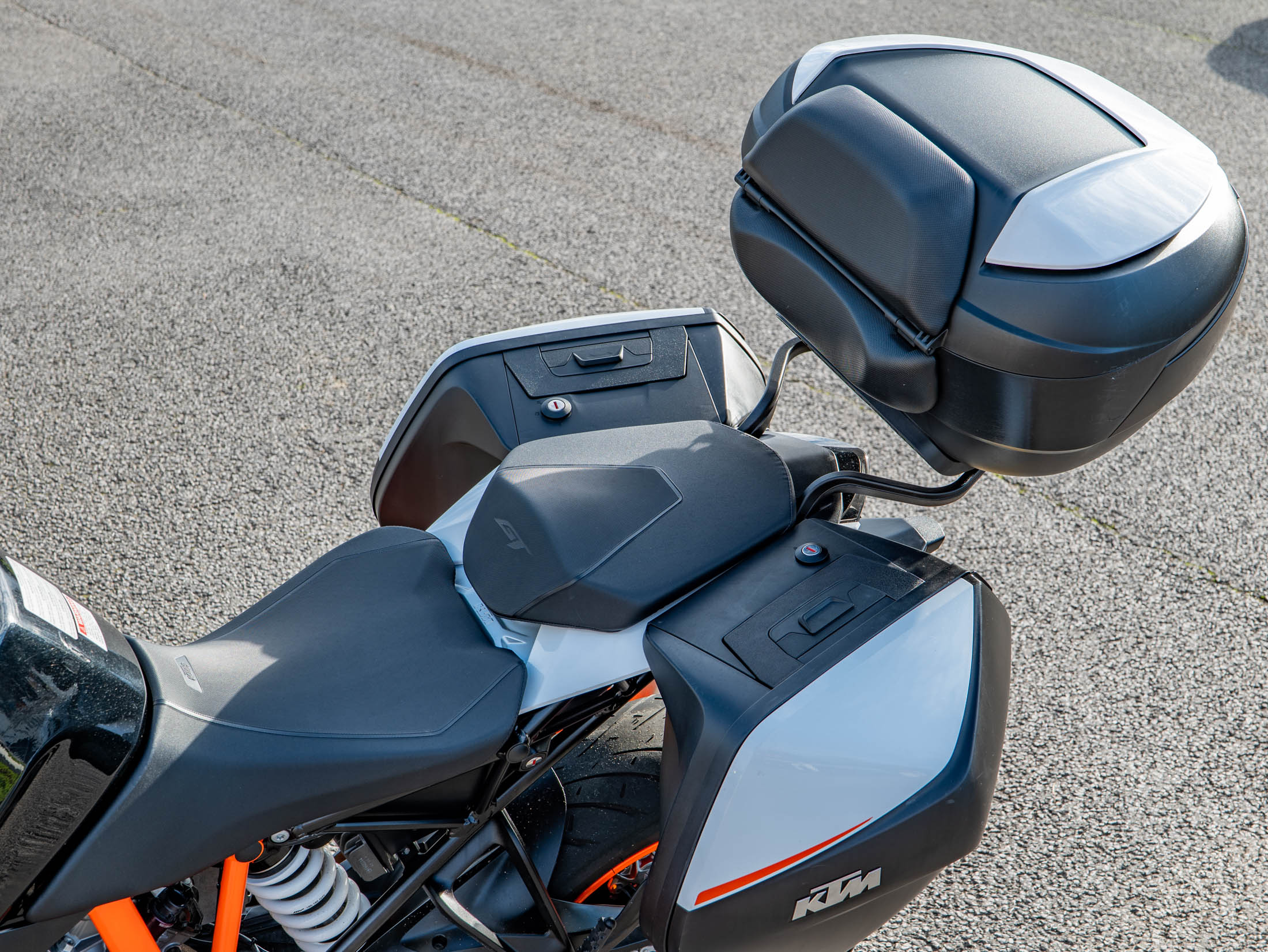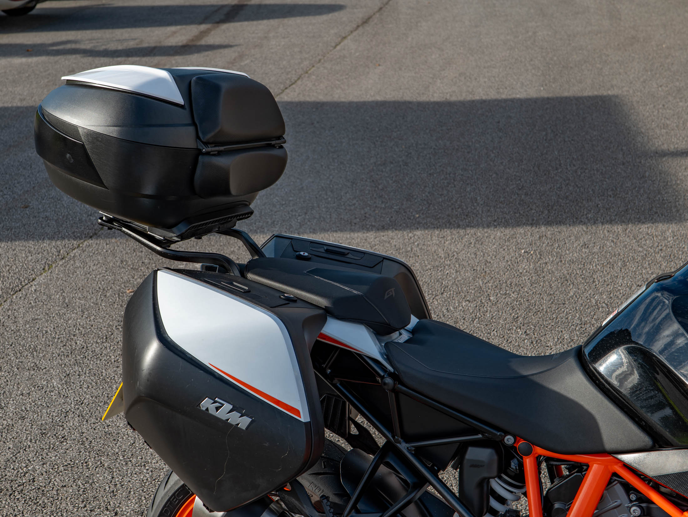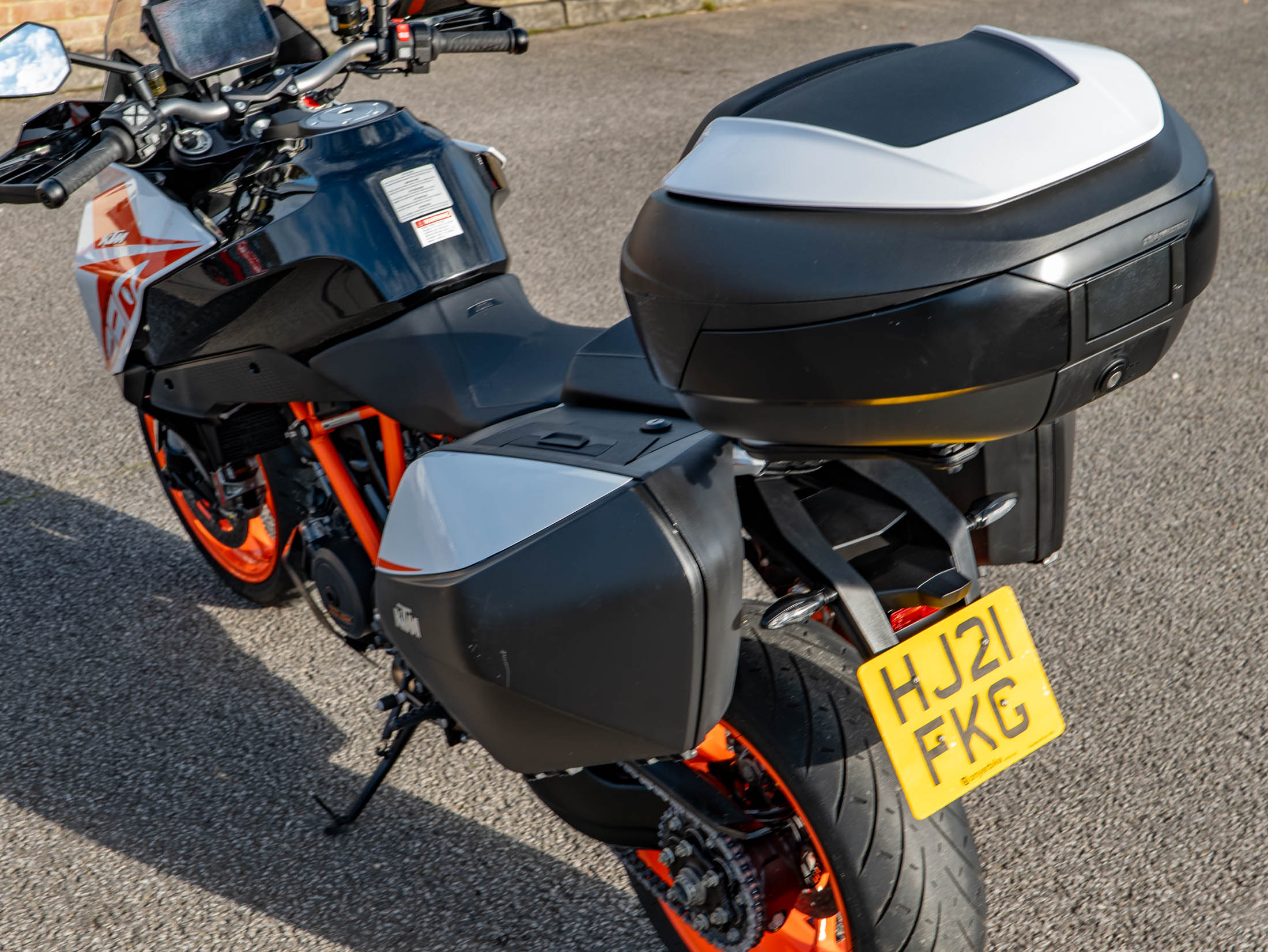 This machine is fully equipped for serious touring, fitted with the full KTM luggage package, including factory Panniers and a matching Top Box, offering extensive storage capacity. Essential modern touring features include Hand guards for weather protection, advanced Traction Control (MTC), cornering ABS, and the convenience of Keyless Ride. The Super Duke GT is renowned for its electronic features, dynamic handling, and comfortable riding position, making it a true performance-oriented mile-muncher.