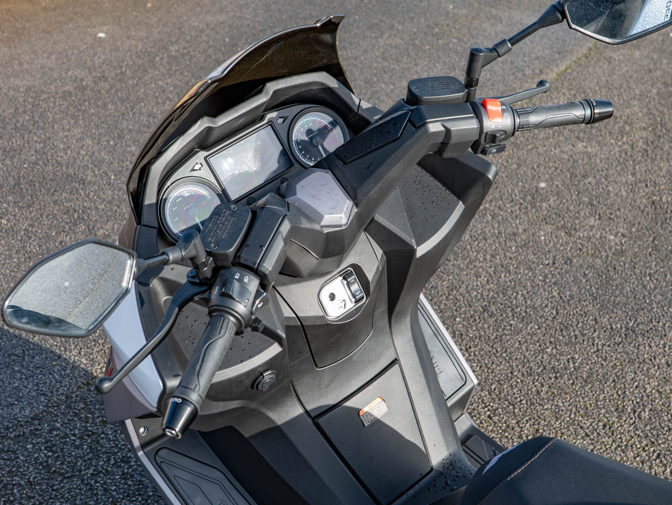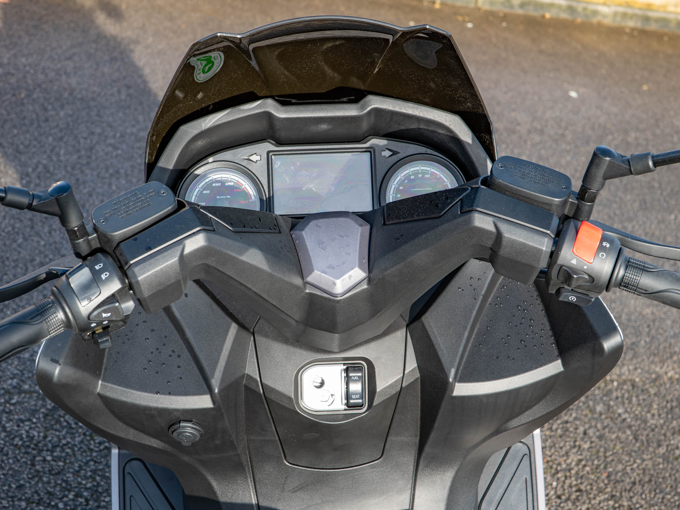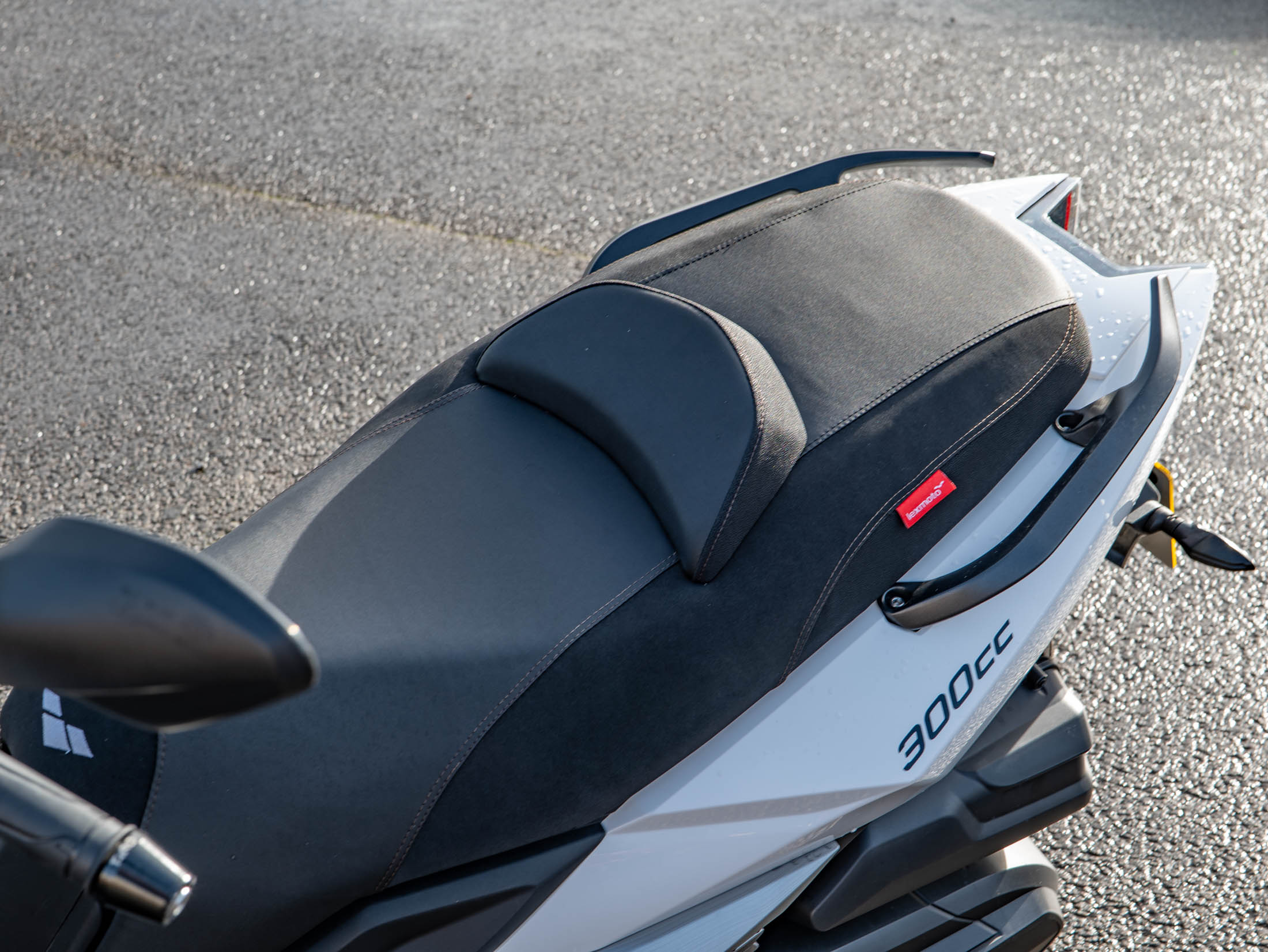 Practicality is where the Pegasus 300 truly shines for the modern-day rider. It features a generous under-seat storage compartment capable of holding a helmet, alongside a 12V charging socket to keep your devices powered on the move. The cockpit is dominated by a large, clear digital display that provides all essential trip information at a glance. Safety is well-managed by a combined ABS braking system, featuring dual front discs and a single rear disc for consistent stopping power in various weather conditions. The large seat and spacious footboards provide a comfortable riding position for both rider and passenger, making it a serious machine for those who prioritise comfort and value.