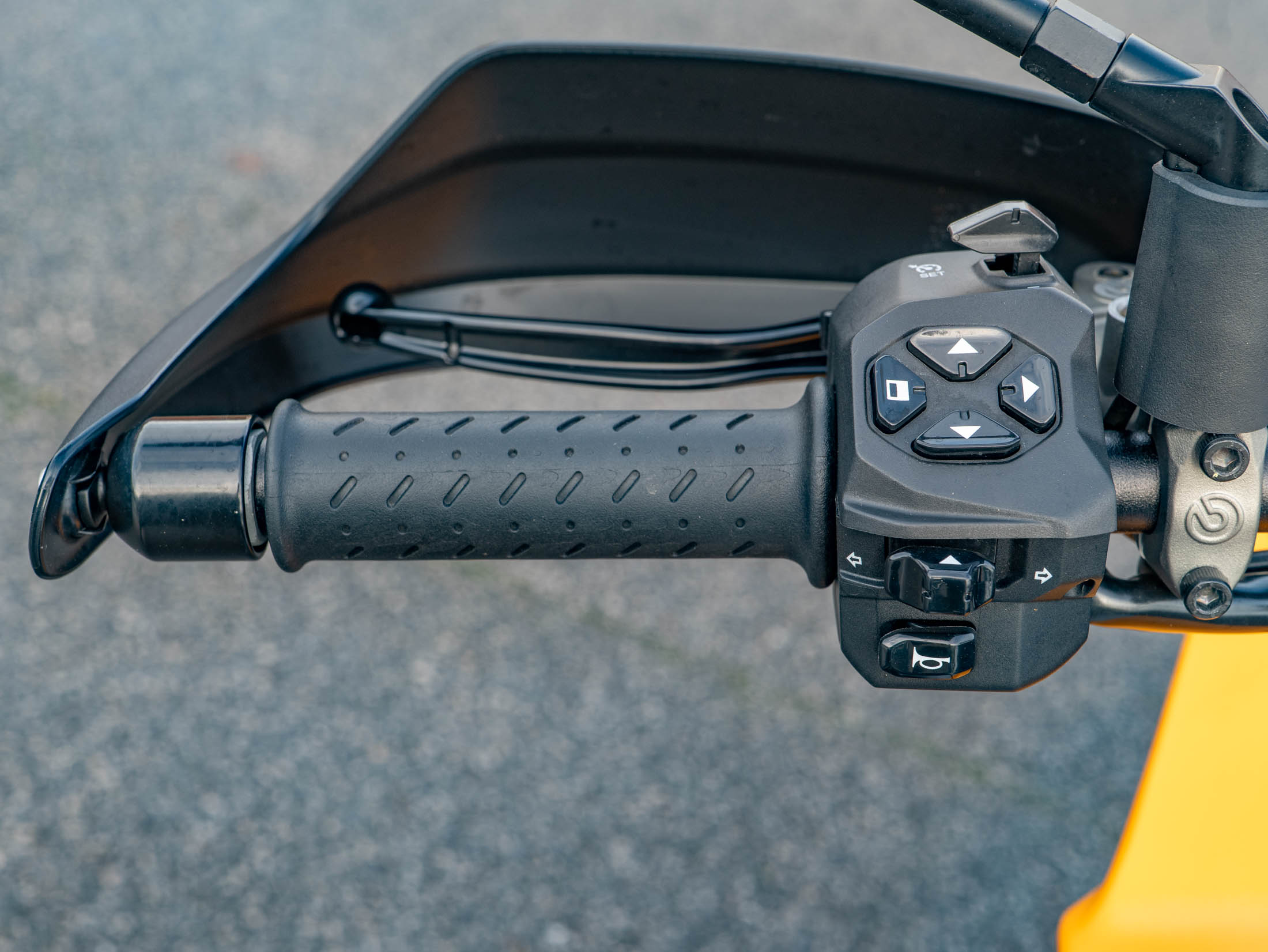 The key feature of this model is the factory-fitted PFF (Piaggio Fast Forward) Advanced Rider Assistance Solution, which uses 4D Imaging Radar technology. This system includes the safety-critical functions listed: Blind Spot Detection (BLIS), Lane Change Assist (LCA), and Forward Collision Warning (FCW). The bike also includes Cruise Control (and is ready for Following Cruise Control/Adaptive Cruise Control functionality), Cornering ABS, multi-level Traction Control (ATC), five selectable Riding Modes (Road, Sport, Touring, Rain, Off-Road), and an electrically adjustable windscreen for maximum touring comfort.