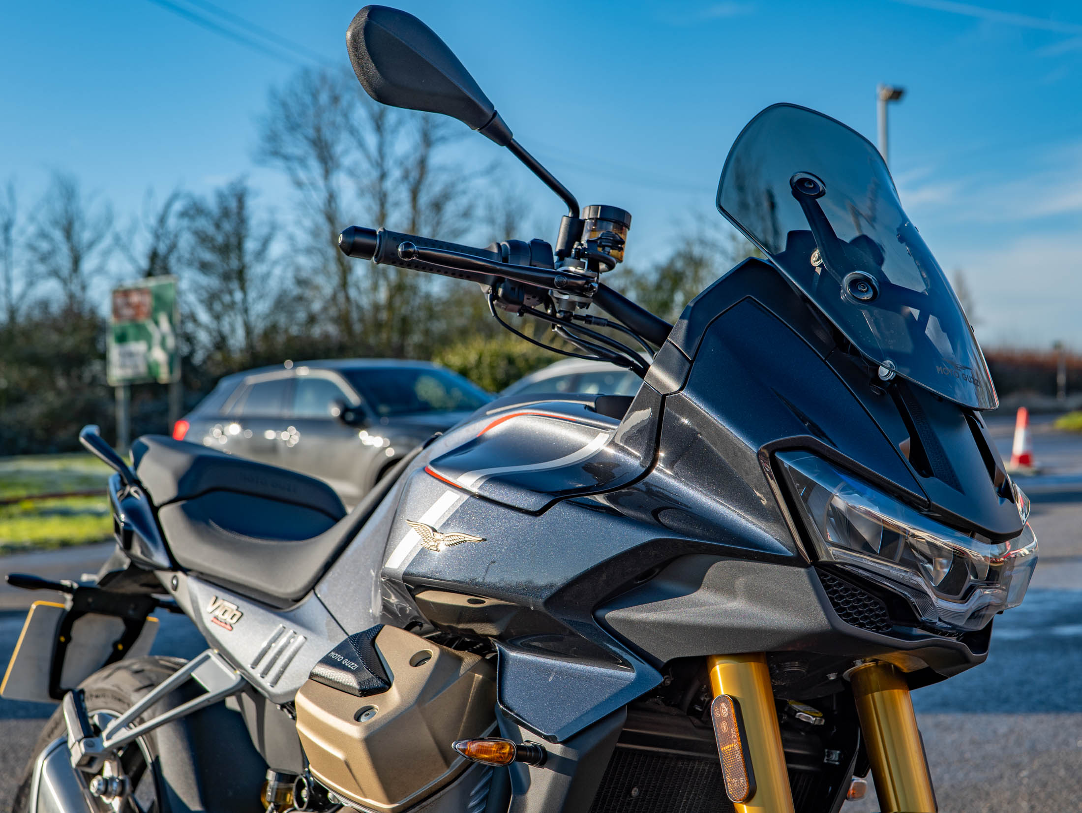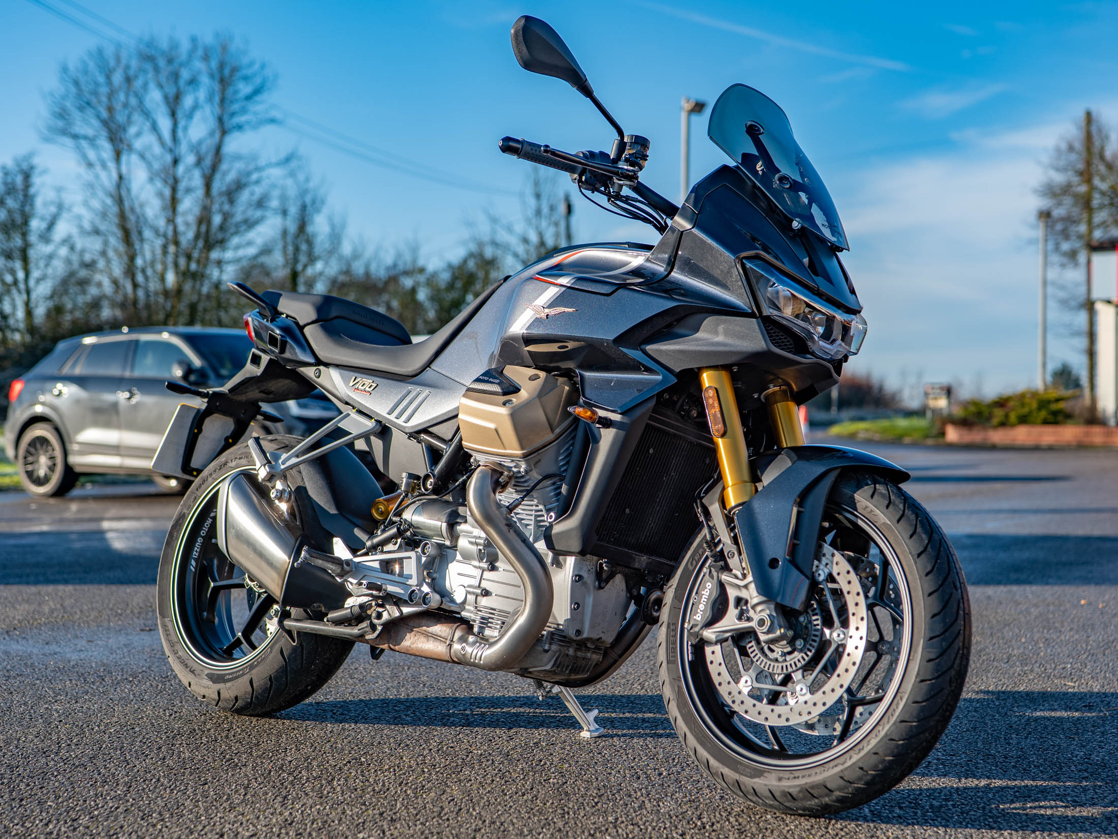 The 2024 Moto Guzzi V100 Mandello S in elegant Grigio Avanguardia (Grey) is a revolutionary sport-tourer that perfectly marries Italian heritage with futuristic technology. This 1-owner example has covered just 1,050 miles and is in superb, very good condition, complete with a Full Service History (FSH). Powering this machine is the innovative 1,042cc liquid-cooled "Compact Block" V-twin, delivering a robust 115 hp. Unique to the V100 is its adaptive aerodynamics—the world's first production motorcycle to feature active winglets on the fuel tank that adjust based on speed and riding mode to optimise rider comfort.