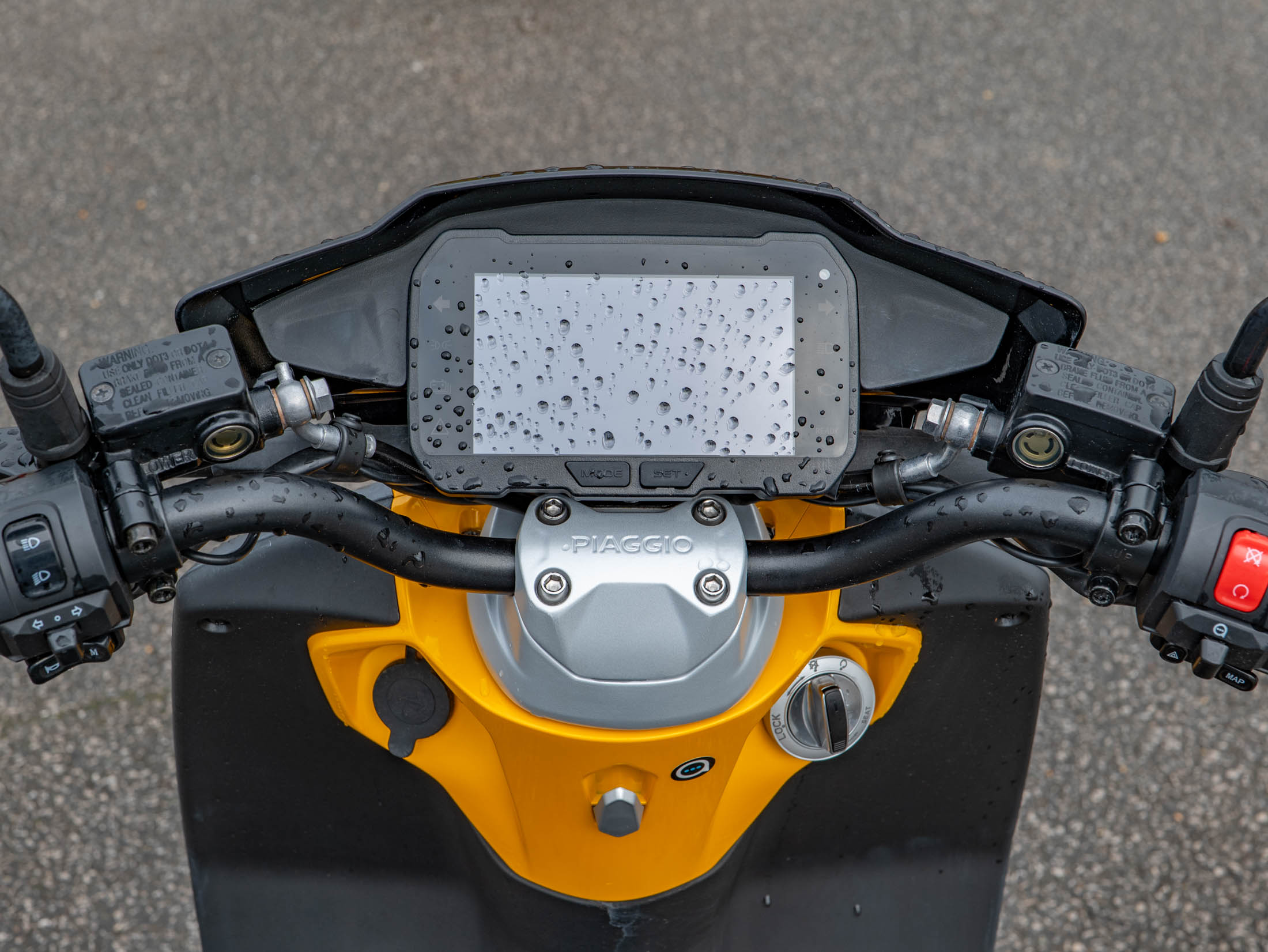 The practical design of the Piaggio 1 is centred around the needs of the modern commuter. It features a removable lithium-ion battery that can be easily carried indoors and charged at any standard domestic socket, eliminating the need for dedicated outdoor charging infrastructure. Despite the compact electric powertrain, Piaggio has cleverly designed the scooter to retain a genuine under-seat storage compartment. The cockpit is dominated by a large 5.5-inch digital colour display that is clear and easy to read in all lighting conditions, providing all essential information at a glance.
