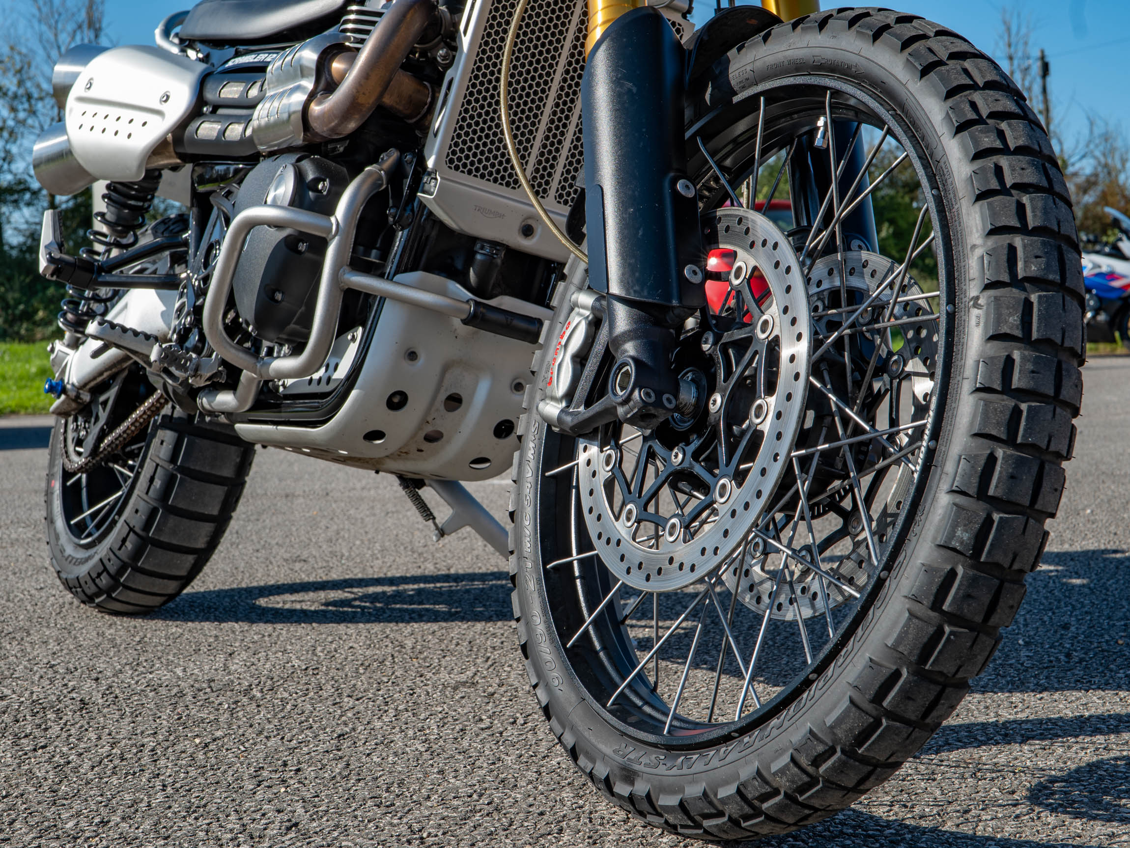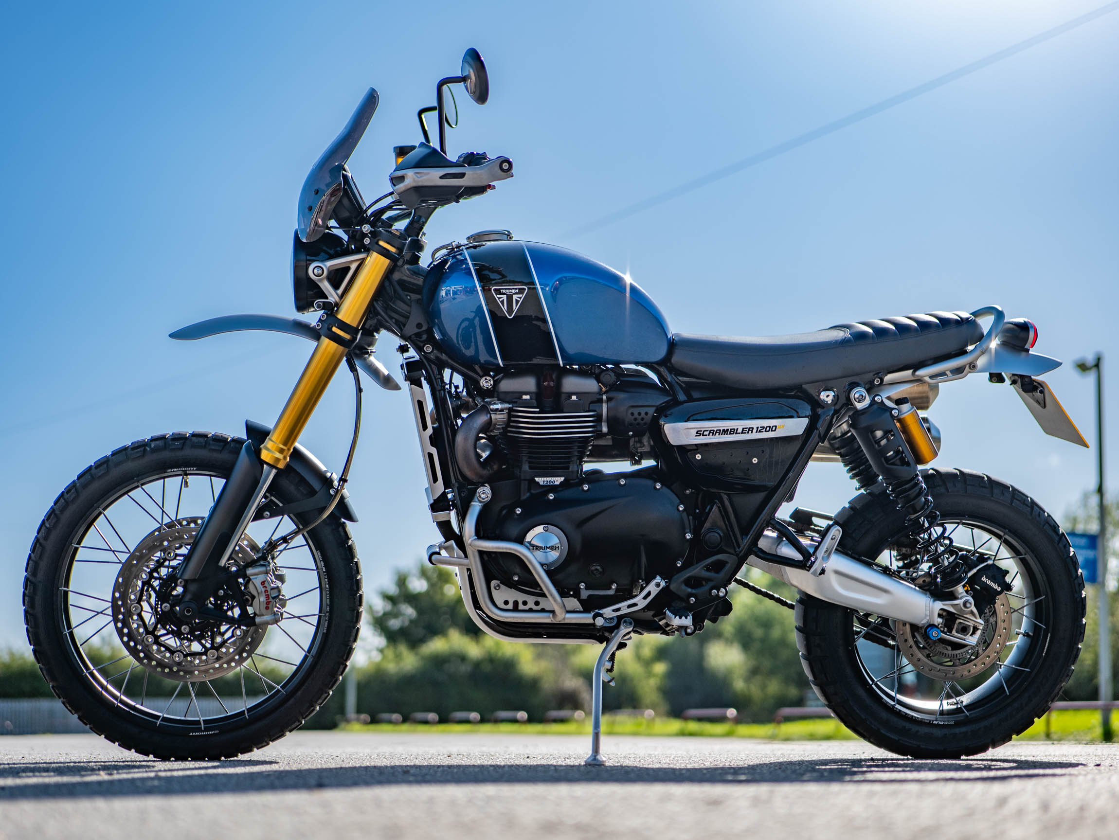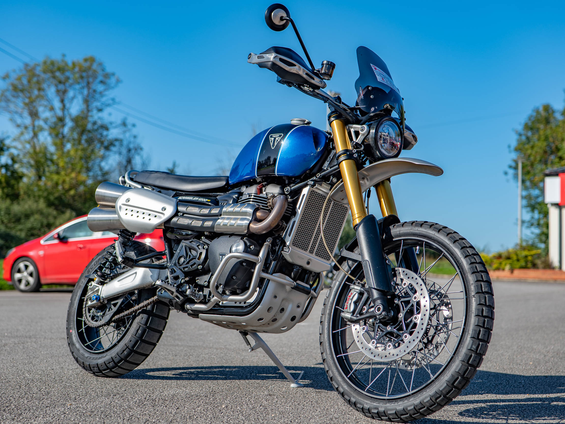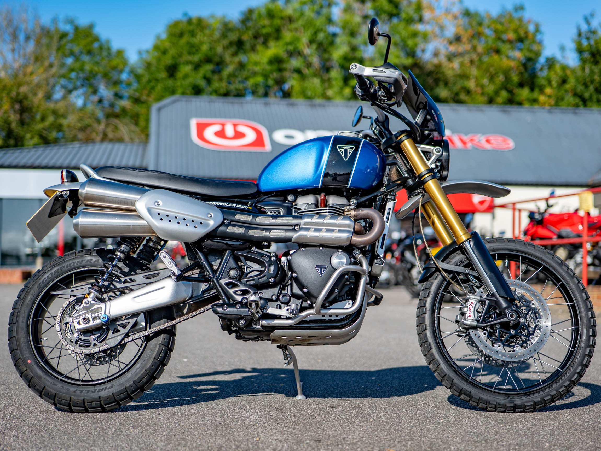 This is an exceptional 2019 Triumph Scrambler 1200 XE with 11,000 miles on the clock. The "XE" is the highest-specification model, built for serious off-road capability while still being a fantastic road bike. Its top-end components include long-travel Öhlins suspension and Brembo M50 monobloc... READ MORE